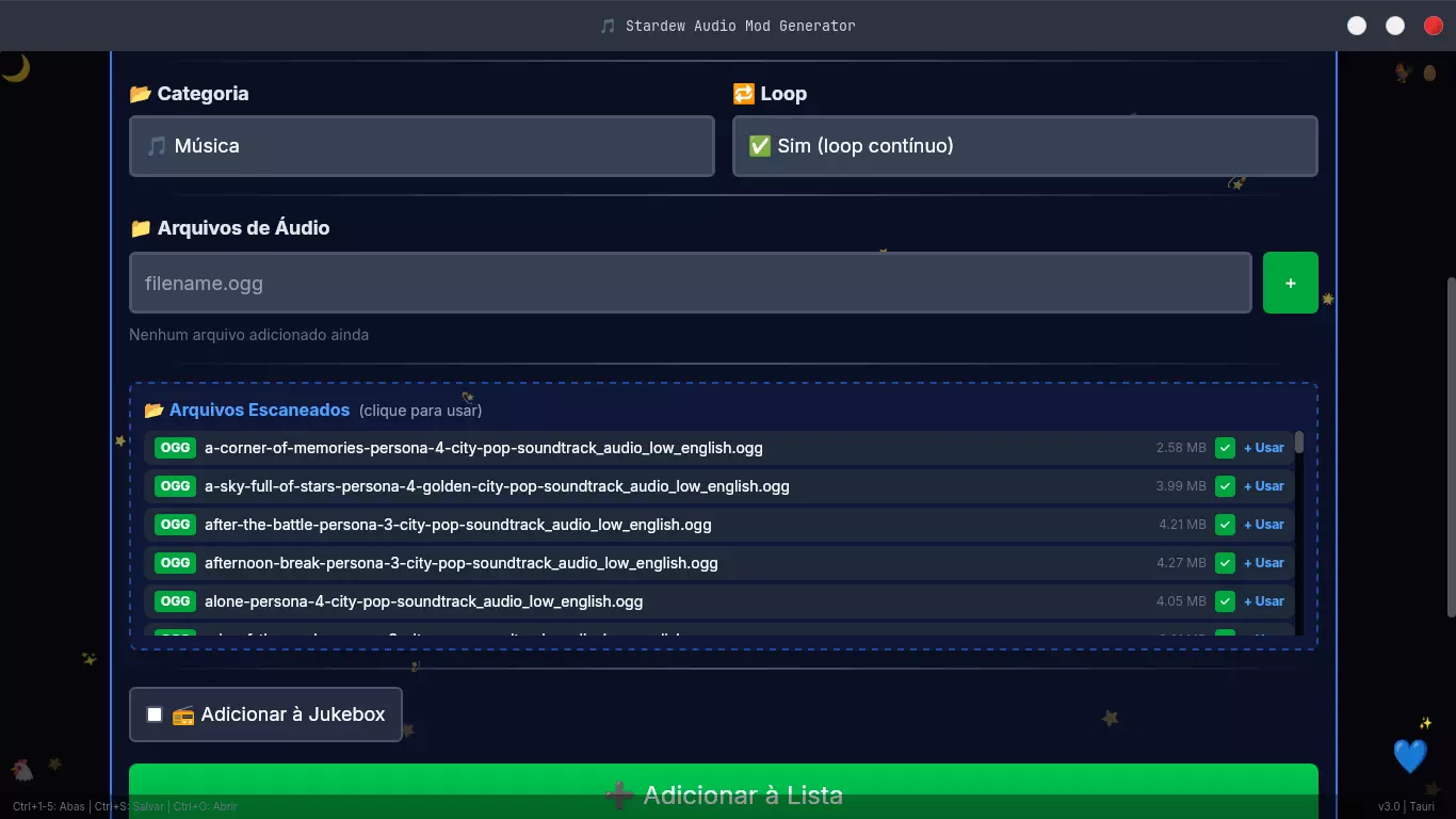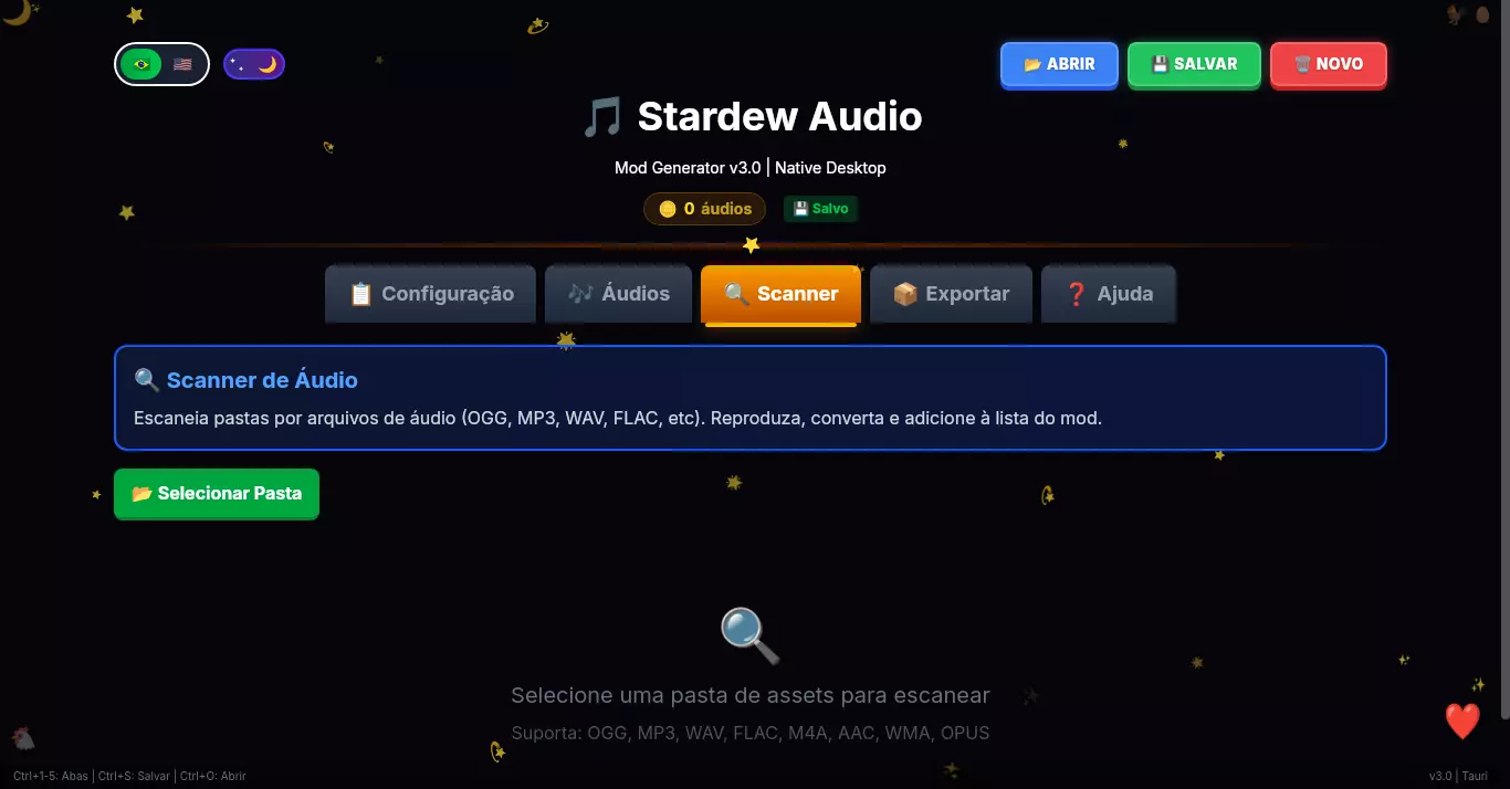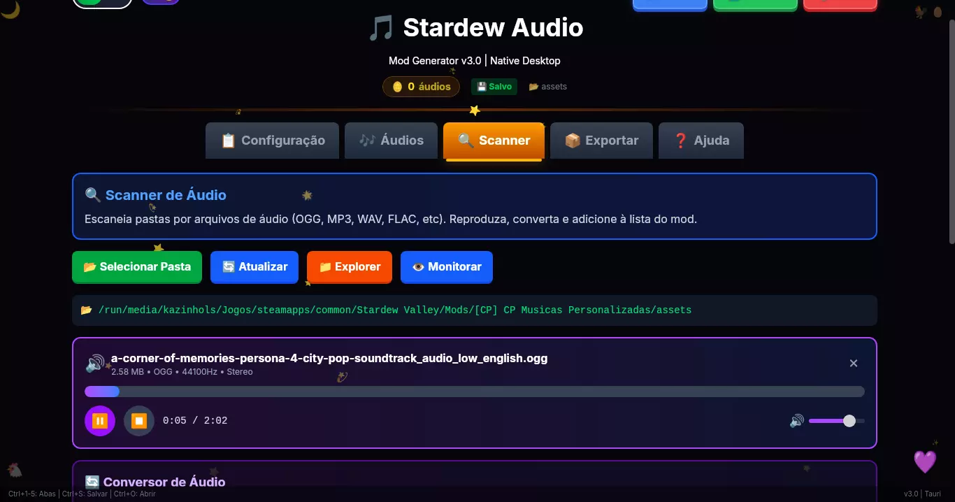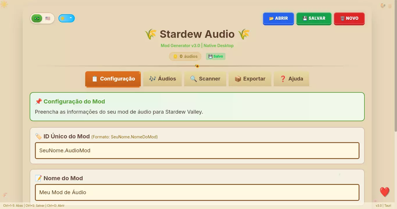 为《星露谷物语》1.6+版本创建音频模组的最简单方法。 一个功能齐全的可视化工具,具备错误扫描、转换器和现代化界面。告别手动编辑JSON文件! 1. 介绍与下载 星露谷物语音频模组生成器v3.0 使用Content Patcher为《星露谷物语》1.6+版本创建音频模组的最简单方法。 创建、验证和导出——全部在现代化且直观的界面中完成。无需再手动编辑JSON! 下载位置 平台 可下载文件 无(在线版) 访问网站 Windows x64-setup.exe Linux .AppImage、.deb或.rpm macOS universal.dmg 2. 功能特点 该工具能做什么?界面视觉:无需担心JSON语法错误,界面会引导你创建模组。 音频编辑器:轻松添加音频提示、创建分类和设置循环。 错误扫描器(桌面版):应用会检查你的.ogg或.wav文件是否为正确格式(采样率、编解码器),避免游戏崩溃。 播放器与转换器(桌面版):播放音频并使用FFmpeg将WAV转换为OGG。 导出功能:生成现成的manifest.json和content.json文件,或创建供你分发的ZIP文件。 云存档:可在网站开始编辑,在桌面版完成(反之亦然)。 语言支持:界面完全支持葡萄牙语(巴西)和英语。截图 查看应用实际效果 深色与浅色模式(灵感来源于《星露谷物语》)