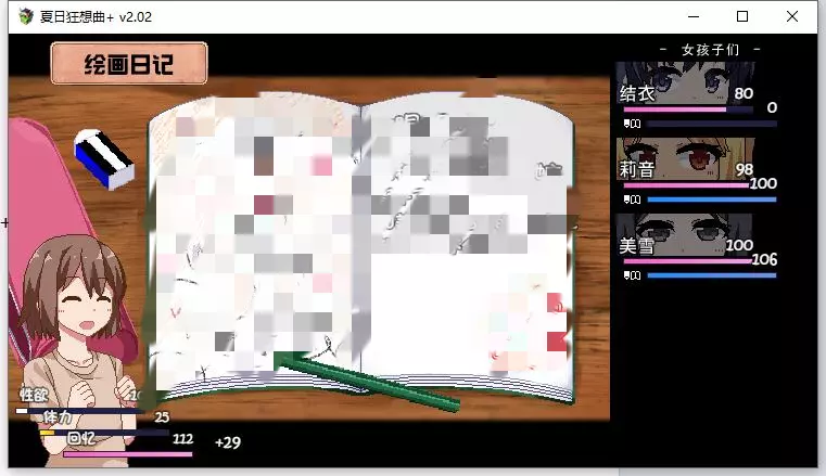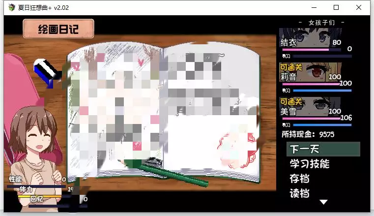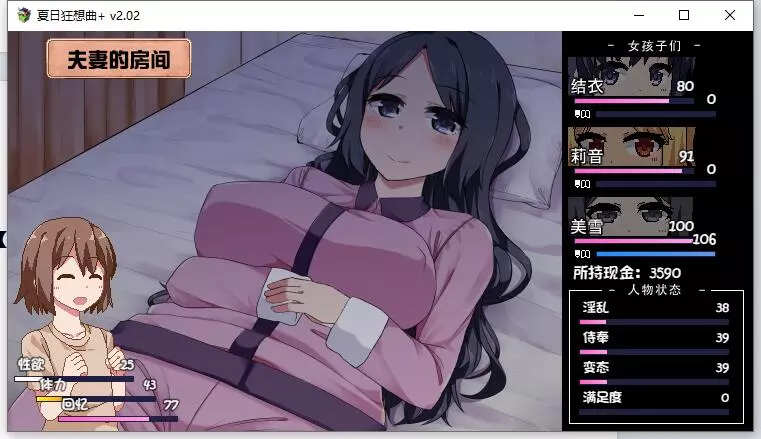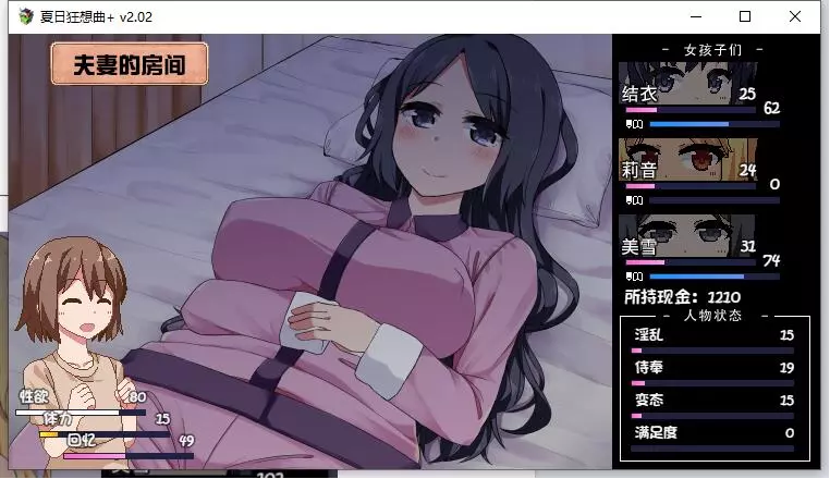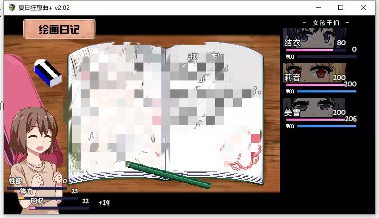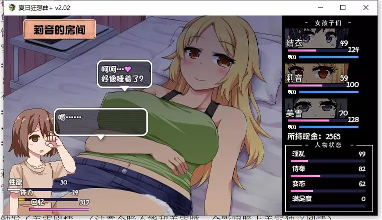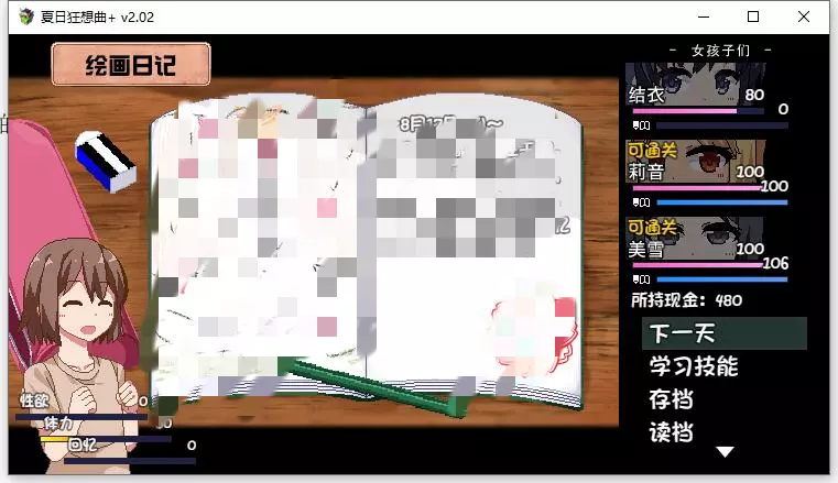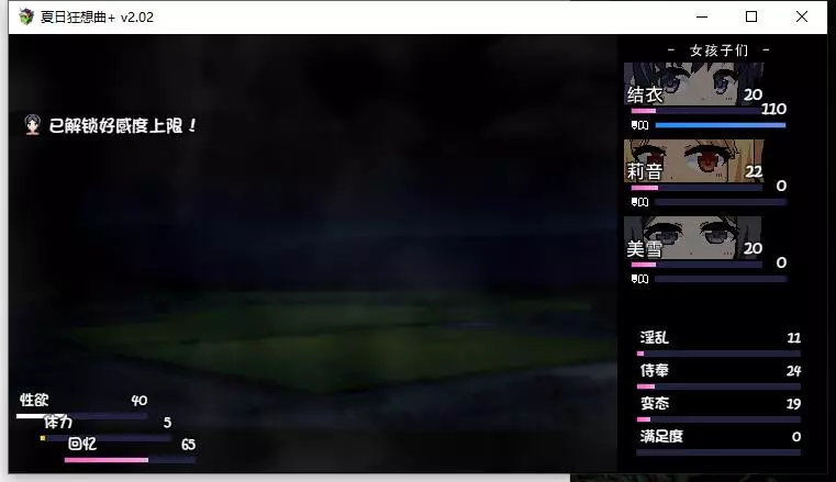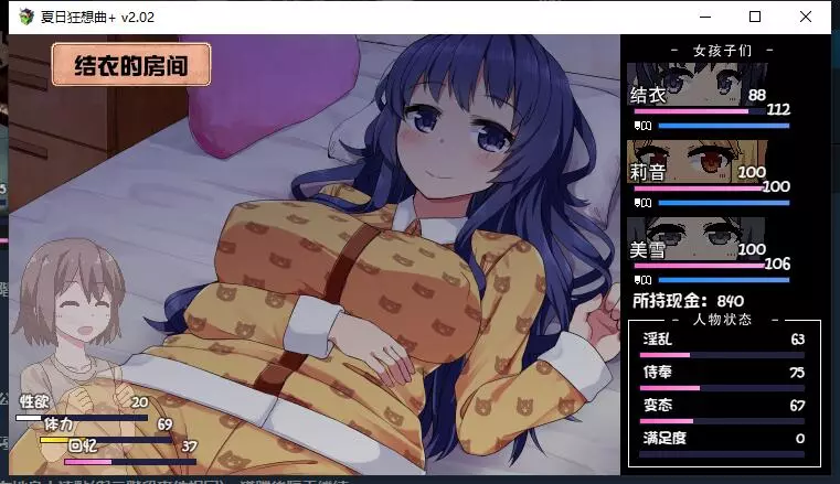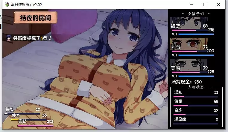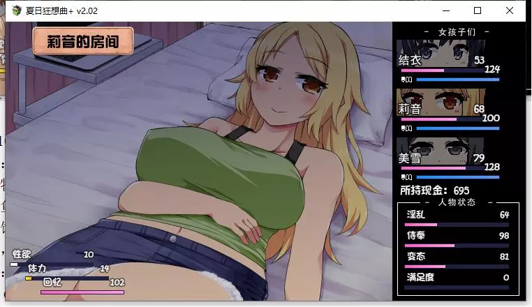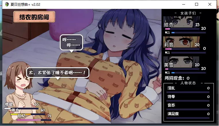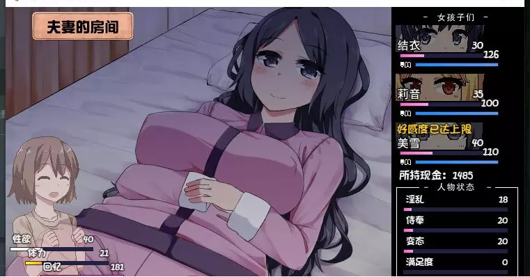 该内容包含低俗、不健康信息,不符合公序良俗,无法进行汉化处理。本次行动获得好感度【+10】,事件好感度【+5】。舒适度达到100以上会触发送礼。 夜晚: 吃饭时每人好感度【+5】。 与结衣睡觉可获得好感度【+5】(若莉音好感度未满,优先与莉音睡觉)。 第一天与不同角色睡觉会触发不同动画,可通过回档解锁不同CG。 美雪的动画会重复出现,建议分别观看结衣和莉音的动画。 技能: 学习捉虫技能。 (若点数不足,可按推荐顺序学习;前几日建议通过完美完成任务获取更多点数)