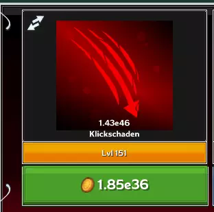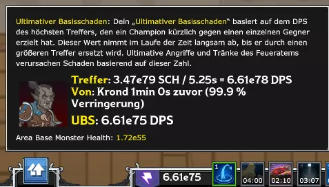 有趣的数字在于“区域基础怪物生命值”这一主题。这指的是你的英雄们为了对敌人造成实质性伤害,每秒必须造成的平均伤害。数值以指数计数法显示。例如,6.61e75 UBS(每秒伤害)对比1.72e55区域基础怪物生命值,意味着科尔斯之锤对生命值仅有55个零的怪物造成带有75个零的伤害值。结果是每一击都是“一击必杀”,我们的队伍在这种情况下可以非常轻松地继续推进多个关卡。当你最强英雄的最大每秒伤害(DPS)比怪物的平均生命值低10个数量级时,就该结束当前冒险并开始新的冒险了。 1. 随从阶段(点击伤害) 你可以通过用鼠标猛击攻击中的敌人来支援你的队伍。你当前的点击伤害显示在用户界面(HUD)中银行位置的最左侧。