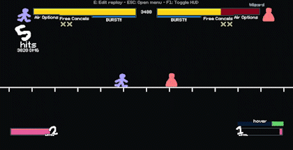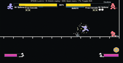 即时取消会立即停止当前播放的任何动画,并允许你选择任何招式。它消耗一格能量槽,且只能在命中后激活。 你的第一个连招 本节面向初学者,旨在学习如何开始并维持连招。至于中级连招,请参见本指南后续的中级技巧部分。 在本节中,我将使用牛仔角色进行演示,因为目前他的连招延展能力可能是游戏中最出色的。 起手式 在默认设置下,起始位置会限制你合理使用的招式数量,因为任何角色的长距离攻击都能直接命中对手。这意味着对手在开场最可能使用的招式之一,是攻击默认姿势的招式,或是能让他们脱离默认姿势的招式(如后 dash 等)。 后 dash 或后跳是一些最常见的开场方式,能让你(大多数时候)脱离危险区域,并为你提供释放投射物/充能技能的空间。 忍者的双节棍是一种有效的开场招式,可击中中央目标并拉近一些距离,但它比许多其他攻击速度慢,且更容易被多种方式 counter。 巫师的魔力打击是更好的开场招式,既能命中起始位置,又能预判向前 dash 或向后 dash。 牛仔的水平斩是非常好的开场招式,尤其是配合自由取消时。它也比游戏中大多数其他招式更快(5帧),能够压制前两个招式。