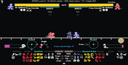 忍者使用自由取消对牛仔的挥空取消施加压制。即时取消
