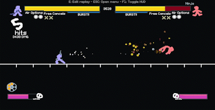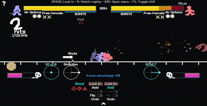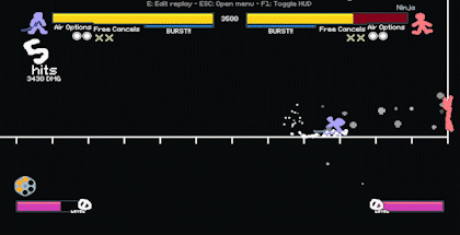 我先是使用了冲刺、传送和空中冲刺,直接来到敌人面前。现在敌人被逼到角落,他们要么尝试向左方向输入(DI) escape,要么就会陷入无限连击。