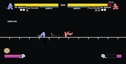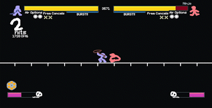 在这个例子中,忍者本可以使用【爆发】来尝试逃脱连击,但他没有这么做。 爆发预判 没有真正的方法可以预测对手何时会使用爆发,但他们最有可能在对自己最有利的时候使用它。例如,如果对手被击飞到舞台的另一边,不再处于危险中,他们不会浪费爆发。当你离他们非常近,且爆发可以将你击退时,他们更有可能使用爆发。有些招式是【爆发安全】的,这意味着即使防御者使用爆发,攻击者也能获得再次行动的机会,通常会让防御者陷入另一个连击。 隐藏值 悲伤值 当远离敌人并回避战斗时,你会逐渐积累一个名为【悲伤值】的隐藏计量条。悲伤值累积会降低攻击获得的超级计量条,最终将完全无法累积超级计量条。当悲伤值达到66%时,会出现【SAD!】警告,此时若回避战斗将开始受到伤害。