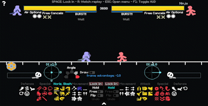 开启免费取消功能需将“Free”滑块切换至开启状态。使用免费取消后,若对手的招式先于你结束,你将可以使用另一招式,这本质上会重置任何帧优势。善用免费取消是游戏中最重要的操作之一,它可用于施加压制、迷惑对手,或在滞空时提供更多移动选择。你最多可同时拥有2个免费取消次数,击中对手时将恢复次数。 在1.4版本中,若玩家没有可用的免费取消次数,可消耗1级超级能量来激活免费取消。当此选项可用时,免费取消滑块将变为紫色。