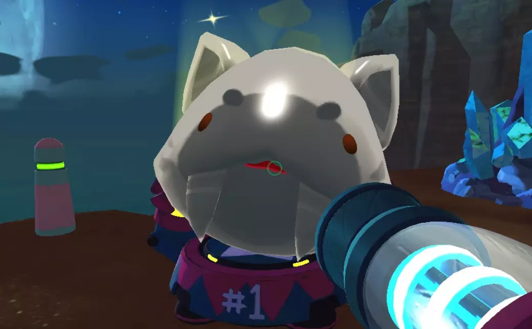 喵呜史莱姆是游戏中的第三种史莱姆,因此也是第三种 largo(大型史莱姆)。它是一种非常可爱的史莱姆,会用脸蹭你,还会偷运其他食物,这对你的牧场构成了威胁。它最喜欢的食物是石鸡。 喵呜史莱姆+粉色史莱姆