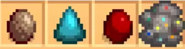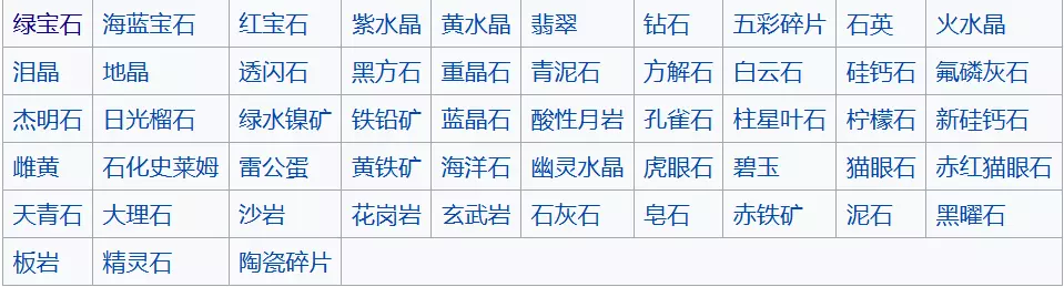 矿石 代码序号 绿宝石 [60] 海蓝宝石 [62] 红宝石 [64] 紫水晶 [66] 黄水晶 [68] 翡翠 [70] 钻石 [72] 五彩碎片 [74] 石英 [80] 火水晶 [82] 泪晶 [84] 地晶 [86] 透闪石 [538] 黑方石 [539] 重晶石 [540] 青泥石 [541] 方解石 [542] 白云石 [543] 硅钙石 [544] 氟磷灰石 [545] 杰明石 [546] 日光榴石 [547] 氯水镍矿 [548] 铁铅矿 [549] 蓝晶石 [550] 酸性月岩 [551] 孔雀石 [552] 柱星叶石 [553] 柠檬石 [554] 新硅钙石 [555] 雌黄 [556] 石化史莱姆 [557] 雷公蛋 [558] 黄铁矿 [559] 海洋石 [560] 幽灵水晶 [561] 虎眼石 [562] 碧石 [563] 猫眼石 [564] 赤红猫眼石 [565] 天青石 [566] 大理石 [567] 沙岩 [568] 花岗岩 [569] 玄武岩 [570] 石灰岩 [571] 皂石 [572]赤铁矿 [573] 泥石 [574] 黑曜石 [575] 板岩 [576] 精灵石 [577] 陶瓷碎片 [578] 除了上述矿石以外,还有四种晶球: