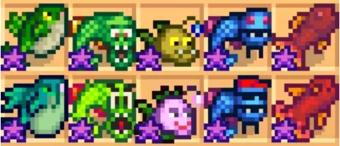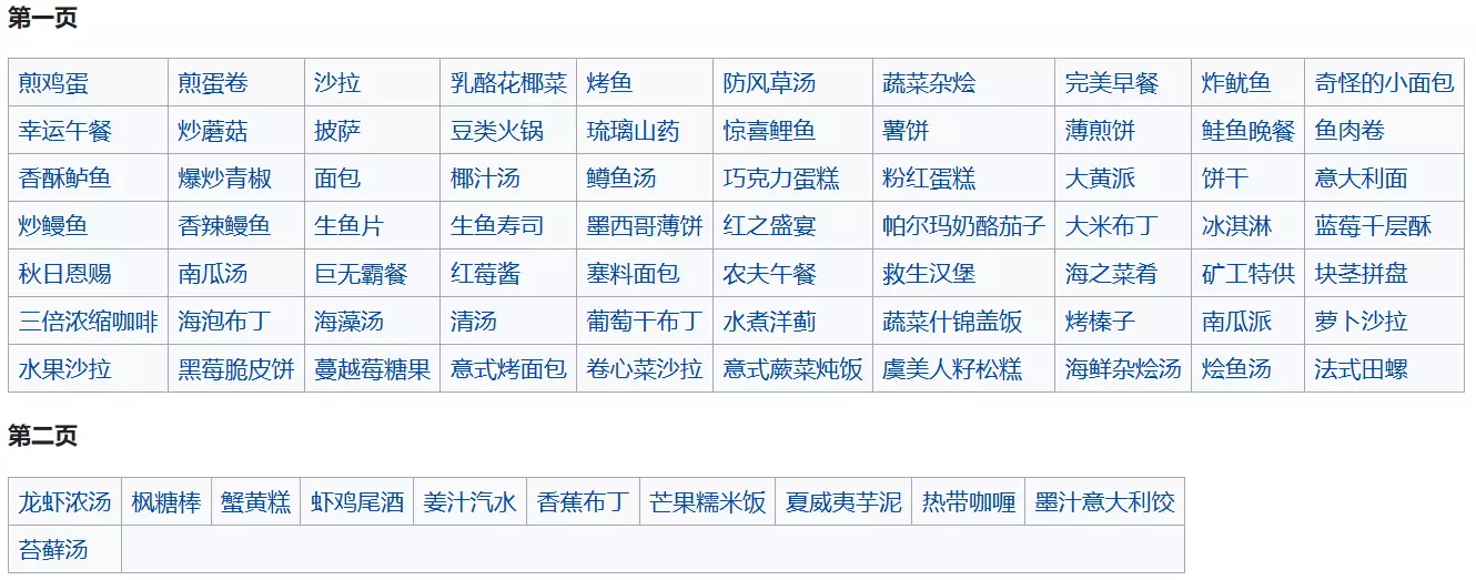 烹饪物品 代码序号 荷包蛋 [194] 煎蛋卷 [195] 沙拉 [196] 乳酪花椰菜 [197] 烤鱼 [198] 防风草汤 [199] 蔬菜杂烩 [200] 完美早餐 [201] 炸鱿鱼 [202] 奇怪的小面包 [203] 幸运午餐 [204] 炒蘑菇 [205] 披萨 [206] 豆类火锅 [207] 琉璃山药 [208] 惊喜鲤鱼 [209] 薯饼 [210] 薄煎饼 [211] 鲑鱼晚餐 [212] 鱼肉卷 [213] 香酥鲈鱼 [214] 爆炒青椒 [215] 面包 [216] 椰汁汤 [218] 鳟鱼汤 [219] 巧克力蛋糕 [220] 粉红蛋糕 [221] 大黄派 [222] 饼干 [223] 意大利面 [224] 炒鳗鱼 [225] 香辣鳗鱼 [226] 生鱼片 [227] 生鱼寿司 [228] 墨西哥薄饼 [229] 红之盛宴 [230] 帕尔玛奶酪茄子 [231] 大米布丁 [232] 冰激凌 [233] 蓝莓千层酥 [234] 秋日恩赐 [235] 南瓜汤 [236]巨无霸餐 [237] 红莓酱 [238] 塞料面包 [239] 农夫午餐 [240] 救生汉堡 [241] 海之菜肴 [242] 矿工特供 [243] 块茎拼盘 [244] 三倍浓缩咖啡 [253] 海泡布丁 [265] 海藻汤 [456] 清汤 [457] 葡萄干布丁 [604] 水煮洋蓟 [605] 蔬菜什锦盖饭 [606] 烤榛子 [607] 南瓜派 [608] 萝卜沙拉 [609] 水果沙拉 [610] 黑莓脆皮饼 [611] 蔓越莓糖果 [612] 意式烤面包 [618] 卷心菜沙拉 [648] 意式蕨菜炖饭 [649] 虞美人籽松糕 [251] 海鲜杂烩汤 [727] 龙虾浓汤 [730] 法式田螺 [729] 烩鱼汤 [728] 枫糖棒 [731] 蟹黄糕 [732] 虾鸡尾酒 [733] 姜汁汽水 [903] 香蕉布丁 [904] 芒果糯米饭 [905] 夏威夷芋泥 [906] 热带咖喱 [907] 墨汁意大利饺 [921] 全鱼类代码《星露谷物语》中共有72种鱼类资源可以钓到。注:虾虎鱼作者至今没有找到代码,请谅解。
