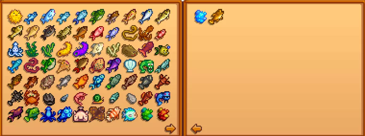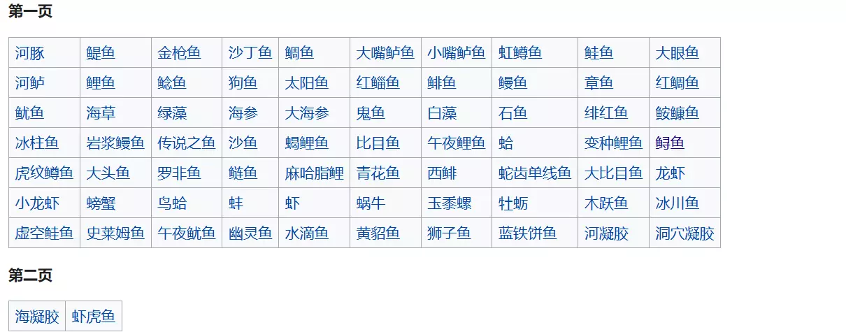 鱼类名称 代码序号 河豚 [128] 鳀鱼 [40] 金枪鱼 [130] 沙丁鱼 [131] 鲷鱼 [132] 大嘴鲈鱼 [136] 小嘴鲈鱼 [137] 虹鳟鱼 [138] 鲑鱼 [139] 大眼鱼 [140] 河鲈 [141] 鲤鱼 [142] 鲶鱼 [143] 狗鱼 [144] 太阳鱼 [145] 红鲻鱼 [146] 鲱鱼 [147] 鳗鱼 [148] 章鱼 [149] 红鲷鱼 [150] 鱿鱼 [151] 海草 [152] 绿藻 [153] 海参 [154] 大海参 [155] 鬼鱼 [156] 白藻 [157] 石鱼 [158] 绯红鱼 [159] 鮟鱇鱼 [160] 冰柱鱼 [161] 岩浆鳗鱼 [162] 传说之鱼 [163] 沙鱼 [164] 蝎鲤鱼 [165] 比目鱼 [267] 午夜鲤鱼 [269] 变种鲤鱼 [682] 鲟鱼 [698] 虎纹鳟鱼 [699] 大头鱼 [700] 罗非鱼 [701] 鲢鱼 [702] 麻哈脂鲤 [704] 青花鱼 [705] 西鲱 [706] 蛇齿单线鱼 [707] 大比目鱼 [708] 龙虾[715] 小龙虾 [716] 螃蟹 [717] 鸟蛤 [718] 蚌 [719] 虾 [720] 蜗牛 [721] 玉黍螺 [722] 牡蛎 [723] 木跃鱼 [734] 冰川鱼 [775] 虚空鲑鱼 [795] 史莱姆鱼 [796] 午夜鱿鱼 [798] 幽灵鱼 [799] 水滴鱼 [800] 黄貂鱼 [836] 狮子鱼 [837] 蓝铁饼鱼 [838] 河凝胶 [RiverJelly] 洞穴凝胶 [CaveJelly] 海凝胶 [SeaJelly] 虾虎鱼 暂未发现 除了以上,还有在齐先生任务里才有的鱼: