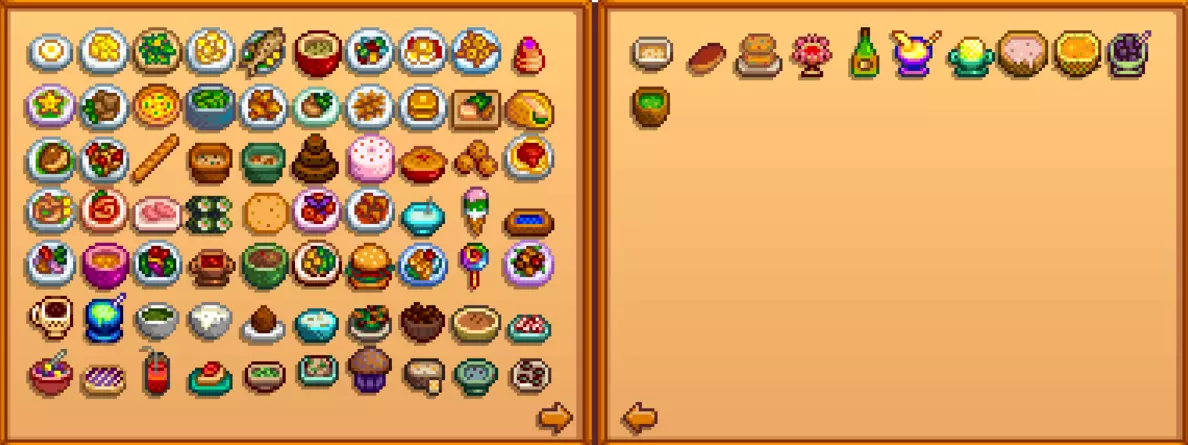 古物名称 代码序号 矮人卷轴I [96] 矮人卷轴II [97] 矮人卷轴III [98] 矮人卷轴IV [99] 有缺口的土罐 [100] 箭头 [101] 古代玩偶 [103] 精灵珠宝 [104] 拒绝洁齿棒 [105] 装饰用扇子 [106] 恐龙蛋 [107] 稀有圆盘 [108] 古剑 [109] 生锈的汤匙 [110] 生锈的靴刺 [111] 生锈的齿轮 [112] 鸡雕像 [113] 古代种子 [114] 史前工具 [115] 干海星 [116] 锚 [117] 玻璃碎片 [118] 古笛 [119] 史前手斧 [120] 矮人头盔 [121] 矮人小工具 [122] 古代鼓 [123] 黄金面具 [124] 黄金遗物 [125] 诡异玩偶(绿色) [126] 诡异玩偶(黄色) [127] 史前肩胛骨 [579] 史前胫骨 [580] 史前头骨 [581] 手部骨骼 [582] 史前肋骨 [583] 史前脊骨 [584] 尾部骨骼 [585] 鹦鹉螺化石 [586] 两栖动物化石[587] 棕榈化石 [588] 三叶虫 [589] 全烹饪代码 《星露谷物语》有以下81种烹饪食品,如下图所示: