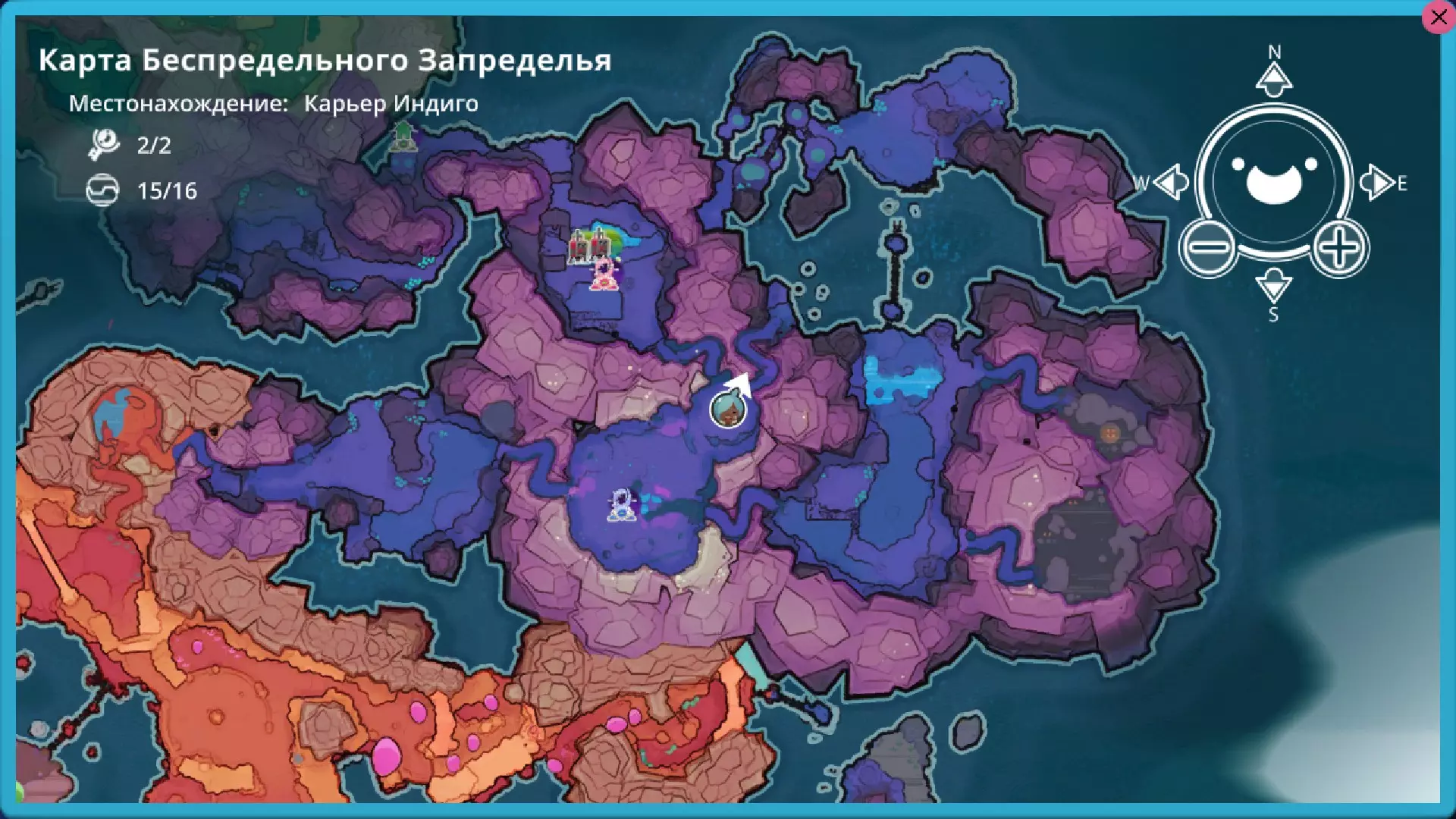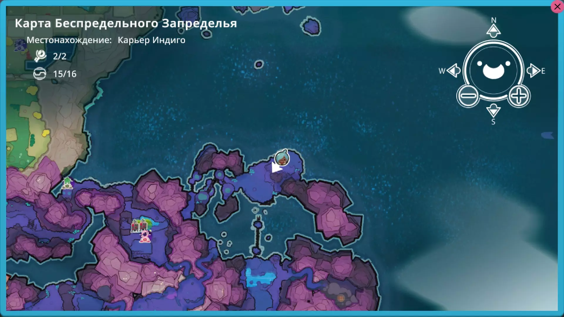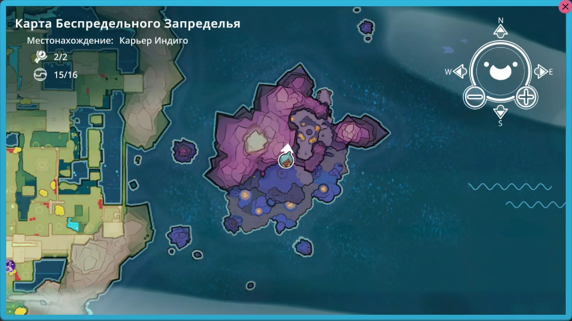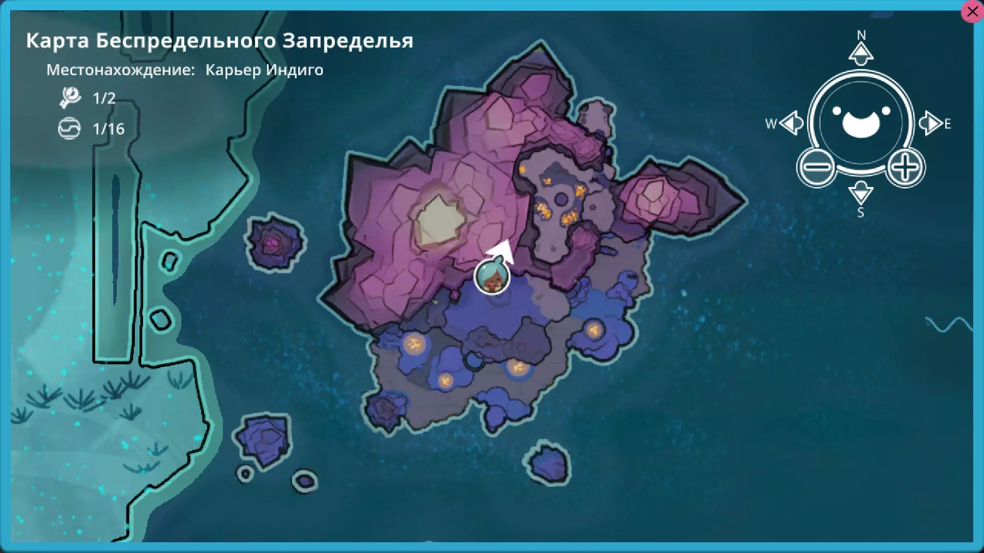 靛蓝生涯 在这个区域有4个戈多。 2个岩石型、1个辐射型和1个水晶型(在单独的岛屿上) 这里有一个岩石型。它会开启传送门。喜爱的食物:心果。
