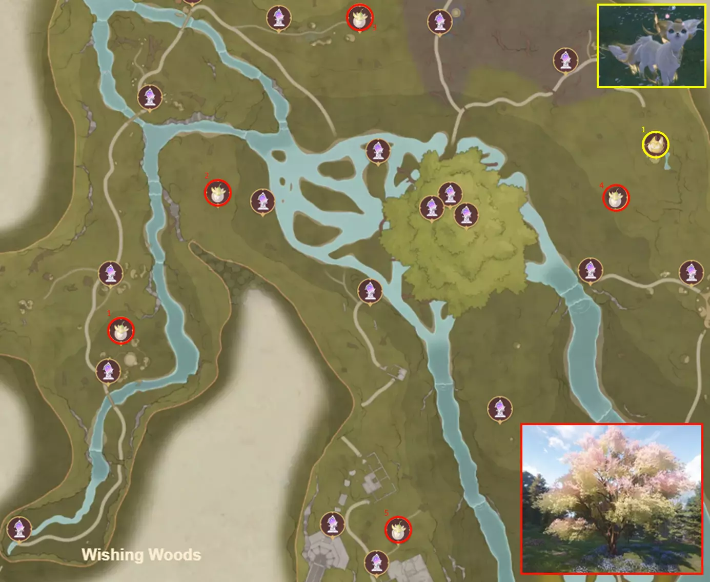 位置:废弃区域。 极为稀有:显然每天可能不止刷新一次,但非常罕见。 仅在夜间出现。 位置分布 许愿森林:5棵时空树和1只黎明绒毛。