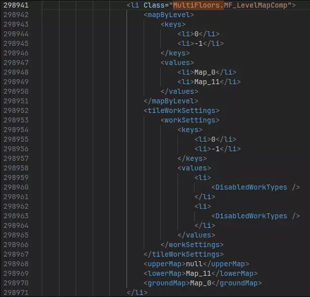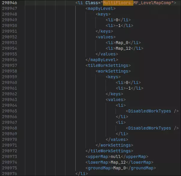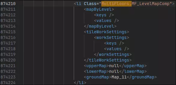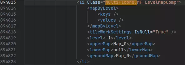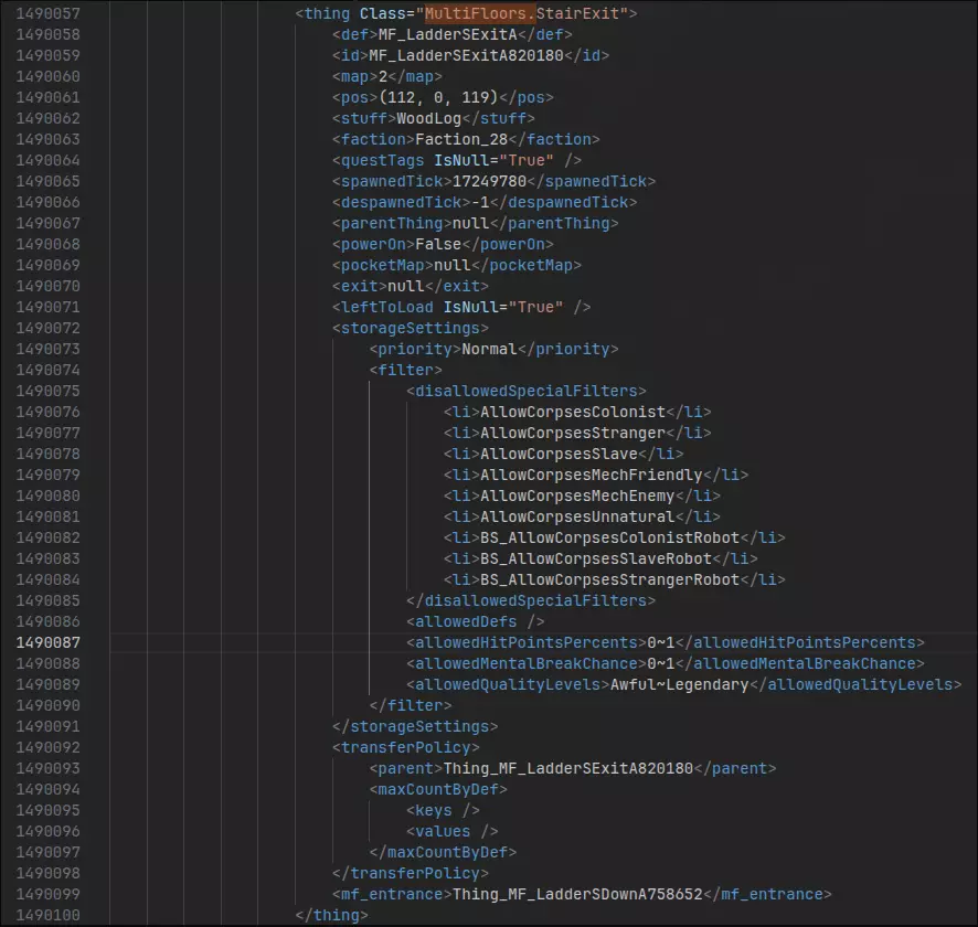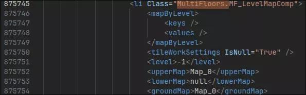 你看我们想要连接的地图是Map_11,但地下室是Map_12对吧?没错,我们需要修改这一点。不过,我们首先要把梯子出口移到正确的地图上。继续浏览MultiFloors,直到你找到类似“<thing Class="MultiFloors.StairExit">”这样的内容,我这里就是这样的情况。