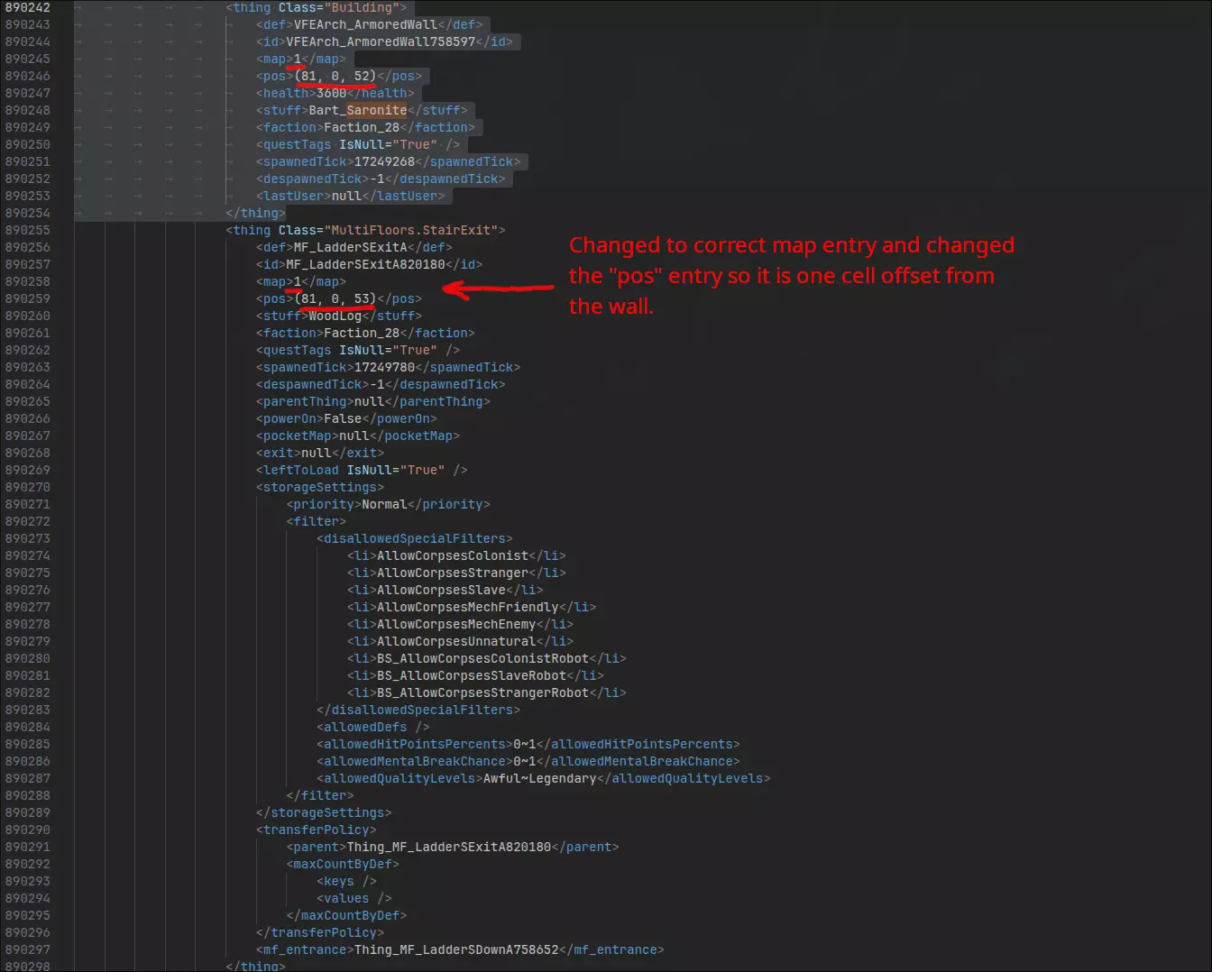 注意它有一个条目<map>1</map>,而楼梯的该条目为2。粘贴剪切的<thing>条目后,不要忘记修改这一点。