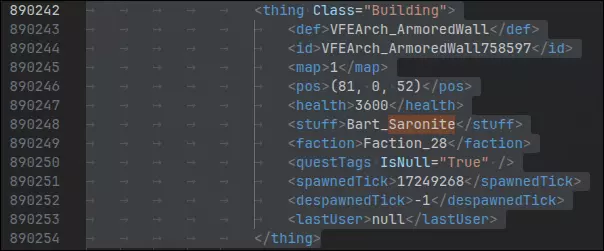 删除整个<thing></thing>条目,然后在你想要添加它的地图中搜索特定物品。以我为例,要添加的是由萨隆邪铁制成的装甲墙。