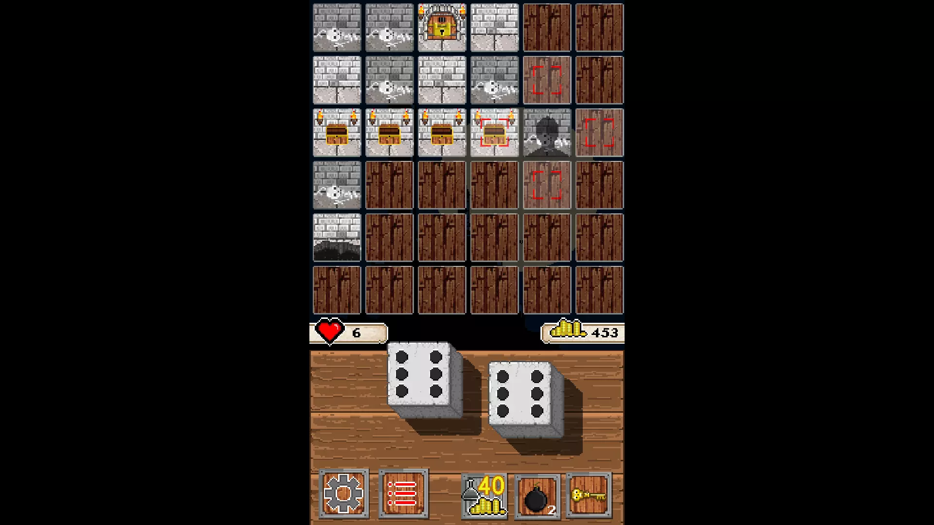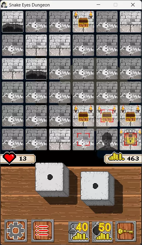 游戏玩法及注意事项 你拥有两个骰子,第一次投掷用于确定出口位置,每个骰子的点数分别对应x、y坐标;第二次投掷则决定你的起始位置。其余情况下,投掷两个骰子的点数之和将决定你遇到的房间和怪物。在战斗界面中,两个骰子的点数相加即为你的伤害值,若购买过攻击加成,还需在此基础上加上相应的攻击加成点数。在6*6的游戏地图中,每个格子只会出现一种遭遇,除半路逃跑后怪物会留在原地外,没有其他随机事件。以下是骰子点数遭遇的房间: 2点:出口钥匙 3点:随机将你传送到另一个未到达过的格子并立即重新投掷一次,有可能直接把你传送到死路,详情请见5点 4点:弗兰肯斯坦,4攻击力血厚,比较强的怪物 5点:把当前格子变成一个塌陷的坑,当你选择了方向离开此格子之后不可再次通过,需要注意如果两个以上的坑可能出现把角落或者其他地方封死的情况,如果此时进入包围圈则游戏立刻结束算作失败。解决办法:要么不要进去,更好的办法是在知道另一个角也是坑之前先把坑围起来的地方探索完,因为刚摇到5点你站在坑上是没事的,别点错回去就行。 6点:木乃伊,3攻击力血少,垃圾怪物。 7点:新手教程第一个小怪,2攻击力12血量,是最弱的怪。 8点:新手教程第二个小怪,4攻击力中等血量,实力次于弗兰肯斯坦。 9点:空房间,无事发生。 10点:精灵,攻击力7血量7,一下秒不掉能打出很高伤害,且不能逃跑,掉落药水(回7血)或较多金币,或者一件随机艺术收藏品,收藏品只能通过此途径获得。11点:小Boss吸血鬼,血量较高,其形象是游戏图标的看板娘。该怪物拥有两个专属骰子,分别决定对你造成的伤害以及为自身恢复的血量,具体信息可在游戏内右侧查看(不过实际作用不大,你基本没有操作空间)。刚开始玩时没遇到过6点的木乃伊,还以为收藏品和任务中的“mummies”指的是这个怪物,把它叫做“妈咪”。 12点:恢复5点血量 由于摇出几点完全随机,打怪的奖励也随机,所以7点的小怪和10点的精灵是我最喜欢的怪物。有可能你接连摇到4只吸血鬼,拼尽全力战胜后,得到的金币却还没有一只小怪给的多。 另外,最后一个房间必定是2点的出口钥匙,无论之前是否获得过钥匙。除了商店购买的30块炸弹未使用外,所有炸弹、钥匙、药水均无法带入下一局,且钥匙无法叠加。隐藏首领免疫炸弹。