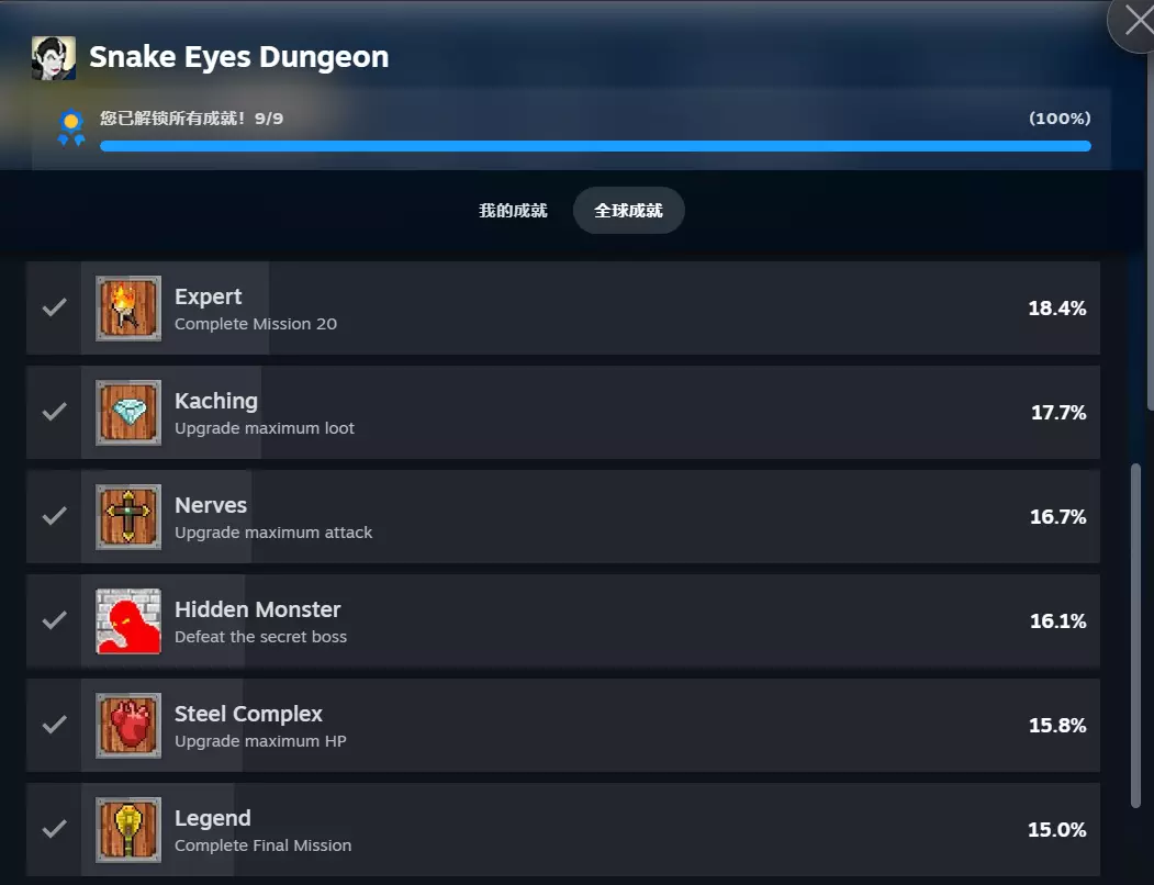 此游戏暂无简体中文,但整体不影响游玩,因为它的机制简单到枯燥折磨的程度,但我完全想不到这游戏最难的成就也有15%的完成度。全成就大约需要14小时以上,但实际做起来非常枯燥,而且其中有些任务随机性比较大,会影响进度。 全成就指南: 1. Arsonist:在商店购买一个炸弹。这里的商店并不是指游戏内购买药水、炸弹、钥匙的商店,而是在游戏结束后的强化界面最下边。这个炸弹很值,建议每局都买一个,但钥匙不必买。 2. Rookie:完成任务5,即mission5。此游戏只能同时做3个任务,所以之后需要做的任务编号和你实际完成的成就数量可能有差异,请注意区分。 3. Adventure:完成任务10。 4.5.传奇:完成任务50(中间有很多随机性强不可控的任务,都是需要你一局摇到某个相同点数多少次,非常折磨) 6.叮铃:在强化界面把抢夺等级拉满 7.勇气:在强化界面把攻击等级拉满 8.钢铁雄心:在强化界面把生命等级拉满隐藏的怪物:击败秘密BOSS的方法:单局携带700以上金币返回大门时,必定遭遇此BOSS。其形象是一条红色的龙,没有特殊招式,拥有50血量和5点攻击。建议至少在有2点以上攻击加成且生命值达到26点以上时再进行挑战;若觉得难以击败,可以额外准备药水。成功击败后会获得较多金币,若失败则本局700+金币将丢失;若不想挑战,也可以将金币花费至700以下。注意,此怪物免疫炸弹。 全成就大约需要14小时,且重复性高,相当枯燥。最难的成就居然也有15%的完成率,真是令人惊讶。
