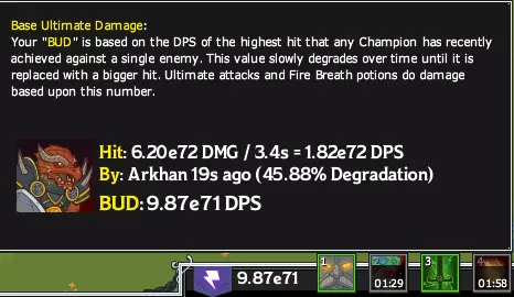 在窗口左上角,你可以看到当前金币数量、总金币获取加成以及每秒伤害计量器。经过最近的更新补丁后,现在有3种相关方式可以衡量你的编队当前输出的伤害量(其实际显示效果取决于你的设置)。 角色脚下的数字代表他们的实际伤害,即基础伤害乘以当前获得的 buff。这个数值变化很大,会随着 buff 条件的改变(例如有多少角色在攻击你的坦克等)而上下波动,换句话说,会受到 buff 动态变化的影响。 每秒伤害计量器有两个指标:基础每秒伤害和平均每秒伤害。基础每秒伤害是开发者对您在排除所有动态因素(如层数、承受攻击的英雄数量等)后的伤害估算值。它包含一个针对动态效果的轻微补偿系数。该数值会根据阵型位置、英雄等级和增益强度而变化。它最适用于查看调整英雄在阵型中的位置时伤害的增减情况,但可能无法真实反映英雄在特定时刻的实际伤害输出。 平均每秒伤害是第二个数值,它能更准确地体现阵型的有效性。其计算方式是将您之前的平均值(约占90%权重)与最新一次攻击伤害(约占10%权重)进行平均。作为实际伤害计算的结果,它会受到你的阵容动态变化的影响。作为伤害的平均值,这既有优点也有缺点:平均值使其对伤害的急剧峰值和降低更具抵抗力,但这种计算方法也意味着在调整阵容后,可能需要一分钟才能更新。 还有一个标签页会显示每个英雄造成的伤害百分比(通常一个英雄的伤害占比接近100%,其他英雄则负责 buff/坦克/治疗)。 基础终极技能伤害(BUD) 终极技能的伤害基于你的BUD,BUD是你的最高单次伤害除以攻击冷却时间的数值。更高的单次伤害会覆盖之前的BUD。在15秒未被覆盖后,它将开始快速衰减,直到被覆盖为止。本质上,更强的攻击会提高你的【BUD】,从而增加你的伤害。需要注意的是,减益效果在这方面特别有效,因为它们会增加敌人受到的攻击伤害,提高【BUD】,进而增加敌人受到的终极技能伤害。