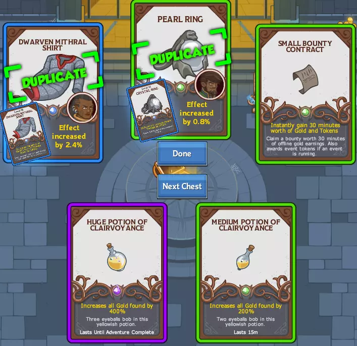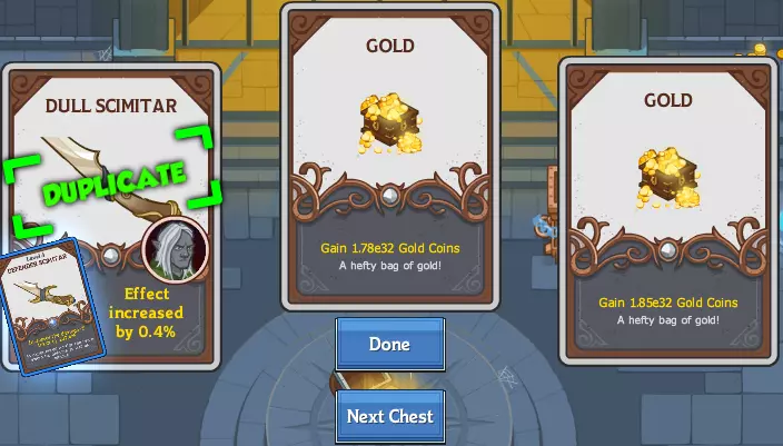 1张装备卡 1张金卡(取决于寻金率和队伍 dps,上限为已到达的最高区域) 1张随机卡(装备卡、金卡或增益卡[药水或铁匠契约]的概率均等) 在游戏初期(以及前几次活动运行时),你可以将银箱子留到遇到瓶颈时再开,以最大化箱子中金币的效用,争取获得金币来购买升级和更多恩惠。银箱子是比金箱子更高效的装备升级方式。
