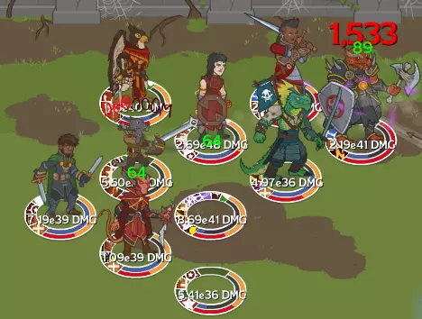 一个装甲事件首领。该首领拥有50段生命值。 伙伴 伙伴本质上是自动点击器。它们可以用真实货币和宝石购买。你可以将它们放置在升级栏中来升级你的英雄(或自动点击造成伤害),【每个栏位1个伙伴】;放置在终极技能栏中,它们会每30秒随机释放一次终极技能,【最多4个伙伴】;放置在战场上,它们会自动点击,【最多6个伙伴】。当伙伴在战场上时,它们会根据伙伴的数量获得额外效果。3个宠物会自动拾取金币和任务物品 5个宠物会打开并拾取 Boss 的战利品袋 6个宠物会自动点击干扰物 需要考虑的重要阈值包括:2个宠物(允许你在场上放置一个自动点击器,另一个用于提升点击伤害,加快初始区域的离线清理速度)、4个宠物(可自动拾取任务物品和金币,并提升点击伤害)、6个宠物(原因同上),以及10-11个宠物(此时你可以通过设置自动点击器来升级英雄和使用终极技能,实现完全离线挂机)。