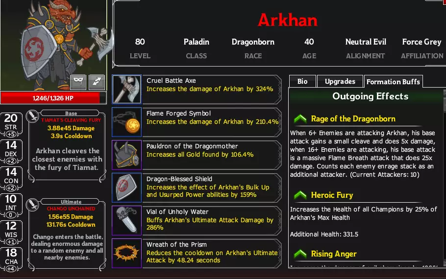 实战阵型示例 英雄 英雄拥有生命值、基础攻击、终极技能(带有冷却时间)以及随等级提升解锁的效果。他们在特定等级时可选择一项专精,还具备敏捷、力量等属性,以及种族、阵营和派系。种族、阵营和派系主要用于冒险变体的条件判定,或与其他英雄的技能产生联动(例如,提升魅力值超过13的角色伤害,或增加邪恶阵营英雄的伤害)。英雄还拥有6个装备栏位。所有这些信息都可在点击英雄头像后访问的【英雄信息表】中查看。