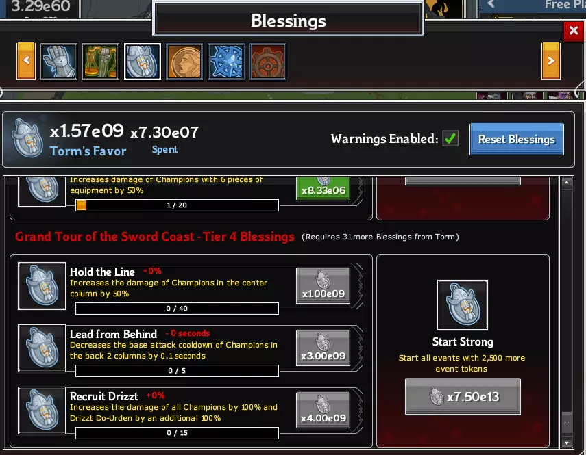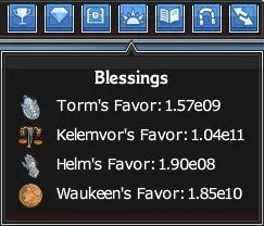 所有战役的总声望。点击图标可进入祝福界面。在这种情况下,第四个是当前活动的声望。 声望也可用于购买祝福。祝福是增益效果,其生效条件会在购买时说明(例如,有的祝福可提升所有英雄的伤害,有的则只对女性英雄生效)。祝福分为两列,左侧(有多个等级)的称为次要祝福,特定于某个战役;右侧(图标较大,只有一个等级)的则是主要祝福,对所有战役都有效,因此非常珍贵。祝福的购买等级越高,花费的声望就越多。【非常重要的一点是,不要过度使用声望购买祝福,因为这会降低你的金币获取,从而拖慢进度。】一个不错的衡量标准是,当你接近游戏回合结束时,使用总恩惠值的1%来购买祝福。如果你犯下严重错误,可以以少量损失为代价重置已花费的恩惠值。