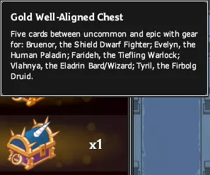 2张装备卡 1张增益卡 1张悬赏契约卡 1张随机卡(可能是装备卡、增益卡或契约卡) 黄金宝箱的特点是:必定包含至少1张你此前未拥有的装备卡,该卡会使你的英雄获得一次升级(最高稀有品质),且必定包含至少1件蓝色品质装备(升级的装备和蓝色装备可以不是同一件)。此外,如果你运气不佳,每开启10个黄金宝箱会获得1件【保底史诗装备】。这意味着,如果你的英雄尚未全身蓝色装备,开启黄金宝箱至少会获得一次升级。另外,如果你获得史诗装备,只要任意适用英雄身上存在非史诗装备的槽位,该史诗装备就必定出现在此前未装备史诗装备的槽位上。活动冠军宝箱与黄金宝箱类似,但其中包含的装备仅适用于指定的活动冠军,且开出随机装备卡牌的概率更高。