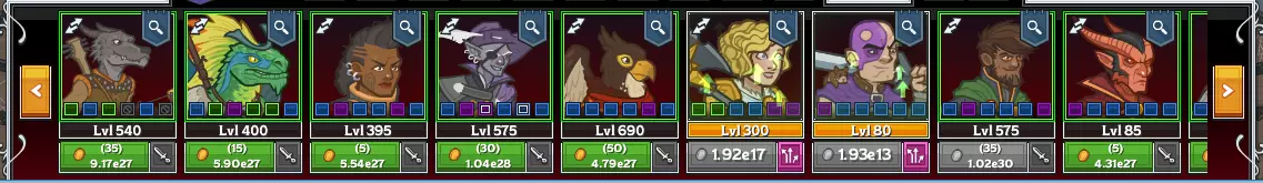 获得【压制】状态的英雄身上会出现蓝色图标。注意左侧的坦克英雄需要承受更多敌人才能被压制,而右侧的增益/输出型英雄则更容易被压制。 随着你获得更多金币而解锁的12位英雄被称为核心12英雄,所有拥有游戏的玩家都能使用他们。这些英雄过去的表现欠佳,但2019年4月的更新使他们变得相当强力。 通过活动和时间门(稍后详述)获得的英雄被称为活动英雄,最主要的区别在于,与核心12英雄相比,为他们装备 gear 的方式略有不同,且过程更为繁琐(这一点也将在稍后说明)。他们与核心 champion(英雄)共享一个槽位(因此你不能部署两个共享同一槽位的英雄,例如布鲁诺和迪金),你可以通过点击头像左上角在他们之间切换。 此外还有常绿英雄,这类英雄可以通过活动以外的方式解锁。其中包括希奇(通过新闻通讯解锁)、崔斯特(在剑湾之旅中解锁)和阿扎卡(在湮灭之墓中解锁)。他们使用普通的白银和黄金宝箱来获取装备。 从实际角度来看,英雄按其角色划分。他们通常属于五种子类之一:坦克、治疗或续航、 dps(伤害输出)、辅助和金币获取。坦克型英雄通常拥有高生命值、高抗性,其升级效果要么能让自身更肉,要么能在受到攻击时提升其他英雄的伤害,或是类似效果。核心12英雄中的坦克型英雄包括娜耶丽、熊形态泰瑞尔和阿尔坎。 续航型或治疗型英雄拥有能让坦克存活更久的技能。他们通常通过治疗或提供护盾来实现这一点。核心12英雄中属于此类的两位英雄是卡莉奥佩和塞莱斯特。 输出型英雄(DPS)是指凭借自身增益技能或其他提升自身伤害的能力来造成高额伤害的英雄。他们通常在第一个装备槽位配备增加伤害的物品。核心12人阵容中的输出型英雄包括贾拉索(前期)、明斯克、德莉娜(遗憾的是表现不佳)、贾米拉以及阿卡汉(需要大量装备)。对于大多数冒险,你的阵容中应只安排1名输出型英雄。 辅助型英雄(编辑:游戏内现称支援型英雄)是游戏的核心,因为阵容中的大多数位置都由他们占据。他们为输出型英雄提供增益,使其能造成更多伤害。增益效果通常会相互叠加。因此,如果你安排2名输出型英雄,与只安排1名输出型英雄相比,其效果相当于1名输出型英雄加上100%的伤害增益。它比其他任何增益型角色都要弱得多,因为其他增益型角色初始效果为100%,并且会大幅提升至数千甚至数百万的倍数,因此在大多数情况下,多使用一个增益型角色比多个输出型角色更有效。有些英雄则是减益型角色,它们通过增加敌人受到的伤害来提升你的输出。 金币获取型英雄通常比其他角色的增益效果弱,但它们通过增加敌人被击杀时掉落的金币来弥补这一点。虽然金币获取型英雄能让你更快购买升级,但由于增益效果较弱,它们的进度也会更快停滞,在理想配置中,当击杀速度变慢时,会将其替换为增益型角色。你可以对比寻宝冠军和区域进度的收益,其中每个区域比前一个区域额外提供20%的金币,每五个区域的金币收益约为之前的2.5倍。核心寻宝冠军是贾拉索。