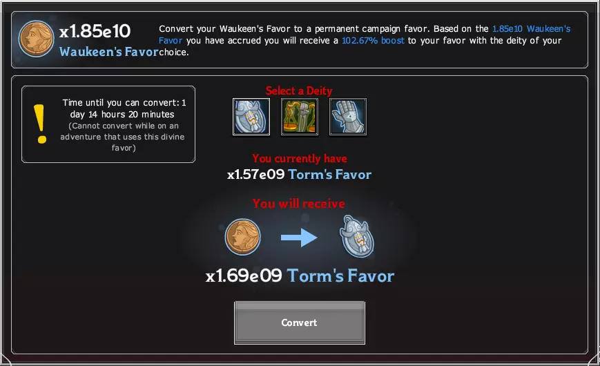 点击英雄栏顶部的背包图标即可访问你所有的物品。药水通常会被留到后期使用,那时每次通关的收益会非常低。由于这些效果之间是乘法叠加的,所以人们会储存足够每种药剂维持一小时(小型药剂除外,因其倍率低且囤积起来非常不便),然后进行“黄金一小时”——将堆叠的药剂与周末增益效果结合使用,目的是大幅提升当前进度(或者至少取得一些进展)。 锻造契约是升级活动冠军装备的唯一“可肝”途径,因此最好将它们留作此用(核心冠军可通过从银箱和金箱中刷出的重复英雄来升级)。 悬赏契约提供的金币和活动代币,相当于通过离线 farming 计算得出的“x 小时的刷本收益”。它们最好留到活动时使用。事件与时间之门 事件 每3周的周三会开启一个持续12天的事件。在事件期间,怪物会随机掉落事件代币,即使离线也能以每分钟2个的速率获得,因此你能获取的事件货币总量有一个固定上限。 事件期间,你可以消耗事件货币解锁特殊的事件冒险及其相关变体和自由模式。首次通关基础冒险将奖励你事件冠军,而变体冒险会奖励金色事件冠军宝箱。通关自由模式的第50区域将随机获得一个金色或银色事件冠军宝箱。每个年度活动都有1位关联的冠军英雄,由于我们现已进入第2年,因此共有2位冠军英雄及其关联的冒险和变体供你挑战。关于活动的注意事项如下: 活动期间,商店将出售活动冠军宝箱,若购买3个或更多黄金宝箱,还可获得额外的金色史诗奖励。 关联活动是为特定活动冠军英雄获取装备的最佳途径。 你需要面对两个敌人:货币和时间,任何一方管理不当都可能缩短你的活动进程。 挑战变体失败会造成巨大挫折,因为你将损失时间和货币,却一无所获。 悬赏契约在活动期间会奖励额外的活动货币,基本上能让你获得额外的尝试机会。活动免费玩法的代币消耗会逐渐增加,直至达到2500代币的上限,完成后会奖励一个随机的活动冠军宝箱(金色宝箱的概率为三分之一)。 如果连续获得3个银色宝箱,那么下一个宝箱必定是金色。 直接在商店以1万货币购买金色套装并不划算,只有在活动最后一天时间紧迫时才建议这样做(在免费玩法的货币达到上限时,你至少能获得1个金色宝箱和3个银色宝箱,而直接购买只能得到1个金色宝箱)。 活动中没有活动祝福,但恩惠的作用与常规战役相同。 活动结束时,活动恩惠将按一定百分比转换为战役恩惠。例如,如果你总共获得了1e7剑湾声望和1e10托瑞尔冒险声望,并且获得了1e9活动声望,你将以90%的转化率进行转换,并可以在9e6剑湾声望和9e9托瑞尔冒险声望之间选择。