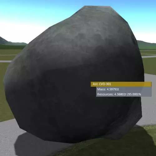 小行星开采 每个小行星都有特定的质量和矿石浓度。开采小行星与开采行星或卫星非常相似。你无需使用扫描仪来确定矿石浓度,只需靠近小行星或拥有它即可。开采需要钻头、ISRU(原位资源利用)、热量管理和电力管理。请记住以下几个非常重要的事项: - 小行星的质量是有限的,这意味着你可以将小行星的矿石开采殆尽。 - 小行星自带矿石浓度,例如一颗95%浓度的B级小行星可能比一颗50%浓度的C级小行星含有更多矿石。 - 同一等级的小行星质量也各不相同,例如C级小行星的质量可能是42.5吨或190.6吨。低质量小行星可能不值得建立燃料站,因为它们在开采几千单位矿石后就会耗尽。当矿石罐满时,请关闭钻头。即使没有地方存放矿石,钻头仍会继续消耗小行星资源。这是一张我在KSP着陆的A级95%浓度小行星的截图。