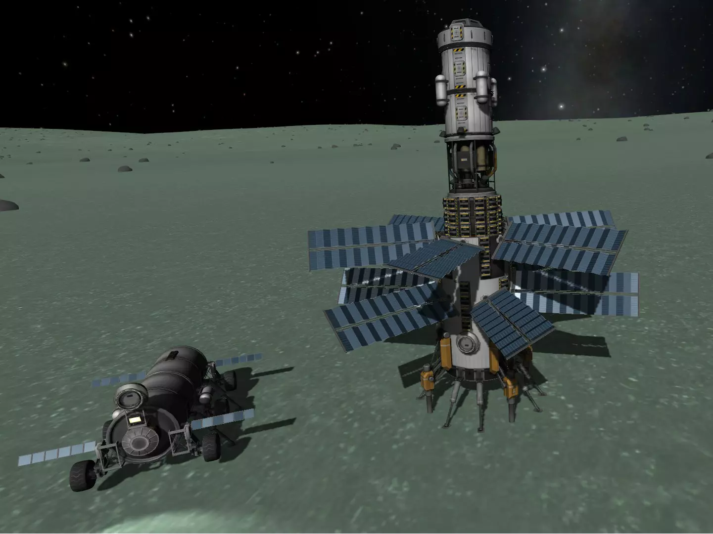 在卫星或行星上采矿 一旦你为采矿基地选定了具体位置,就可以开始搭建了!本指南假设你已了解着陆、轨道运行等操作,不会详细说明具体的设计和设置方案,但会提供一些提示和建议。 确保你的 drill(钻井机)连接到高质量物体上,例如大型燃料罐。钻井机会产生热量,当它们连接到高质量物体时,高质量物体能有效吸收大量热量。 将太阳能电池板或机翼连接到钻井机所连接的高质量物体或燃料罐上。它们将充当被动散热器,帮助钻井机散热。 为采矿钻井机配备一个可供工程师驾驶的指令舱。工程师也有助于管理和散发钻井机产生的热量。设置你的采矿基地时,要确保它能以某种方式进行对接,否则你生产的所有矿石和燃料很可能会浪费掉。 携带大量电池或燃料电池。如果你想让钻头和ISRU(原位资源利用装置)持续运行,就需要为其提供大量电力。太阳能发电虽然很棒,但当你所在的行星或卫星处于夜间时,就需要电池或燃料电池来维持运转。 考虑建立一个与燃料漫游车相结合的采矿基地。你可以用燃料漫游车与着陆器对接为其加油,或者使用可重复使用的航天器将燃料运送到轨道站。你也可以使用高级抓取单元来转移燃料或其他资源,并不局限于仅使用对接端口。确保为你想要生产的所有类型燃料准备好储存空间。ISRU(原位资源利用装置)可以制造单组元推进剂、液态燃料和氧化剂。例如,如果你没有单组元推进剂储罐,就无法生产它。考虑到这一点,还要确保你的燃料漫游车也具备所有类型的储存空间。 这是我搭建的第一个采矿基地的截图,希望能帮到你。