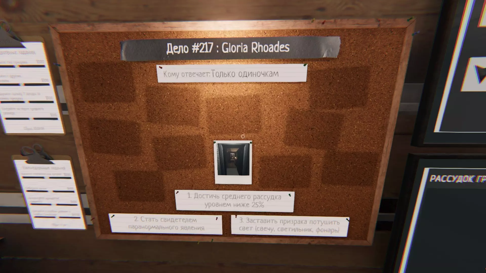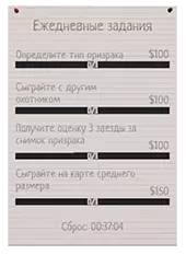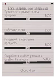 Когда вы заходите в игру, в меню, в нижней части доски справа, можно заметить две колонки, одна из них является списком еженедельных заданий, который обновляется *барабанная дробь* раз в неделю. Выполните в общей сложности 10 таких, и достижение у вас в кармане. Корректно определите тип Призрака: правильно определите призрака на контрактах в общей сложности 15 раз. Соберите кости: в общей сложности соберите 15 костей. Достигните целей контракта на [Название карты]: Выполните 12 заданий на указанной карте. Карта выбирается случайным образом и отличается для каждого игрока. Зарабатывайте бонусы за идеальное расследование: сыграйте 5 игр со следующими условиями: правильно определите тип призрака, выполните все 3 задания, соберите кость и заполните все ячейки для фотографий (10 шт.) фото с 3 звёздами. Подробнее см. "Flawless Execution". Зарабатывайте отличные бонусы за расследование на сложности кошмар или выше: Сыграйте 3 игры с множителем вознаграждения х4 (сложность кошмар+) или более при соблюдении следующих условий: определите правильный тип призрака, выполните все 3 задания, соберите кость и заполните все ячейки для фотографий фотографиями с 3 звёздами. Подробнее см. "Flawless Execution". Заработайте опыт: необходимо заработать в общей сумме требуемое количество опыта, указанное в меню. Задание накопительное. Зарабатывайте деньги с контрактов: необходимо заработать в общей сумме требуемое количество денег, указанное в меню. Задание накопительное. Уловите паранормальный звук через направленный микрофон: вооружитесь на контракте направленным микрофоном и отправляйтесь в комнату призрака. Там, включив прибор, поводите в разные области комнаты микрофоном, рано или поздно вы услышите характерный звук - это прибор засёк паранормальный. Требуется уловить подобным образом звуки 15 раз. Обнаружьте призрака с помощью датчика движения: аналогично предыдущему заданию берёте датчик движения, идёте к комнате призрака и ставите 2 таких на выходе. Проходя через каждый, призрак будет засечен оборудованием. В общей сложности необходимо 30 раз, чтобы датчик засёк прохождение через него призрака. Переживите фазы охоты: 30 раз переживите фазу охоты призрака. Сделайте 3-звёздочные фотографии шагов: в общей сложности нужно сделать 50 трёхзвездночных снимков шагов призрака. "Зарядите" гиги-за-шаги на полу ультрафиолетовым фонариком (просто светите пару секунд на отпечаток, пока он не станет крайне четким) и сделайте фото максимально близко к объекту. Для удобства можно рассыпать соль, пройдя по ней, призрак оставит возле соли следы в форме пяток, видимые под ультрафиолетом. Чтобы не пропустить их, советую, расположить все кучки примерно в одной области, и кинуть в её центр светящуюся палочку. Сделайте 3-звёздочные фотографии призраков: в общей сложности сделайте на 3 звезды 15 снимков призрака. За один контракт засчитывается только 1 фото, так что вам придётся 15 раз создать контракт ради этого задания. Сделайте 3-звёздочные фотографии: в общей сложности сделайте 50 трёхзвёздочных фотографий: проще всего копить это задание на фотографиях соли, по которой прошёлся призрак, поскольку за одну катку можно сделать 6 таких снимков, к тому же фотографировать их на 3 звезды проще всего, вдобавок к фото кучек можете успеть сфотографировать и отпечатки после каждой соли. Также советую дел