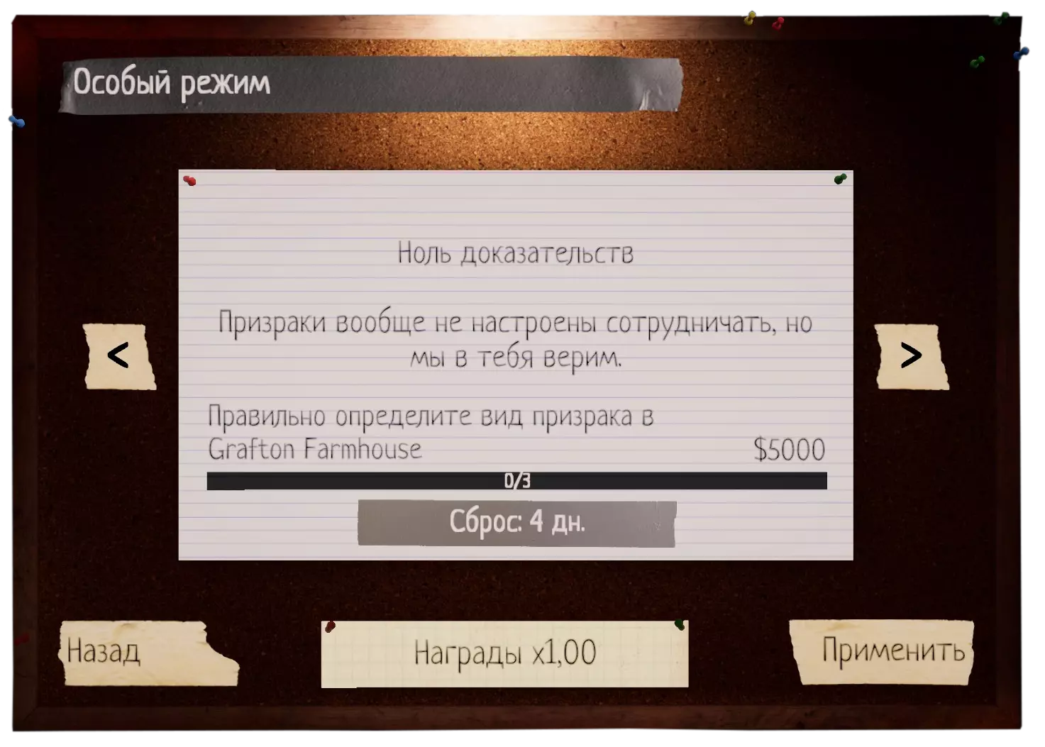 游戏中除了常规难度【业余/中等/专业/噩梦/疯狂】外,还存在专业难度的额外强化版本——一种特殊模式,它类似一种挑战,可能会改变幽灵或玩家自身的行为(例如,减慢或加快其中一方的速度),或者禁止使用恢复理智的药片、香薰等物品。更多详情可在我的指南(遗憾的是仍在开发中)中了解。 选择此模式需在地图难度设置区域进行。 该模式有时间限制,玩家需在7天内完成挑战,时间结束后挑战将更新并具备其他条件。每个挑战的必要条件是在条件中指定的地图上完成任务(例如,下方可以看到是格拉夫顿农舍)。需要在该地图上完成3次成功的任务,正确识别出鬼魂(无需完成面包车内白板上的额外任务)。完成3次这样的成功任务后,你将获得5000美元。可以在难度选择白板上查看挑战的剩余时间。