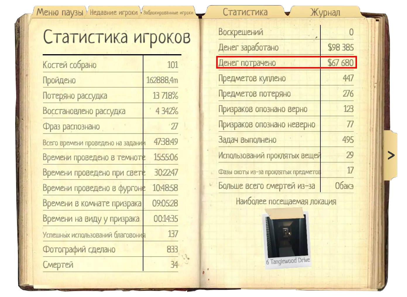 笔记本。标准幽灵,初始狩猎理智值为50%。幸运的是,它有相当稳定的熏香检定机制。普通幽灵(除恶魔外)在被熏香影响后(可通过任务“在幽灵附近点燃熏香”确认是否成功熏香,或在幽灵事件期间捕捉其状态等),90秒内无法开始狩猎。而【幽灵(nuзДух)】在被熏香影响后,180秒内无法开始狩猎。记录时间,最好至少进行两次这样的检查,以确认你的选择。 幽灵可以在狩猎时被熏香影响,并同时触发3分钟的计时器。有一次我们就是这样发现幽灵的,在狩猎时不小心使用了熏香,当时它才刚开始出现。下一次狩猎是在3分钟后才开始的。之后的狩猎则恢复了幽灵通常的间隔时间。 Thaye Discovered