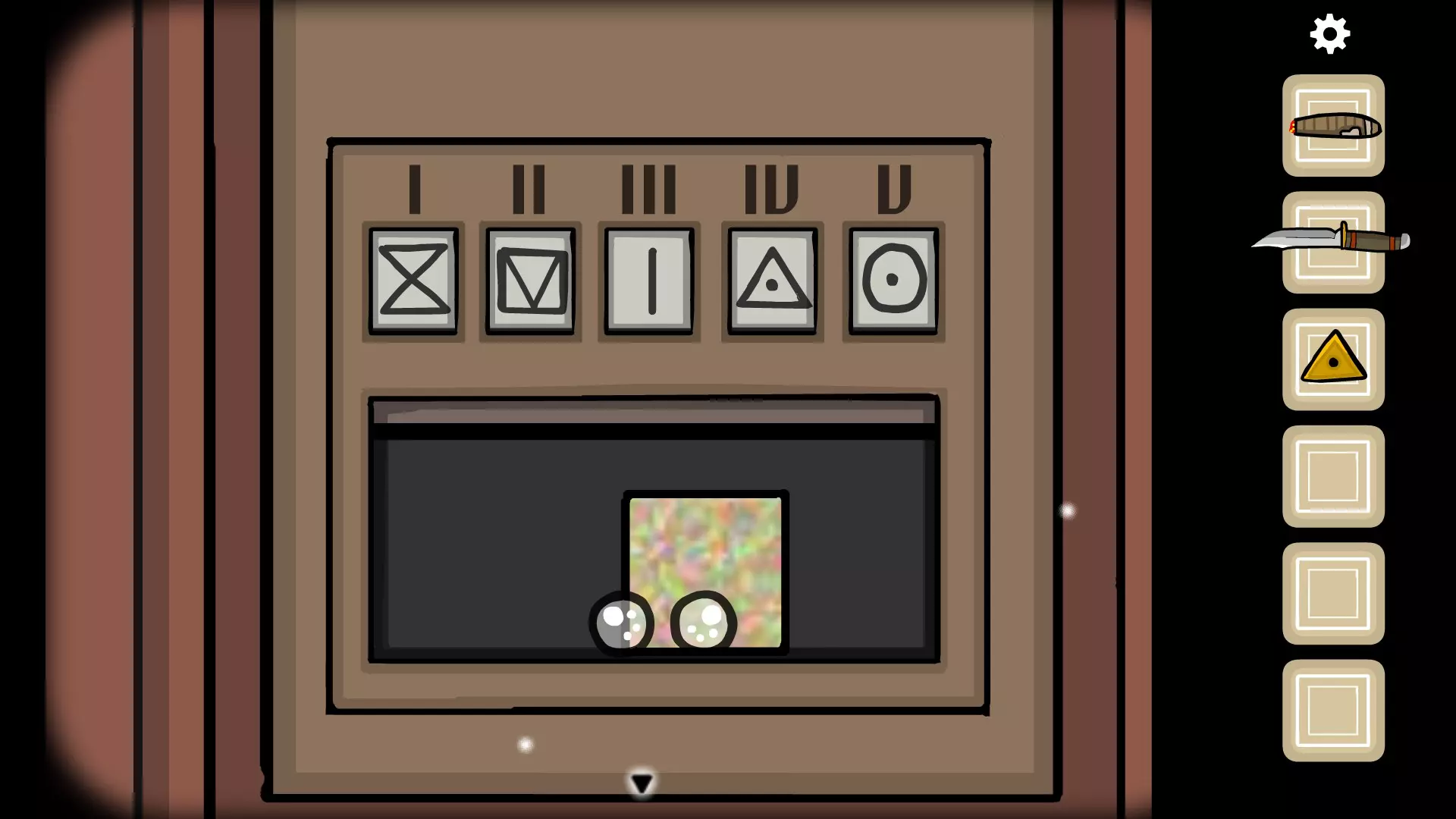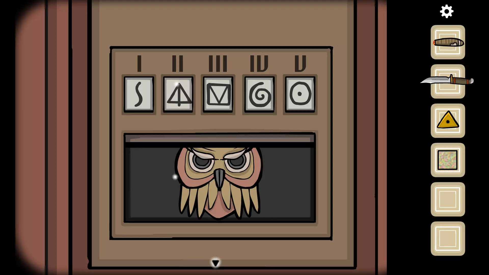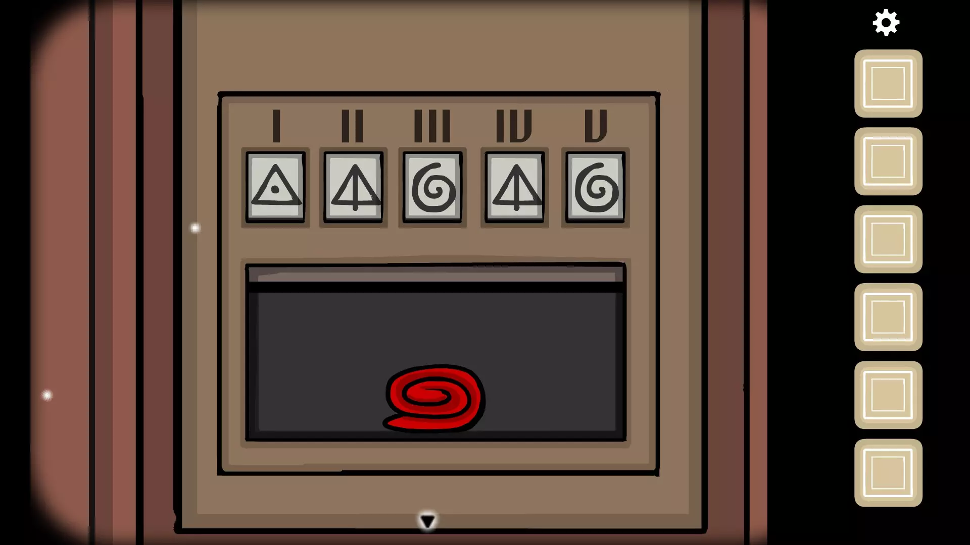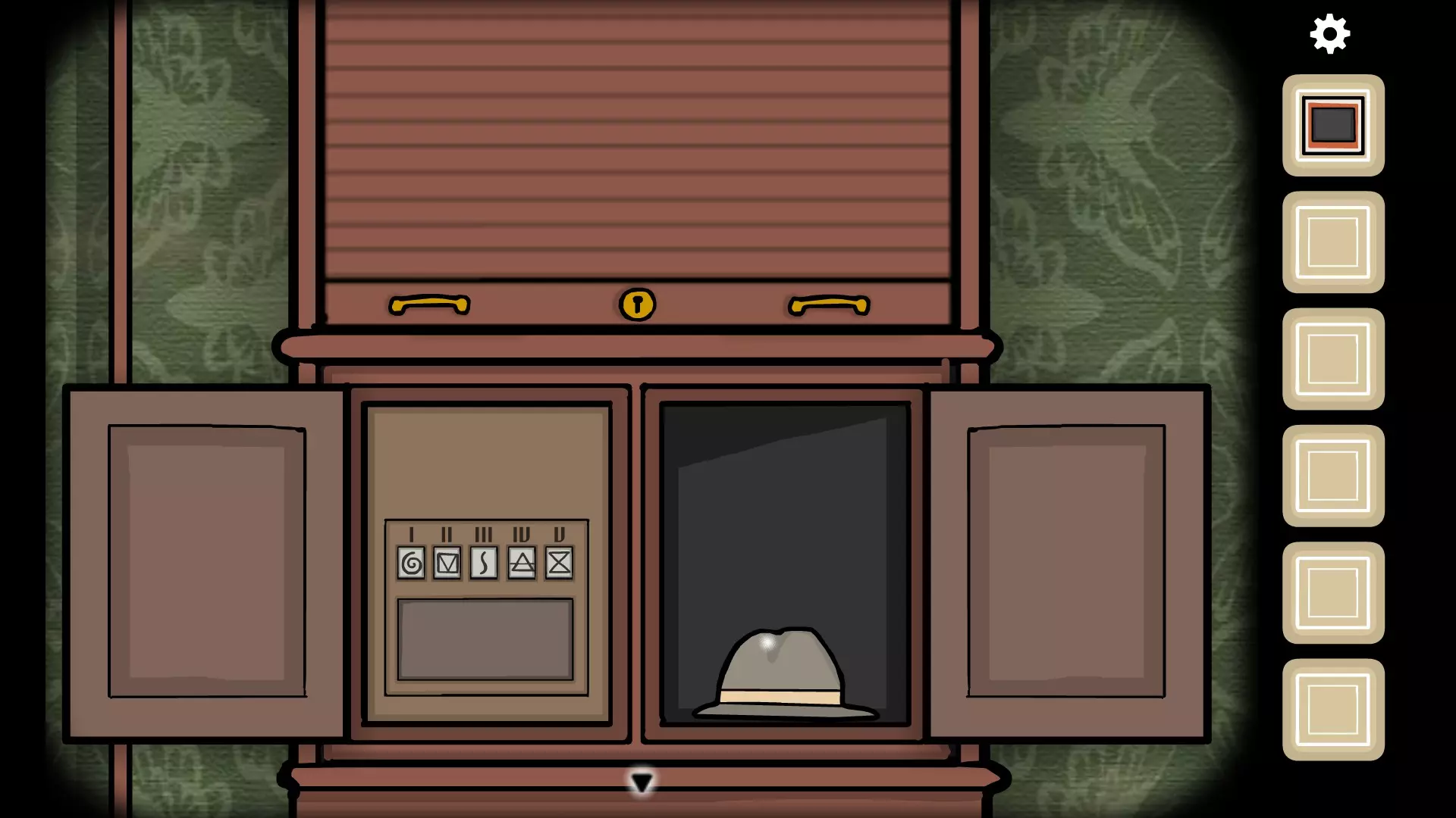 完成后,前往时钟处,将时间设置为8:05(8的位置为•,5的位置为X)以获取一把钥匙,然后前往书架(有密码箱的那个),打开右侧的门即可获得一顶帽子。