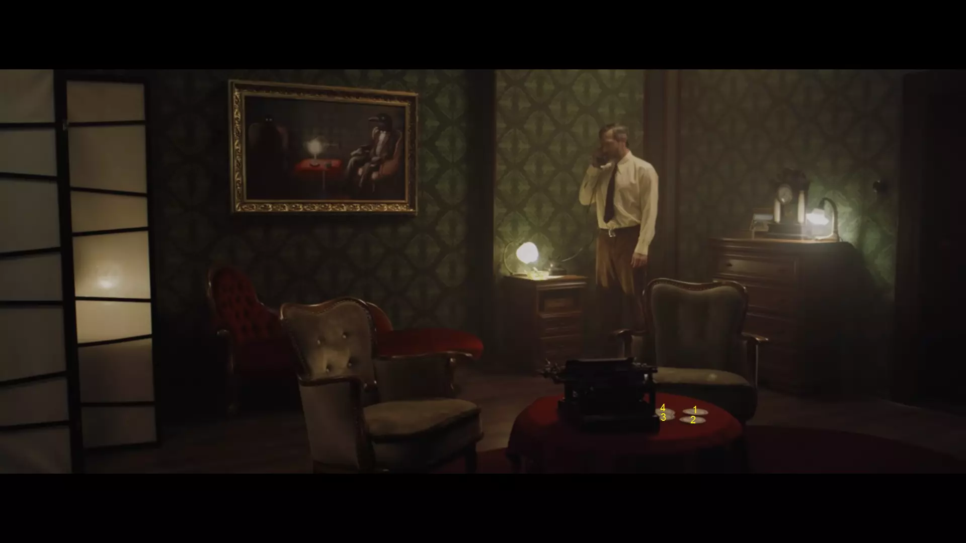 指南提示:电影中有一本来自某个已知家族的书,将其名字输入打字机。 解决方法: 在7:10时,戴尔靠近书架,可以看到【The Vanderbooms】这本书,位置与游戏提示中的书籍一致。前往打字机输入“the vanderbooms”。但在此之前需要先解开谜题,输入“the woman”,否则无法生效。