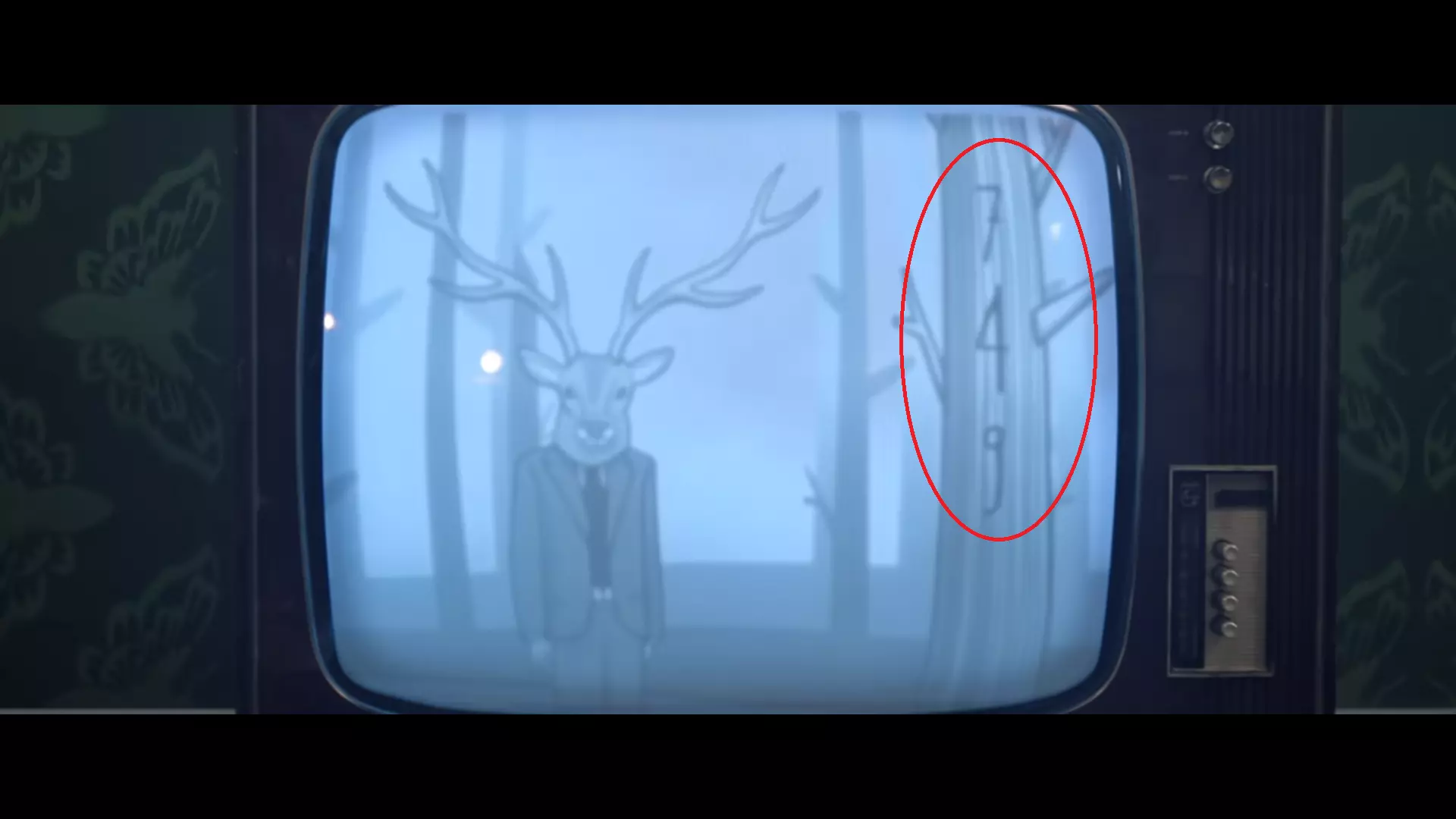 攻略提示:留意电影中戴尔在电视上看的内容,并寻找鹿。 解决方法:在9分23秒时,可以看到一个戴着鹿面具的人,旁边树上有3个数字,记下数字(749)并输入电视。