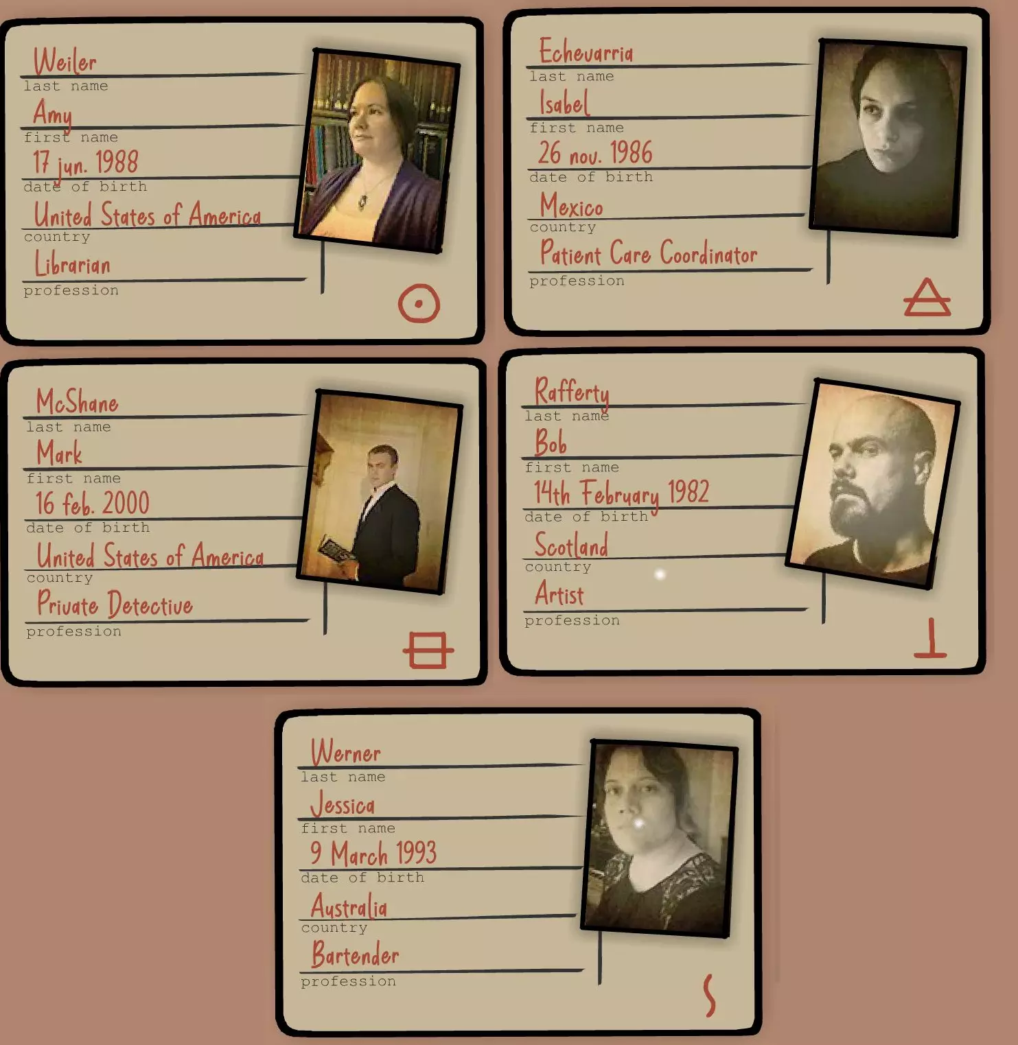 指南提示:将提示中的图像与电影场景关联起来,并寻找游戏中使用的符号 解决方法: 在电影中,在1分57秒、5分08秒、6分05秒、9分23秒、18分02秒处暂停画面 已解决的图片(按出现顺序):