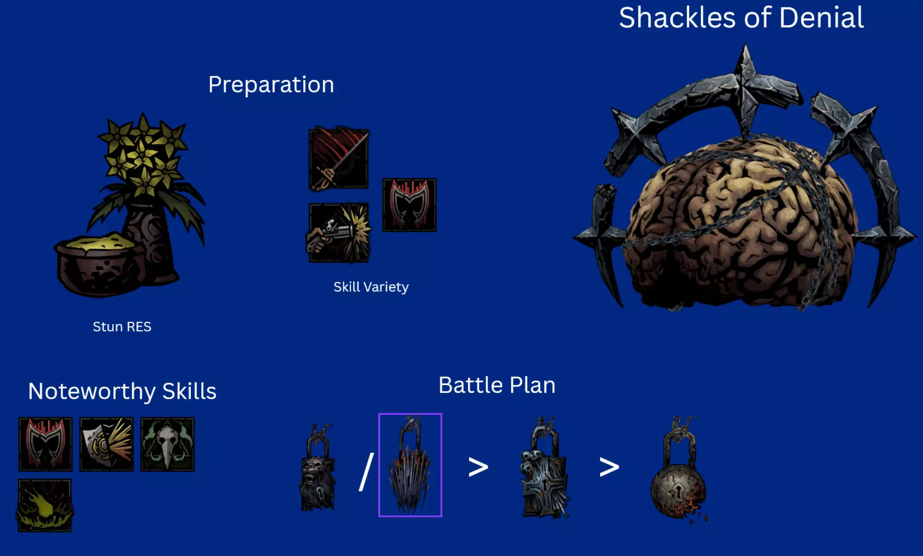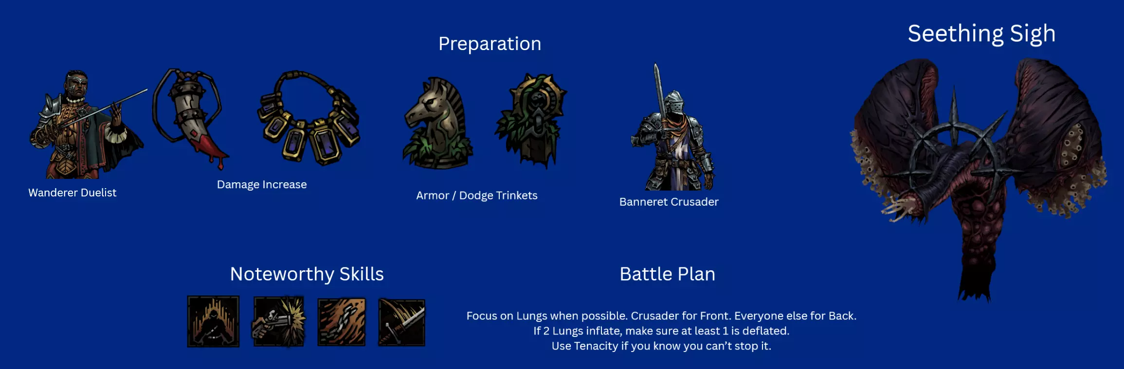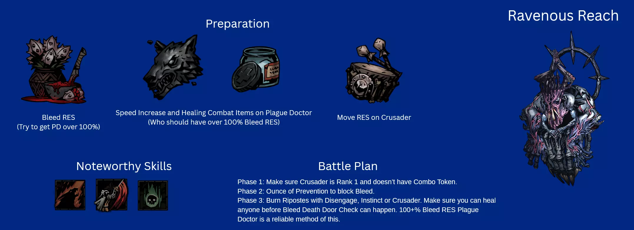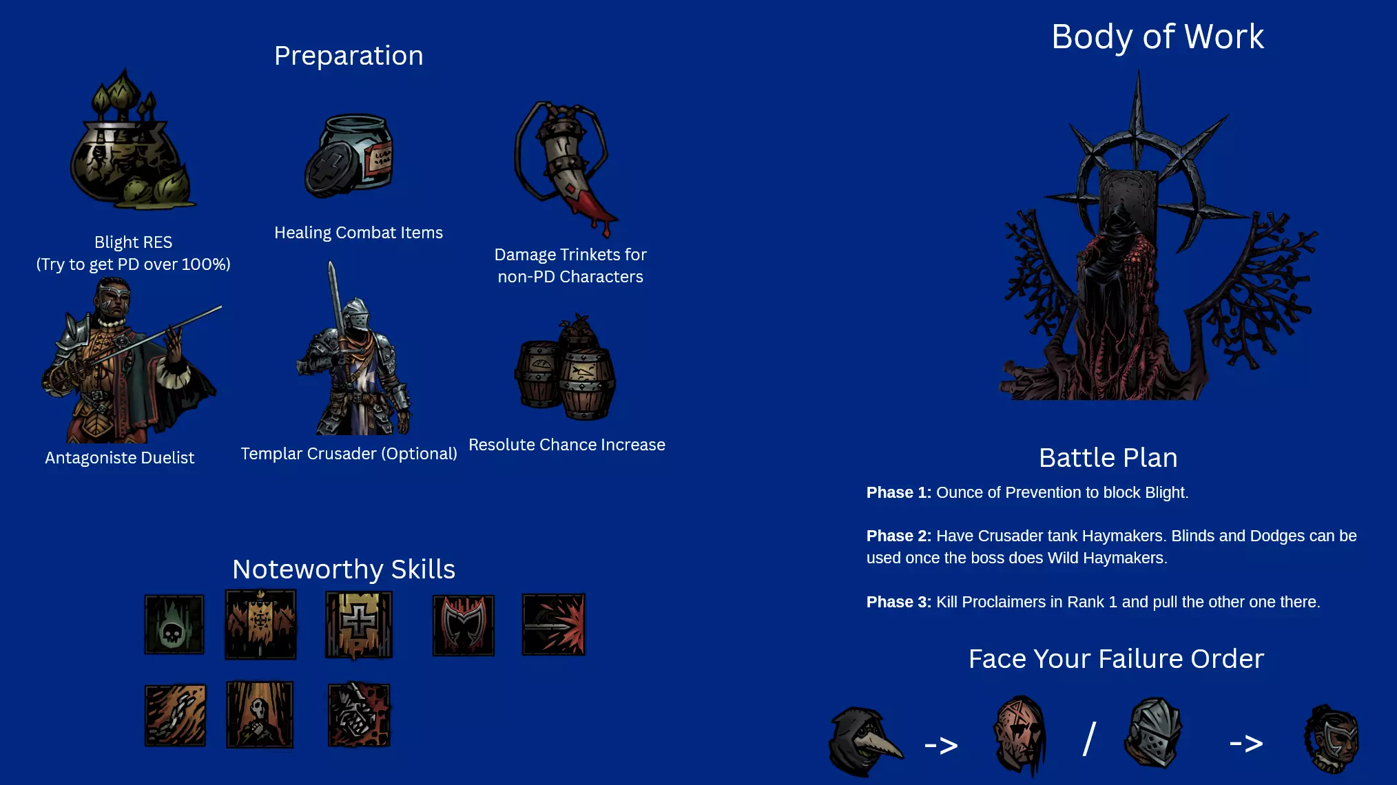 Recommended Skills: Noxious Blast, Plague Grenade, Battlefield Medicine, Indiscriminate Science Viable 5th slot skills: Ounce of Prevention, Magnesium Rain, Blinding Gas Despite the nerf to Plague Grenade, Alchemist PD is still one of the best heroes in the entire game. Innate Blight RES piercing means she does insane damage over time, Indiscriminate science provides insane debuff removal and battlefield medicine provides very strong DoT cleansing as well. If you see my other guide, PD is pretty much identical in every single way. Ounce of Prevention for Foetor, Sprawl, Ravenous Reach and Body of Work. Blinding Gas for Focused Fault. Magnesium Rain for Beast Dens and general encounters. General Pathing When going through regions, my priorities were: Avoid and Reduce Loathing. Loathing Boosted Bosses are end killers and its 100% optimal to End the Run at the Inn to preserve heroes instead of risking it. Plan your route to make sure avoid repair fights. There aren't run killers or anything but can be a slog. Go to Field Hospitals if there you have really bad traits or diseases. Go to assistance encounters for Flame, try to increase Flame if possible. I at most only ever selected -5 Flame options because low Flame gain result in some brutal scenarios (e.g. Quick Volleys in Tangle.) 99% of the time, I chose to fight my encounters has the minus flame + stress was too costly, and I rarely had enough relics to justify choosing that option. Although I would recommend not fighting the Chirurgeon unless you have significantly prepared yourself or are incredibly desperate to remove diseases as the risk is way higher than the rewards. Potential Threats ChirurgeonAvoid fighting the Chirurgeon if possible. I had way too many close calls against him and the rewards are not worth it. You need to bring heaps of Bleed RES as Bone Saw can easily rack up a lot of damage otherwise. Dreaming GeneralThe main thing with this fight is with how situational Duelist and Crusader have Rank 4 access. Giving them combat items that reach there + human Abomination using Manacles and PD will provide enough cover to last long enough before the vines strangle you out. Harvest ChildMake sure that Harvest Child doesn't get to Front as then it'll use Maws of Life which hurts. Debuff RES and Bleed RES is recommended. Careful planning around preventing Feed the Hunger can be done and is very rewarding. For example, you could have your Speed boosted Abomination move to Rank 2 with Slam before the Putrid Meat can use its attack so that only the Crusader is at risk of using Feed the Hunger, not the Duelist as well. Shackles of DenialI will not lie, its kind of embarrassing how much I struggled with this boss. It was my 3rd boss in my route, I thought it would be an easy chance to try to roll for +1 blight damage on Plague Doctor because I still didn't have that memory. How wrong I was. My Grand Slam attempt almost ended there. Do not underestimate Shackles of Denial. I would honestly put them 4th in future grand slams (Assuming 4 DLC character Grand Slam is even possible.) Stun Resist on PD is a friend, by aware that Abomination will spend half his turns unable to transform because transform is a stress and healing skill and the other half unable to use half his skills in human and beast form the other half the time. I would recommend getting rid of the Denial of Arms locket first as Crusader, Duelist and Beast Form like Melee and PD can use buffs or heals to pass Denial of Arms turns. Seething SighThis is the first boss I recommend people to go for because its a perfect blend of challenge, warm up and practise to make sure your team is balanced enough to handle a Grand Slam. Due to the nerfs Seething got, it is much easier but still needs to be respected. Wanderer Duelist is needed here for Coup de Grace's damage as Manacles + Plague Grenade might not be enough. Focused FaultThis boss is the closest thing to an anti-Grand Slam enemy because of how it focuses 1 hero incredibly hard, but there are many ways to deal with it. Changing Duelist to Antagoniste is potentially optimal for Phase 2. Phase 1The main thing here is that you want to make sure that PD has little to no Seen tokens by end of this phase. It may also be preferable if Duelist is the one being Seen due to how Phase 2 works. Phase 2With Dodge+ tokens on Mediation+ and either a Dodge+ or 2 blinds on Disengage+, Duelist is the best hero for this boss and can easily dodge tank her way to victory. Blinding Gas is also beneficial here if someone that isn't Duelist is being targeted. Crusader and Abomination have enough self sustain and damage mitigation that they can also be targeted without much worry. Ravenous ReachWith 3 Phases, Ravenous Reach has a lot of tools that can cause massive issues for less prepared teams. Clotting Poultice is a vital inn item in reducing the risk of Bleeds for Phases 2 and 3. You ideally want to make sure your fastest character have over 100% bleed resist and have a healing item equipped. Plague Doctor is perfect for this role. Phase 1Move Resist Trinkets or Inn items are invaluable here as they can easily protect the target of Ideation from harm. The Blocks from Bulwark of Faith do massive lifting here, making sure that Crusader doesn't get to hammered. Coup de Grace and Flick on Duelist can bypass the blocks and PD / Abomination / Duelist Ripostes don't mind doing less damage due to the supportive utility of their skills. Phase 2Upgraded Ounce of Prevention + Clotting Poultice do massive lifting here. Some debuff resist inn items wouldn't hurt either as the debuff does lower your Bleed RES. Dodge tokens can be removed with Flick or Slam+ and can be easily be burned through with Duelist ripostes. Phase 3Last Grasp is an incredibly scary attack, that will put any bleeding heroes to Death's Door very quickly but because it lifts the Bleed, they aren't at a major risk of being hurt before you can heal them. Removing the Riposte with Abomination 