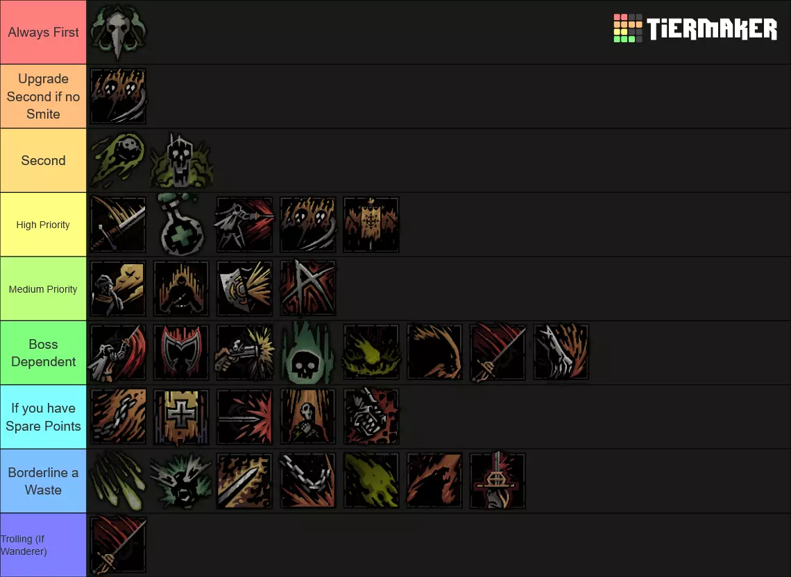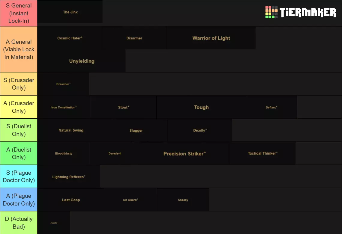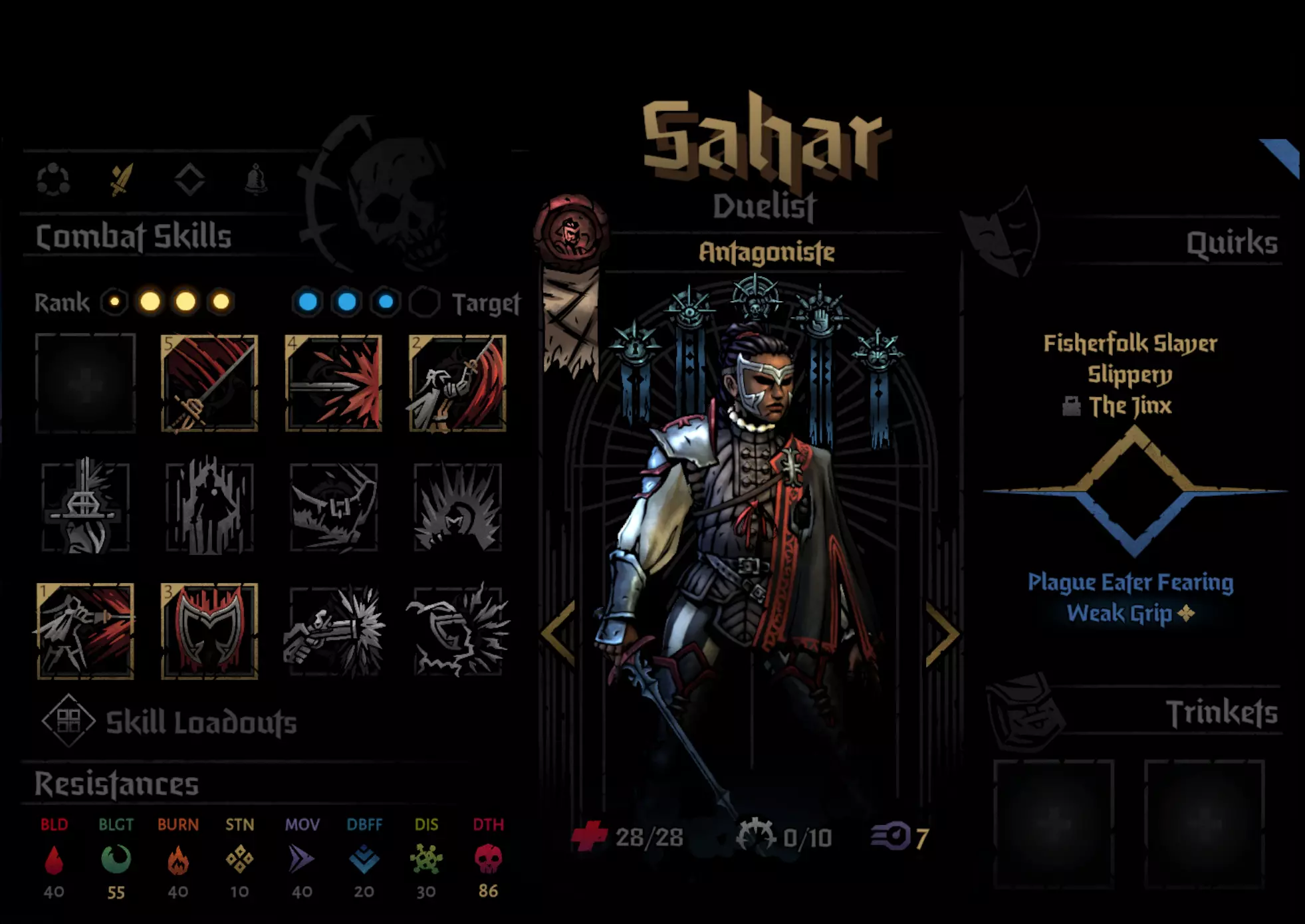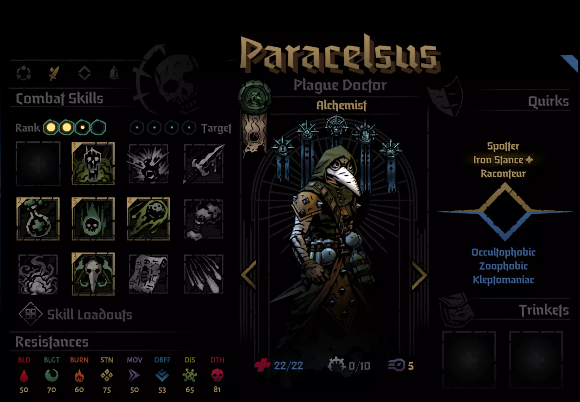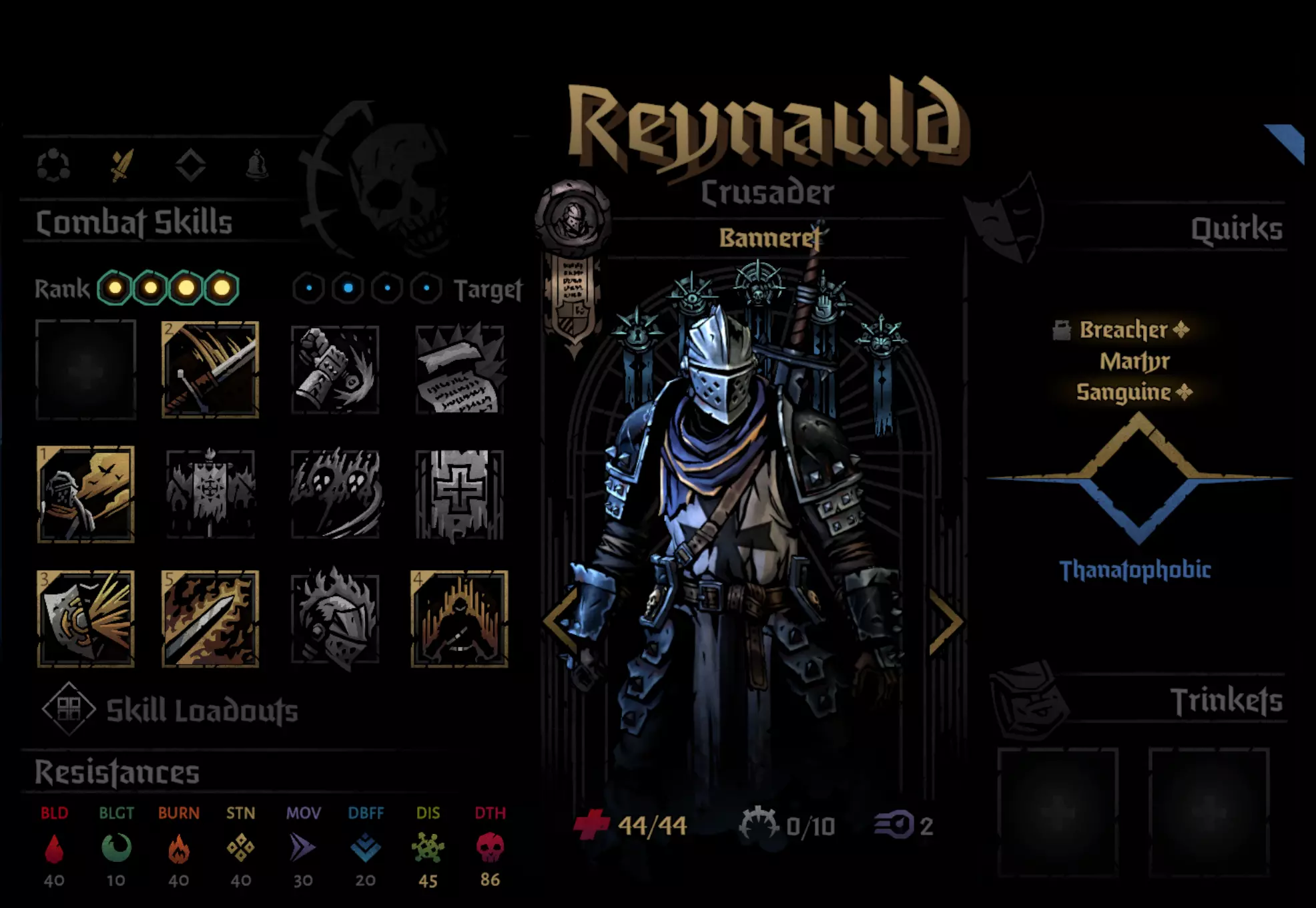 Recommended Skills: Noxious Blast, Plague Grenade, Battlefield Medicine, Indiscriminate Science Viable 5th slot skills: Ounce of Prevention, Magnesium Rain, Blinding Gas Despite the nerf to Plague Grenade, Alchemist PD is still one of the best heroes in the entire game. Innate Blight RES piercing means she does insane damage over time, Indiscriminate science provides insane debuff removal and battlefield medicine provides very strong DoT cleansing as well. If you see my other guide, PD is pretty much identical in every single way. Ounce of Prevention for Foetor, Sprawl, Ravenous Reach and Body of Work. Blinding Gas for Focused Fault. Magnesium Rain for Beast Dens and general encounters. General Pathing When going through regions, my priorities were: Avoid and Reduce Loathing. Loathing Boosted Bosses are end killers and its 100% optimal to End the Run at the Inn to preserve heroes instead of risking it. Plan your route to make sure avoid repair fights. There aren't run killers or anything but can be a slog. Go to Field Hospitals if there you have really bad traits or diseases. Go to assistance encounters for Flame, try to increase Flame if possible. I at most only ever selected -5 Flame options because low Flame gain result in some brutal scenarios (e.g. Quick Volleys in Tangle.) 99% of the time, I chose to fight my encounters has the minus flame + stress was too costly, and I rarely had enough relics to justify choosing that option. Although I would recommend not fighting the Chirurgeon unless you have significantly prepared yourself or are incredibly desperate to remove diseases as the risk is way higher than the rewards. Potential Threats ChirurgeonAvoid fighting the Chirurgeon if possible. I had way too many close calls against him and the rewards are not worth it. You need to bring heaps of Bleed RES as Bone Saw can easily rack up a lot of damage otherwise. Dreaming GeneralThe main thing with this fight is with how situational Duelist and Crusader have Rank 4 access. Giving them combat items that reach there + human Abomination using Manacles and PD will provide enough cover to last long enough before the vines strangle you out. Harvest ChildMake sure that Harvest Child doesn't get to Front as then it'll use Maws of Life which hurts. Debuff RES and Bleed RES is recommended. Careful planning around preventing Feed the Hunger can be done and is very rewarding. For example, you could have your Speed boosted Abomination move to Rank 2 with Slam before the Putrid Meat can use its attack so that only the Crusader is at risk of using Feed the Hunger, not the Duelist as well. Shackles of DenialI will not lie, its kind of embarrassing how much I struggled with this boss. It was my 3rd boss in my route, I thought it would be an easy chance to try to roll for +1 blight damage on Plague Doctor because I still didn't have that memory. How wrong I was. My Grand Slam attempt almost ended there. Do not underestimate Shackles of Denial. I would honestly put them 4th in future grand slams (Assuming 4 DLC character Grand Slam is even possible.) Stun Resist on PD is a friend, by aware that Abomination will spend half his turns unable to transform because transform is a stress and healing skill and the other half unable to use half his skills in human and beast form the other half the time. I would recommend getting rid of the Denial of Arms locket first as Crusader, Duelist and Beast Form like Melee and PD can use buffs or heals to pass Denial of Arms turns. Seething SighThis is the first boss I recommend people to go for because its a perfect blend of challenge, warm up and practise to make sure your team is balanced enough to handle a Grand Slam. Due to the nerfs Seething got, it is much easier but still needs to be respected. Wanderer Duelist is needed here for Coup de Grace's damage as Manacles + Plague Grenade might not be enough. Focused FaultThis boss is the closest thing to an anti-Grand Slam enemy because of how it focuses 1 hero incredibly hard, but there are many ways to deal with it. Changing Duelist to Antagoniste is potentially optimal for Phase 2. Phase 1The main thing here is that you want to make sure that PD has little to no Seen tokens by end of this phase. It may also be preferable if Duelist is the one being Seen due to how Phase 2 works. Phase 2With Dodge+ tokens on Mediation+ and either a Dodge+ or 2 blinds on Disengage+, Duelist is the best hero for this boss and can easily dodge tank her way to victory. Blinding Gas is also beneficial here if someone that isn't Duelist is being targeted. Crusader and Abomination have enough self sustain and damage mitigation that they can also be targeted without much worry. Ravenous ReachWith 3 Phases, Ravenous Reach has a lot of tools that can cause massive issues for less prepared teams. Clotting Poultice is a vital inn item in reducing the risk of Bleeds for Phases 2 and 3. You ideally want to make sure your fastest character have over 100% bleed resist and have a healing item equipped. Plague Doctor is perfect for this role. Phase 1Move Resist Trinkets or Inn items are invaluable here as they can easily protect the target of Ideation from harm. The Blocks from Bulwark of Faith do massive lifting here, making sure that Crusader doesn't get to hammered. Coup de Grace and Flick on Duelist can bypass the blocks and PD / Abomination / Duelist Ripostes don't mind doing less damage due to the supportive utility of their skills. Phase 2Upgraded Ounce of Prevention + Clotting Poultice do massive lifting here. Some debuff resist inn items wouldn't hurt either as the debuff does lower your Bleed RES. Dodge tokens can be removed with Flick or Slam+ and can be easily be burned through with Duelist ripostes. Phase 3Last Grasp is an incredibly scary attack, that will put any bleeding heroes to Death's Door very quickly but because it lifts the Bleed, they aren't at a major risk of being hurt before you can heal them. Removing the Riposte with Abomination 