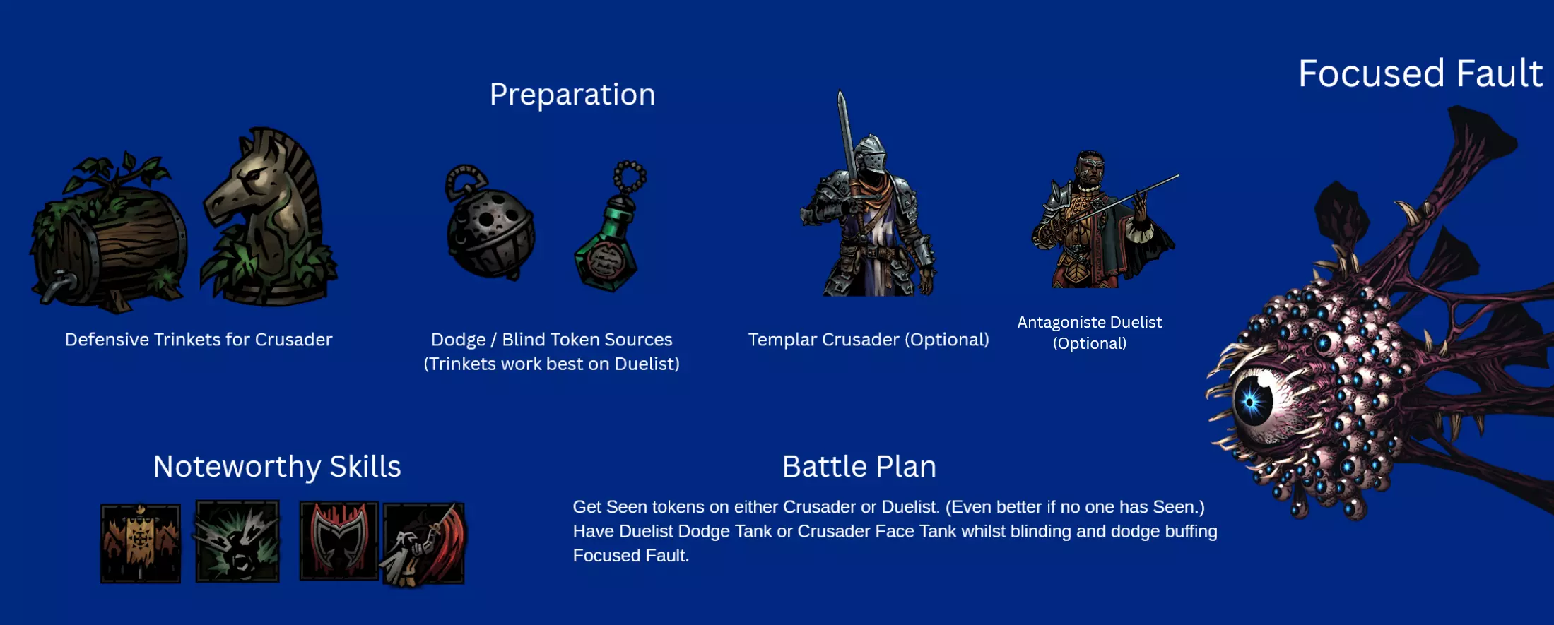 The most efficient and stupid way to get all 5 Memory DLC character achievements. Preface SINCE JULY 2025, PLAGUE DOCTOR'S PATHS HAVE BEEN REWORKED. In my opinion the only main change to this guide needed is to swap Plague Doctor's Path to Wanderer as Abomination applies enough Combo tokens to offset the reduced Blight chance on skills. UPDATE (October 2025): Due to IRL commitments and the video footage is now out of date due to Plague Doctor's Paths being reworked, I will no longer be working on that video. It also means this guide will not be well maintained anymore because of the outdated strategies. If there is another DLC hero released, I will probably make another Guide / Video on that. NOTE 2: This guide is a small variation of the other Grand Slam team guide I made with Crusader and Duelist which I highly recommend looking at over this one. This guide for those who cannot be bothered to go 2-3 full playthroughs for each DLC character and instead do it in 1. As such, this team is a mess with many flaws and is way more risky than the Crusader + Duelist and most other Grand Slam teams. In addition, I am godawful at using the Abomination as my playstyle does not lend itself well to how Abomination is best used. That being said, if you are mad enough, you can earn the following achievements at the same time with this team comp: A Life Well Lived: Apply 5 Memories to any Hero Inquisition's Prize: Apply 5 Memories to the Abomination Maître De La Lame: Apply 5 Memories to the Duelist Battle Hardened: Apply 5 Memories to the Crusader Grand Slam: Defeat all 5 confession bosses with the same four heroes without any of them dying Which is a very impressive feat that requires good planning, decision making and smidge of luck. Read on if you dare. Prerequisites The Binding Blade and Inhuman Bondage DLC (Required obviously) Unlocked the following Skill Paths: Banneret Crusader, Antagoniste Duelist and Plague Doctor Alchemist. Fully Completed the Crusader, Duelist and Abomination's Shrine of Reflection. Complete Chapter 3 of Plague Doctor's Shrine of Reflection.Recommended Upgrades/Unlocks Fully upgraded Timeless Wood. Unlocked Templar Crusader. Full Living City hero upgrades. Unlocking all Skills on Plague Doctor. At least the Orphan Wolf Cub pet but Reanimated Rabbit is preferred. 3 Wheels and 3 Armour on Stagecoach. Blight and Fire RES piercing Trinkets. Annotated Textbook, Early Experiment and Lover's Glove hero trinkets. Why this is a bad idea For a Grand Slam team comp to succeed, it needs to contain some of the following attributes: - Reliable and Strong Healing. Keeping your party healthy at all times will minimise risk of losing a hero and forcing a restart. - Reliable and Strong Tank. Someone needs to be able to take massive damage from boss crits at a moments notice and not waver. This is so that your less tanky heroes are well protected. - Flexible reach and damage. Many enemies and bosses have unique strengths and weaknesses thus a team comp needs to be able to kill any threat thrown to them. So what are the problems with Abomination, Duelist and Crusader? 1. No great tanking. Crusader is the best out of all 3 of them and he isn't a bad tank per say, but there is definitely way better. Man-At-Arms has stronger 75% blocks and rank flexible guarding, Flagellant has insane self-sustain and Chaplin Vestal provides strong healing to allies while guarding them. Crusader has decent utility but it doesn't help him stay alive that well. In addition, Bulwark of Faith has a 2 turn cooldown which means its very likely that multiple attacks may target vulnerable allies. 2. Rank 1-2 heavy. All of each character's strongest damage options are available at either ranks 1 or 2. This would normally mean you would have a frequently rotating team throwing out their strongest skills constantly, however there are some utility skills that throw this plan out of whack. Most notably, Crusader needs to be Rank 1/2 to taunt and sometimes that 1 turn without a taunt is just too risky. This mostly resulted in abomination staying in rank 3 spamming manacles for combo tokens which is a mildly inefficient use of the slot and in a Grand Slam, there is little space for dead weight. Summary and Infographics If you have seen my other guide, most of this stuff is pretty similar, especially anything regarding Duelist and Plague Doctor as they are largely unchanged in their role and moveset. Since I recorded my entire Grand Slam, I am planning to make a Youtube video to compliment this guide with video footage showing major fights as well as just general Grand Slam / DD2 tips. SkillsSkills to Equip