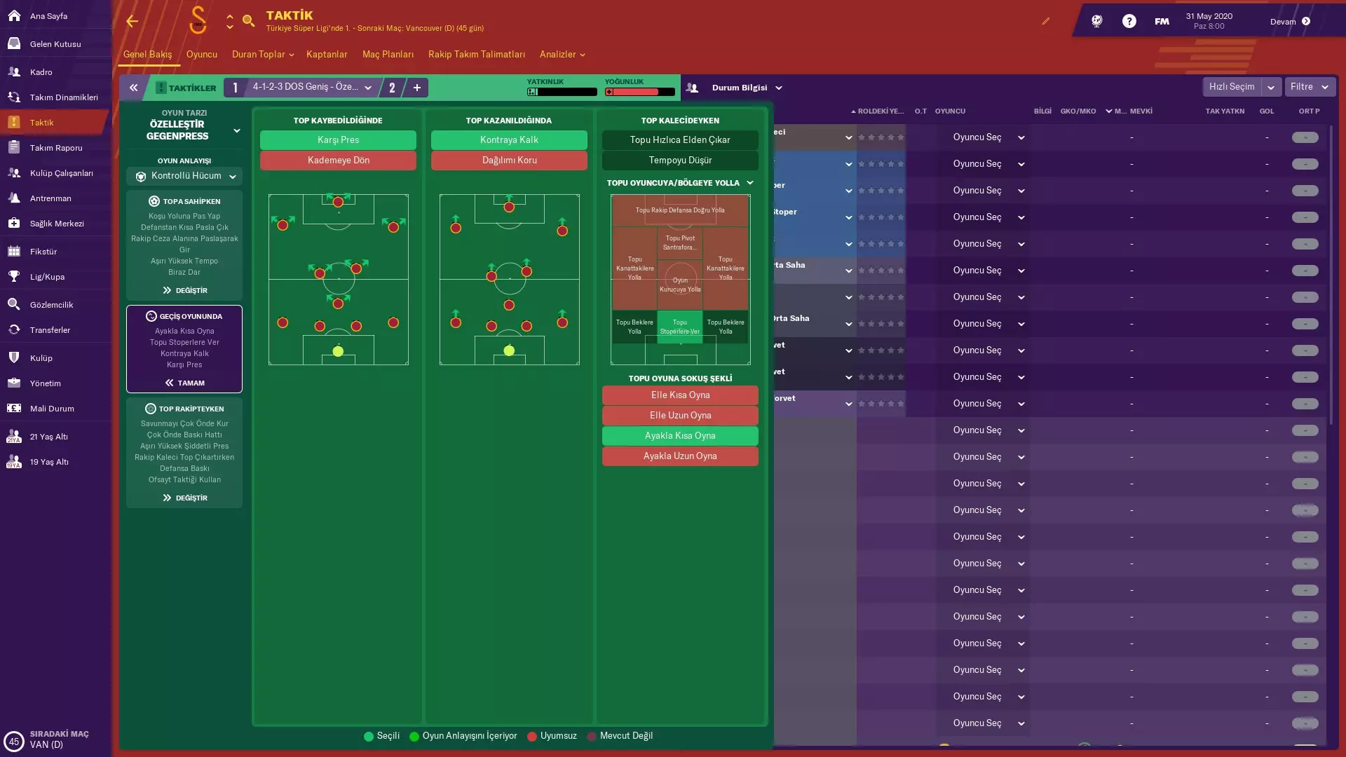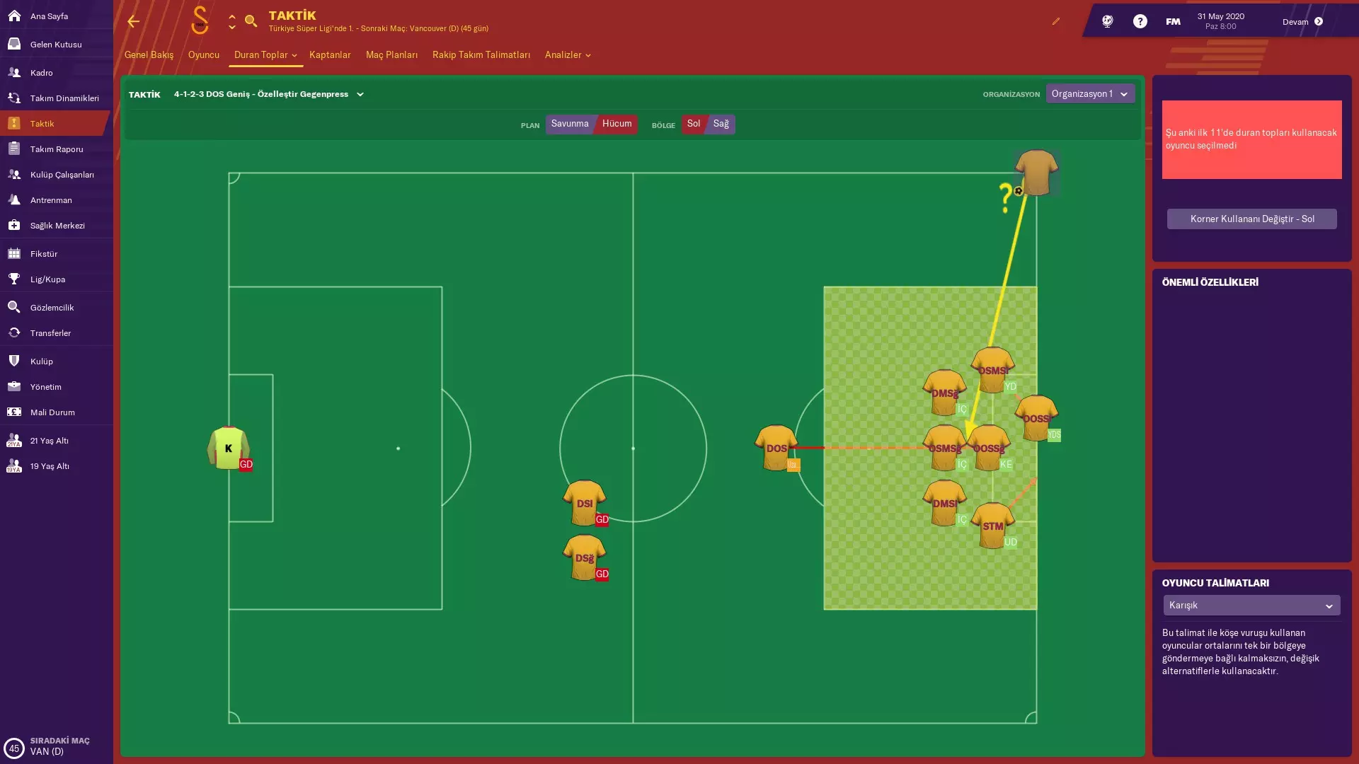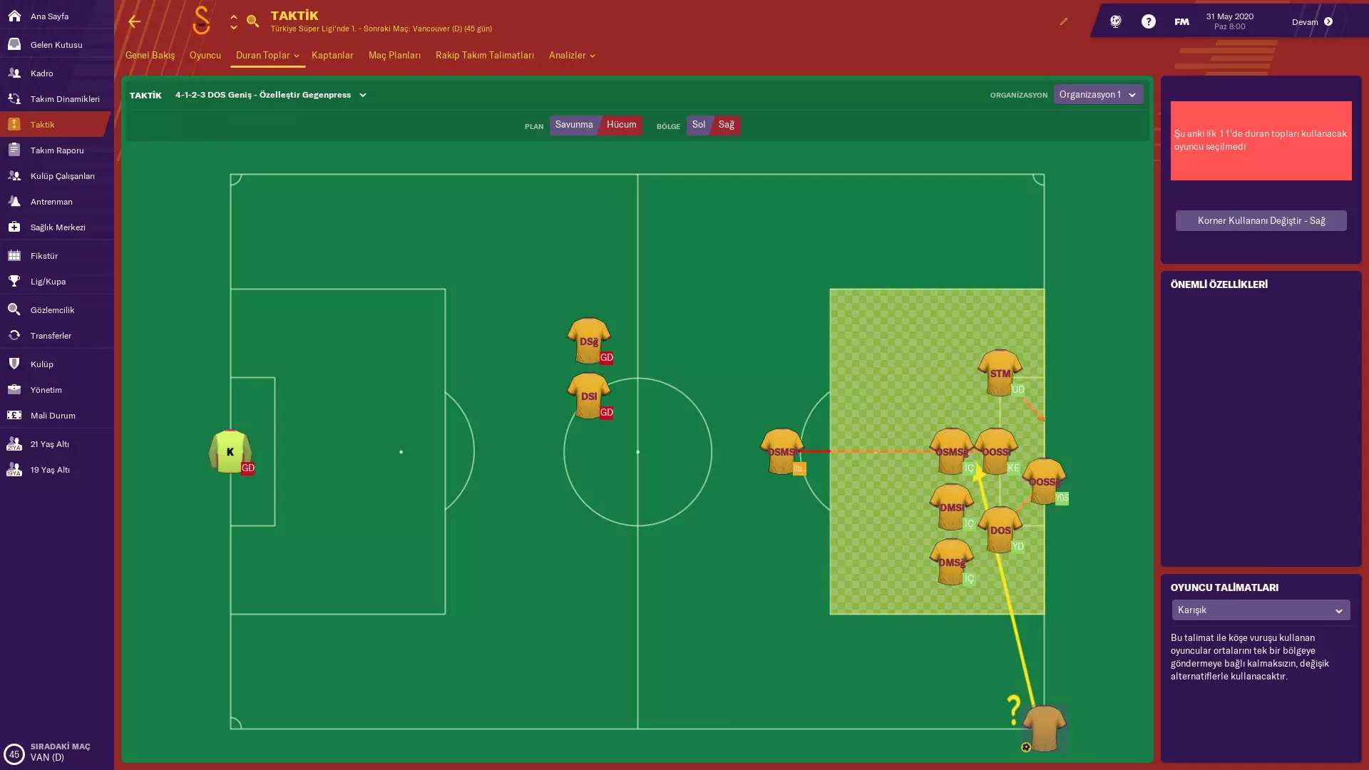 我用这套战术执教加拉塔萨雷两个赛季,效果非常好。使用这套战术,你能轻松夺回球权,也能轻松对对手施加压力并打入很多进球。 战术 以下是具体战术,你可以根据需要进行调整,例如可以让右后卫和左后卫前压。
