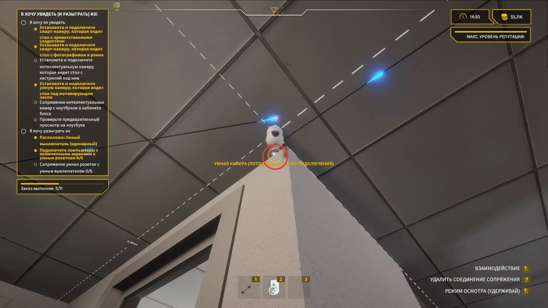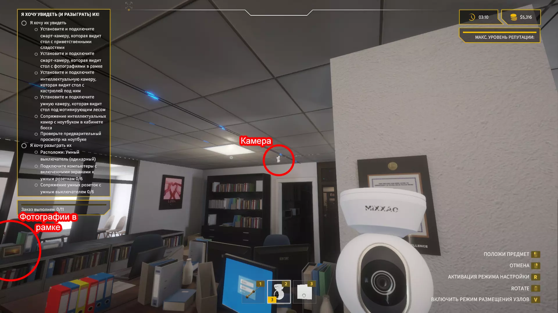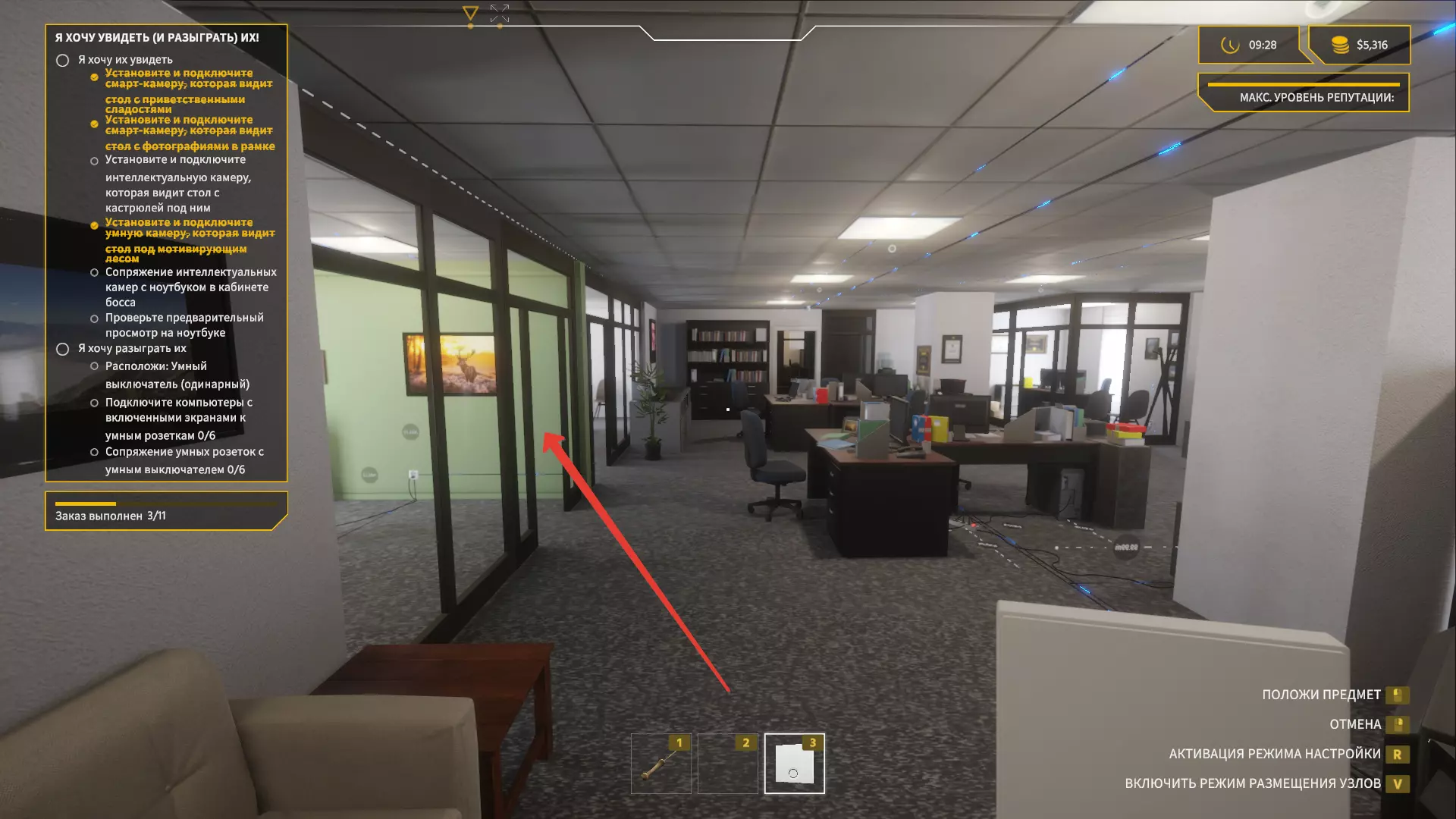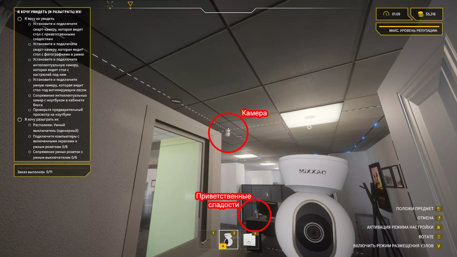 我们一打开门,就看向左上角,拿起【智能相机】并安装在天花板上。