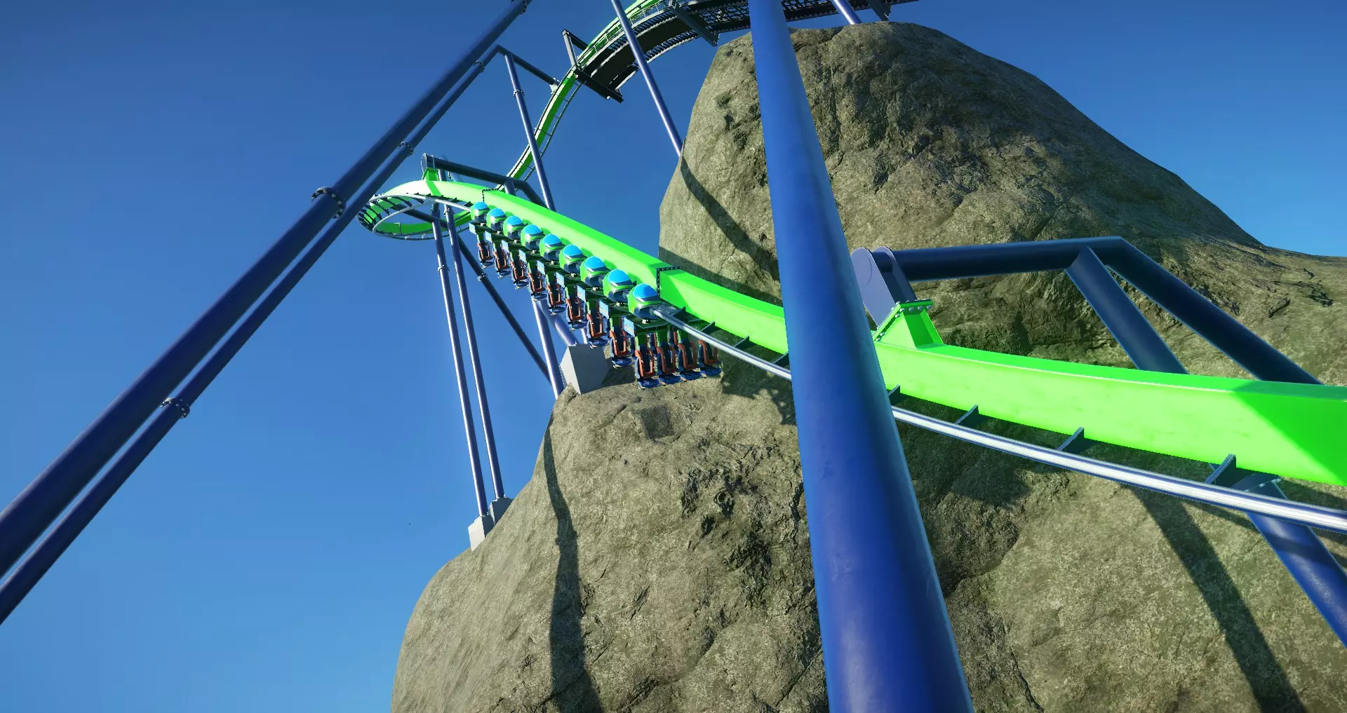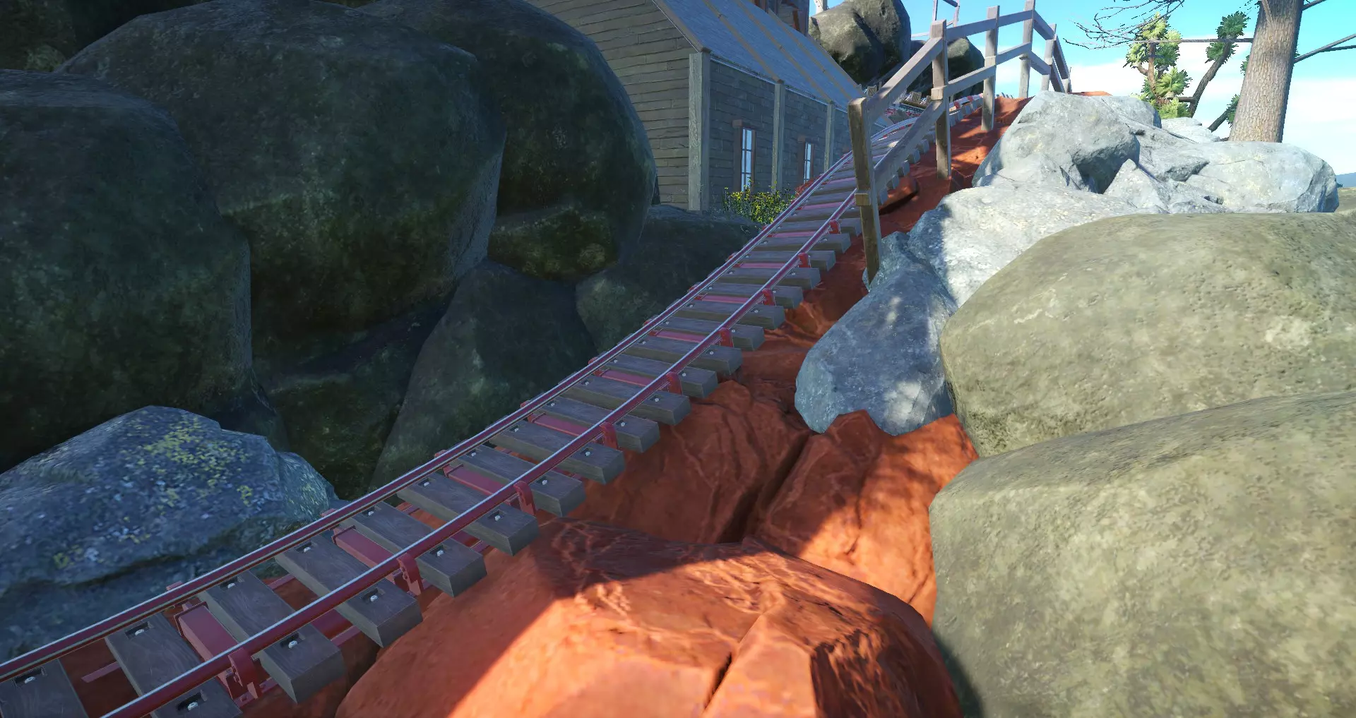 我发现禁用过山车碰撞检测最实用的原因是可以将景物建得比游戏通常允许的更靠近轨道,如下方图片所示。启用过山车碰撞检测的话,我就无法把岩石建得离轨道那么近了。