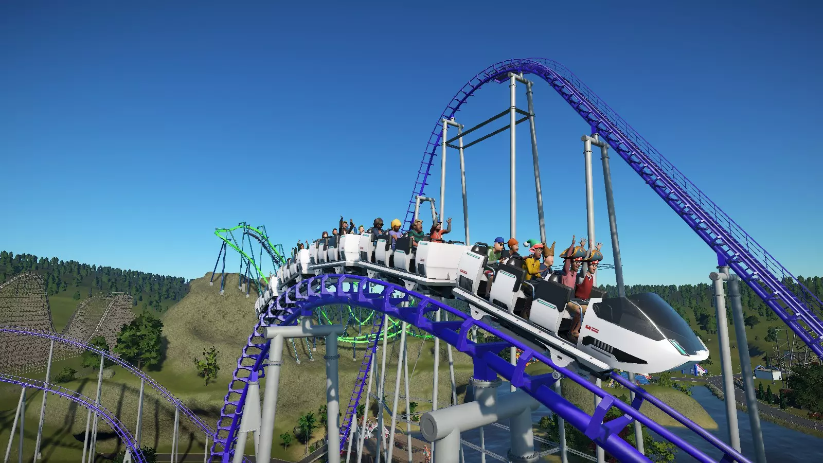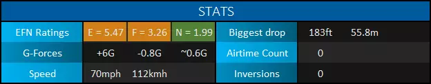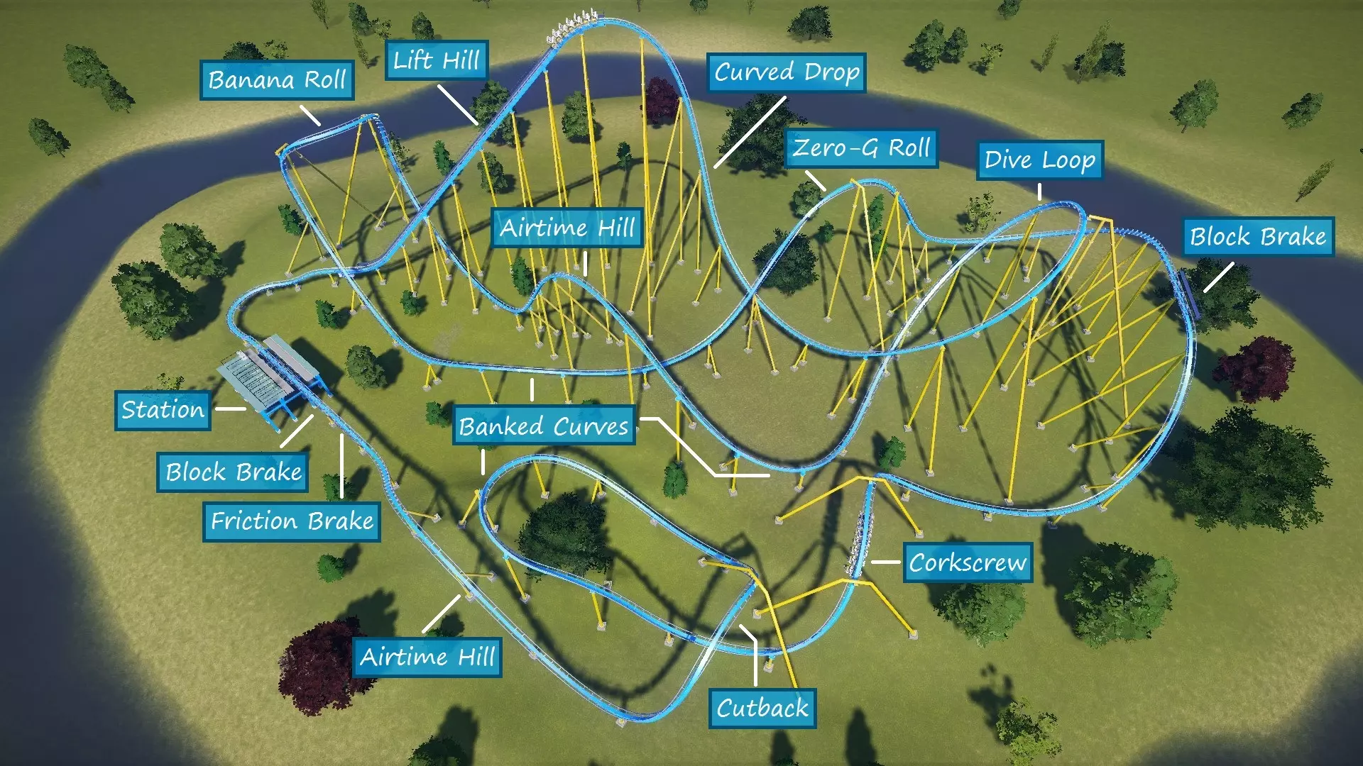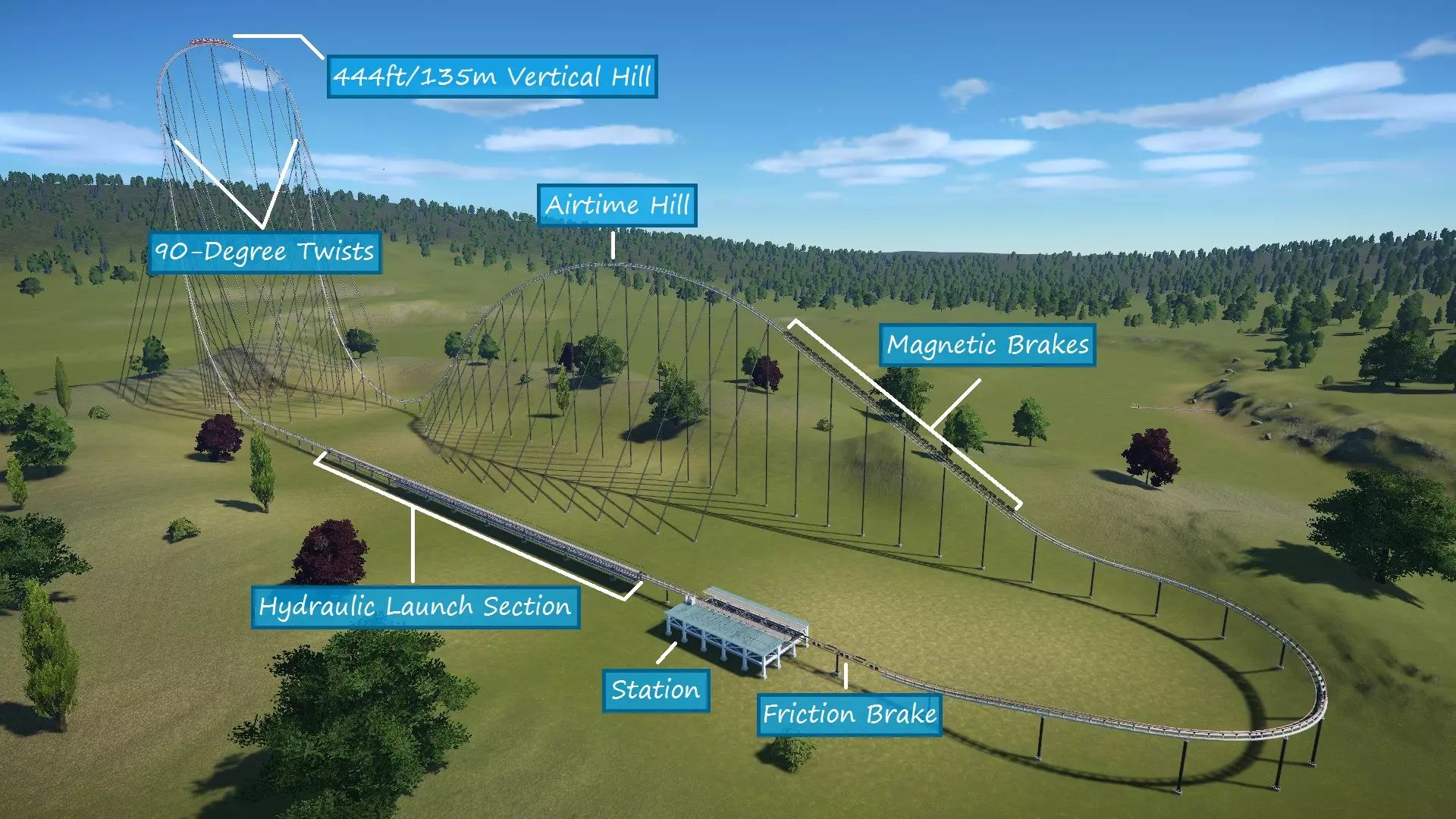 So there you have it! I wanted to share my knowledge to help out those who are just starting out and/or are struggling to build a coaster that they (and their guests) are pleased with. Hopefully you learned a thing or two in this guide. Coaster designing can seem difficult and intimidating at first, but with some practice you will be designing some amazing thrillers! Just remember to have fun and let your creativity take over! Thanks for taking the time to read this guide. If it helped you, please rate it up, favorite it, and share it with fellow coaster friends! Also, please feel free to drop suggestions, corrections, and any other feedback you may have in the comments. Happy coaster building! :) BlueprintsIf you want to try out some of the sample coasters used in this guide, here they are! http://steamcommunity.com/sharedfiles/filedetails/?id=922097225 I will be adding to this list as time allows. Unfortunately, a few coasters were lost when I overwrote the savegames of the parks they were in (poor decision on my part). I may make a few new coasters to replace them and update the guide and collection with the new ones. Planned Guide ChangesHere are some of the things I plan to work on as time allows: Finish discussing special track layouts. Proofread / correct spelling errors. I promise English is my first language and I speak it fluently. It doesn't always show when I type stuff out, though. Replace sample coasters that were lost in savegame overwriting with new layouts. Restyle some of the older labeled screenshots for improved consistency, color, and readablilty. The "Ride Operations" section contains both of my previous label styles (no color, then solid colors). "Triggered Events" has the newest labels with translucent color. Current Guide Changes[4/18/17] - Added new info to "Stations" section. [4/19/17] - Added new info to "Track Banking" sub-section. [4/20/17] Added metric equivalents/approximations alongside all relevant measurements. ("EFN Ratings") Added the rating scale for nausea. "Brakes" section is now directly above "Blocks and Block Brakes" for better continuity. Various spelling/wording fixes. ("Chain Lifts / Cable Lifts") Replaced a screenshot. ("Special Track Layouts") Added "Strata Coasters".[4/21/17] Rounded off several metric equivalents to neater values (ending in even numbers or 5) to seem more natural to metric-minded readers. Only edited where relative approximates are acceptable. Started work on coaster editor section to explain basics of the editor to new players and coaster builders.[4/22/17] - Coaster editing sections no longer considered work in progress. Still subject to edits/additions as I see fit. [4/23/17 - 4/25/17] (Forgot to document a few edits, sorry) New "Deuling Coasters" and "Ride Operations" sections. A number of spelling edits.[4/27/17] New section: Ride Customization Finished up a few sections and unmarked them as work in progress.[4/30/17] New Section: Triggered Events ("Coaster Editing 1") Re-labeled screenshot with new labeling style for consistency with other labeled screenshots. Updated intro/conclusion to reflect the current status of the guide.[5/08/17] - Created a link to the collection of sample coaster blueprints. [5/09/17] "Putting It All Together: Basic Layouts" renamed to "Basic Layouts and Landscaping". ("Basic Layouts and Landscaping") New sample wooden coaster to replace the previous one. Blueprint ("Sasquatch") added to the sample coasters collection. ("Basic Layouts and Landscaping") Landscapcing sub-section added.[5/29/17] A couple of new/modified pics, including edited labeled coaster pics. General wording/spelling edits.[6/01/17] I am now putting the date of the latest significant guide update (not including minor wording/spelling edits) in the description. Whenever this date changes, please check back to see what's new! ("Triggered Events") Removed duplicate image.[6/02/17] Recreated sample wooden duelling coaster in "Duelling Coasters". Blueprint ("Ridgeline") added to the sample coasters collection. ("EFN Ratings") Rating scales now displayed in a table format. ("Coaster Editing 2") A few informational additions. [6/07/17] - ("Chain Lifts/Cable Lifts") New guidlines added for smaller coasters. [6/19/17] - ("Chain/Cable Lift and Drive Tires") New / reorganized info. [6/26/17] - ("Sample Layouts 1") New Layout for boomerang coasters. Blueprint ("Rewind") added to the sample coasters collection. [6/27/17] - Revisions for Update 1.3 [7/01/17] ("Choosing a Track Type") New table to allow for better formatting and more entries as the game updates (I was bumping the word limit for that section). ("Triggered Events") Info and screenshots revised for Update 1.3 ("Powered Launch") Replaced pic. The other one looked a little tacky :-/[7/23/17] ("EFN Ratings") Styled tables for EFN rating scales. Been wanting to do that for a while. ("Choosing a Track Type") Spinning Wild Mouse added to the table. Directional arrows added to some coaster pics for clarity. This is a WIP project, so expect more of these edits. ("Coaster Editing 1") Updated info about heatmaps.[8/28/17] - ("Controlling High G-force and Track Banking") Discussed banking offsets. Been wanting to get to that for a while. [8/30/17] - Details about syncing coasters has been moved from "Ride Operations" to "Dueling Coasters" and edited to fit into it's new context. I feel the information is more relevant in that section. [8/31/17] ("Dueling Coasters", "Coaster Editing 1") Restyled labeled pics. ("Choosing a Track Type") Steel Vengeance added to the table. [9/01/17] (Ongoing) Revamping the Special Layouts sections. This will include recategorized sections, new coasters, and redesigned stat tables! New layout for Giant Inverted Boomerang track type. Blueprint ("Flashback") added to the collection.[9/25/17] ("Choosing a Track Type") In-Descent added to the table. ("Special Layouts 3") Discussed reverse-launch (In-Descent) coasters.[11/10/17] ("EFN Ratings") Revised section