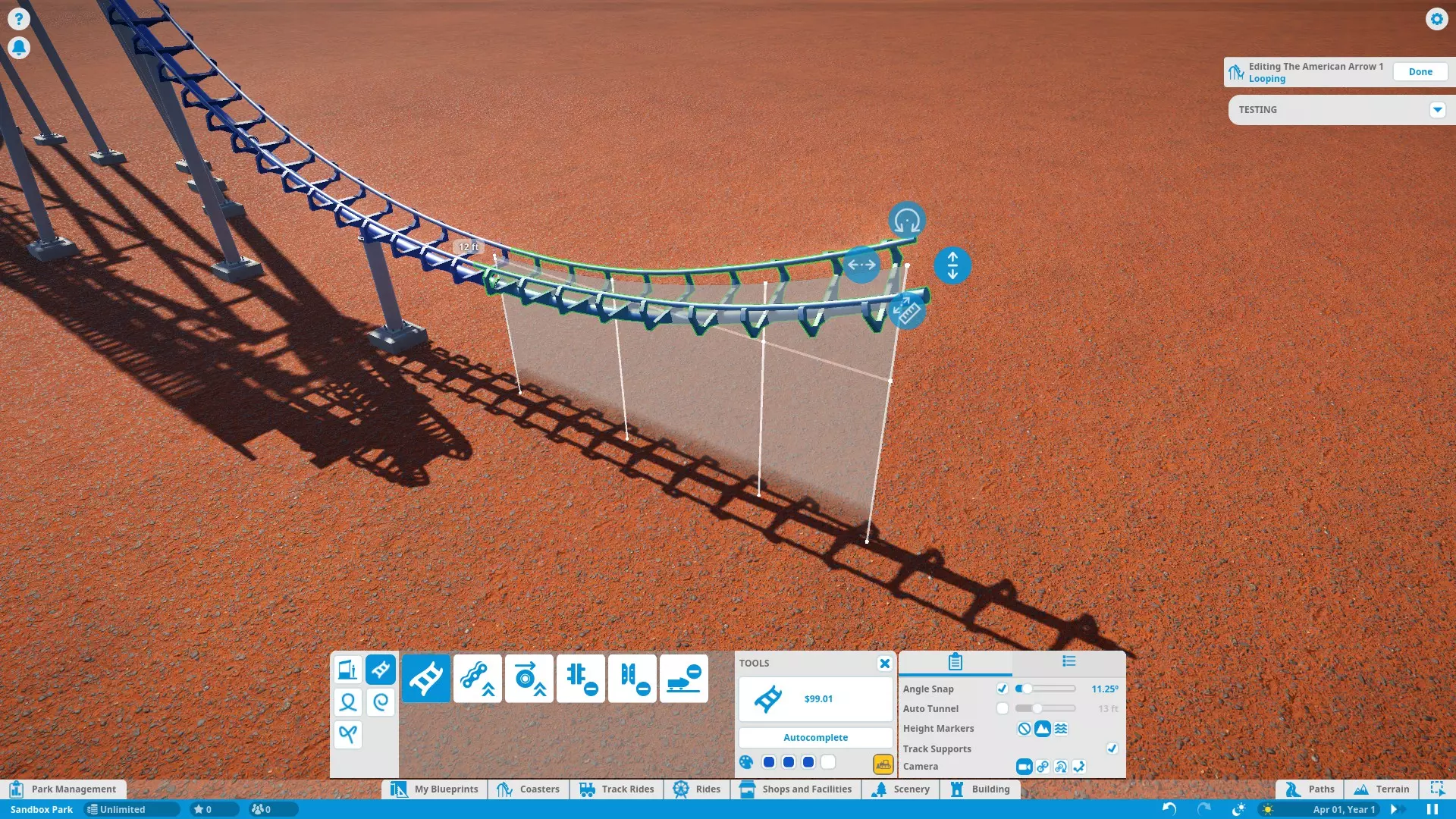 注意: 以蓝色列出的过山车是我所说的【标准过山车】。这类过山车在布局、风格、座位和工程灵活性方面最为通用。如果你是第一次建造过山车,不想尝试太特别或复杂的类型,可以试试这些! 以红色书写的轨道类型是双向过山车。你【不能】将它们建造为典型的完整环线过山车!如果这样做,它们将无法正常运行。 以浅绿色列出的提升类型是弹射选项。 过山车编辑1:编辑器和测试工具 既然你已经选择了过山车类型,就可以开始建造了!过山车编辑器提供了大量工具和选项,让你能够将梦想中的过山车变为现实!要详细解释每一个工具和选项本身就可以单独成为一份指南了。我会尽可能涵盖更多内容,其余部分应该不言自明且非常简单直观。 打开编辑器有两种方法: 1. 从【过山车】选项卡中选择一种轨道类型并放置一个车站。 2. 点击现有的过山车,然后在 ride info 面板中点击【编辑轨道】按钮(它是底部从左数第二个按钮)。