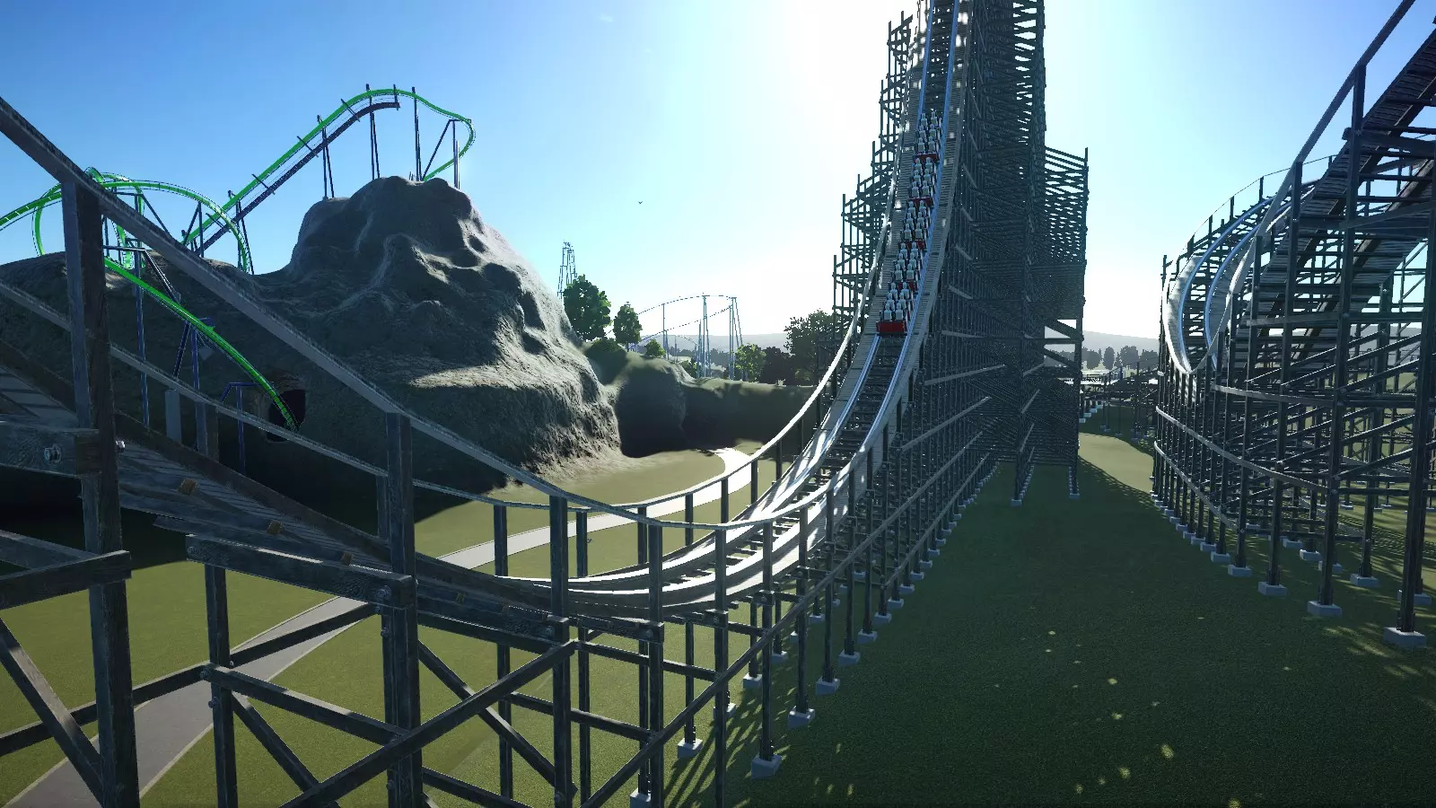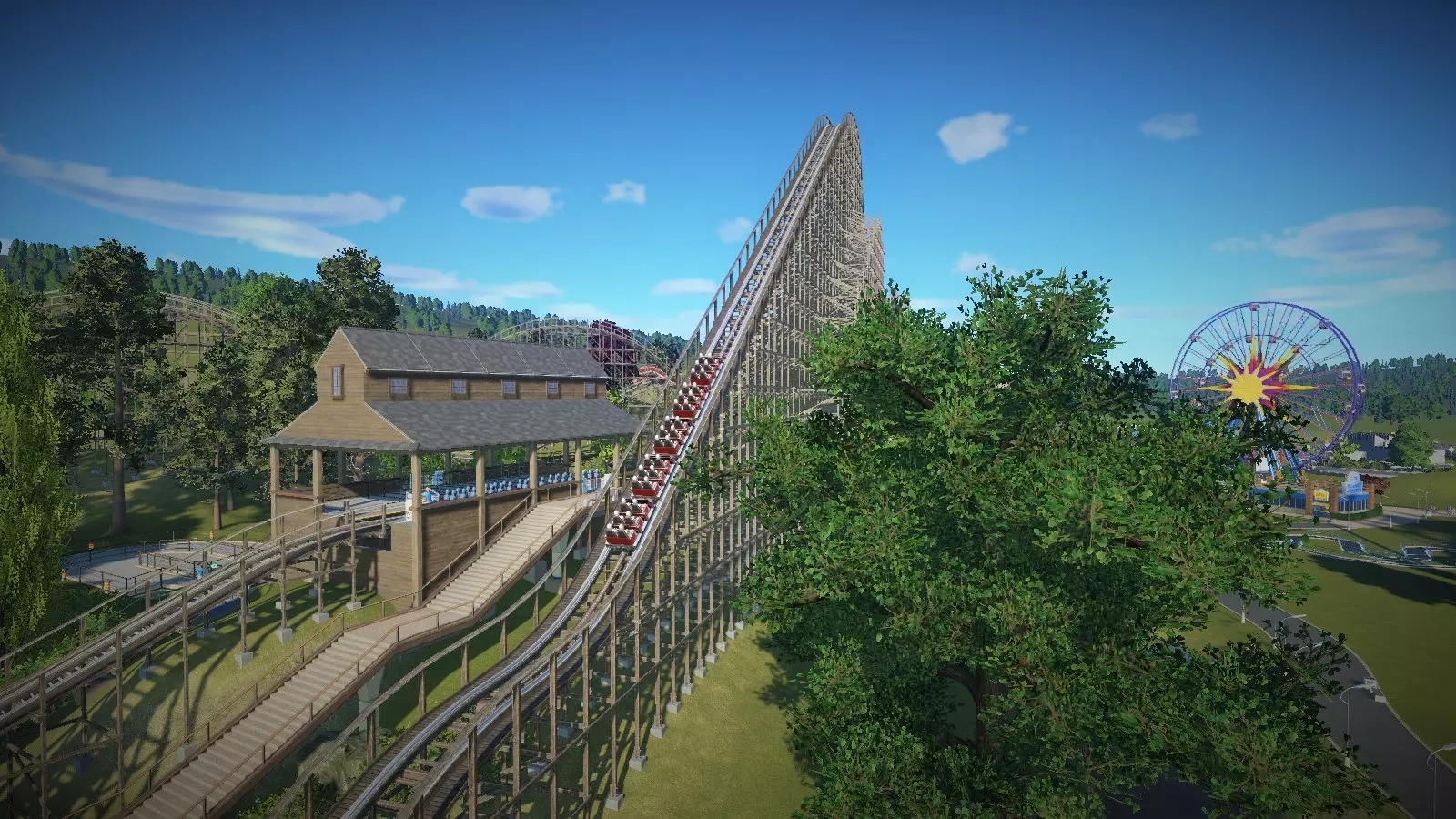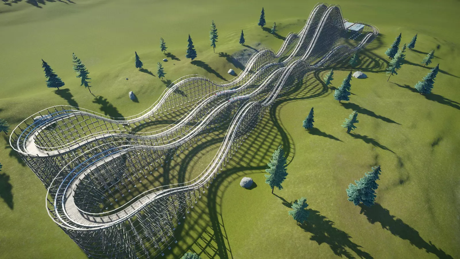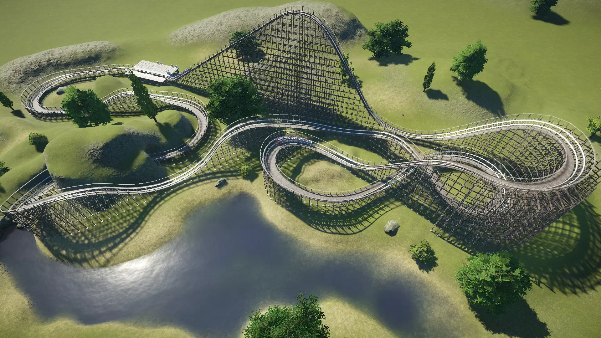 数据统计: - EFN评分:E=6.86,F=4.21,N=1.03 - 最大重力加速度:正向=+4.2G,负向=-0.6G,侧向=2.75G - 最大速度:58英里/小时(93公里/小时) - 最大落差:113英尺(34.4米) - 空中时间次数:5次(总时长2.7秒) 由于木质过山车与其他非翻转过山车有许多共同特点,同时又具备自身独特之处,因此我决定将这两个主题一并探讨。 主要特点(非翻转及通用方面) 布局主要依靠急转弯、陡坡和空中山丘来营造刺激感。这些元素的具体设置和平衡取决于过山车类型。许多不翻转的过山车都具备其他特殊功能(如车厢可自由摆动/旋转、过山车极高/极快、过山车特别平缓等)。它弥补了缺乏翻转的不足。 轨道穿过隧道。隧道(天然或人工建造)和短暂的地下路段是现实生活中过山车的常见元素,用于营造黑暗和/或幽闭的体验。虽然它们似乎不影响EFN评分,但可能有助于提高过山车的景观评分,从而吸引更多游客。(木质轨道) 木质支撑系统。比大多数钢制支撑系统看起来复杂得多。木质支撑的美学效果可以很好地融入公园的某些区域,尤其是西部或海盗主题区域。 木质过山车的摩擦力很大。过山车列车速度下降相当快,在建造/测试阶段经常会在坡道上卡住或倒滑。在我看来,可以说游戏中木质过山车的物理效果有点不太对劲。 正因为如此,游戏中的木质过山车在经历一两次大落差后,通常会保持相对较低的高度(大约在45英尺/14米左右)。 轨道周围全程都设有走道(木质人行道和栏杆)。钢制过山车通常只在链式提升段、制动段等(维修人员需要进入的地方)设有走道。走道在游戏中纯粹是装饰性的,可以通过实用工具设置关闭,但大多数木质过山车都有这些。 景观设计 在讨论布局设计时,我觉得有必要也提一下这个。注意上面的木质过山车是如何与景观融为一体的。这与其说是功能性设计,不如说是一种美学特色,但将景观融入设计确实能让你的作品看起来好得多。在上面的例子中,景观美化是在过山车建造完成后进行的。不过根据你的公园和你设想的过山车类型,先进行景观规划可能会更好,尤其是当过山车是专门为配合景观而设计的时候。但我不建议先放置景物,因为这可能会在你建造过山车时造成阻碍。 在这个案例中,我先建造了湖泊。然后抬高并使轨道之间的区域变得粗糙,让它们不再是完全平坦的。在进行这些操作时,我决定添加隧道(在这款游戏中,即兴发挥的创造力是个不错的特质)。我为地形添加了一些纹理,使其看起来更自然。最后,我还添加了一些树木、灌木和岩石,以小幅提升风景评分。以下是前后对比: