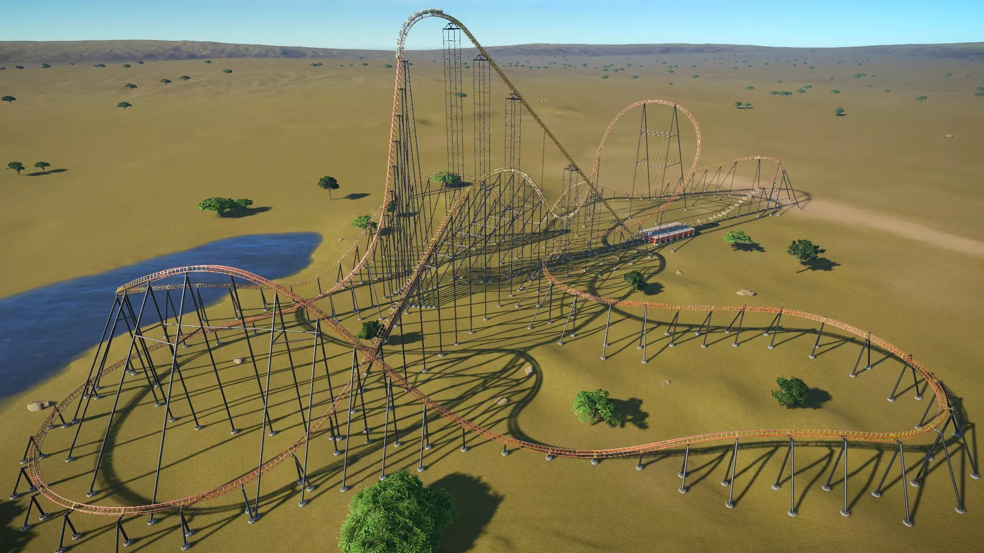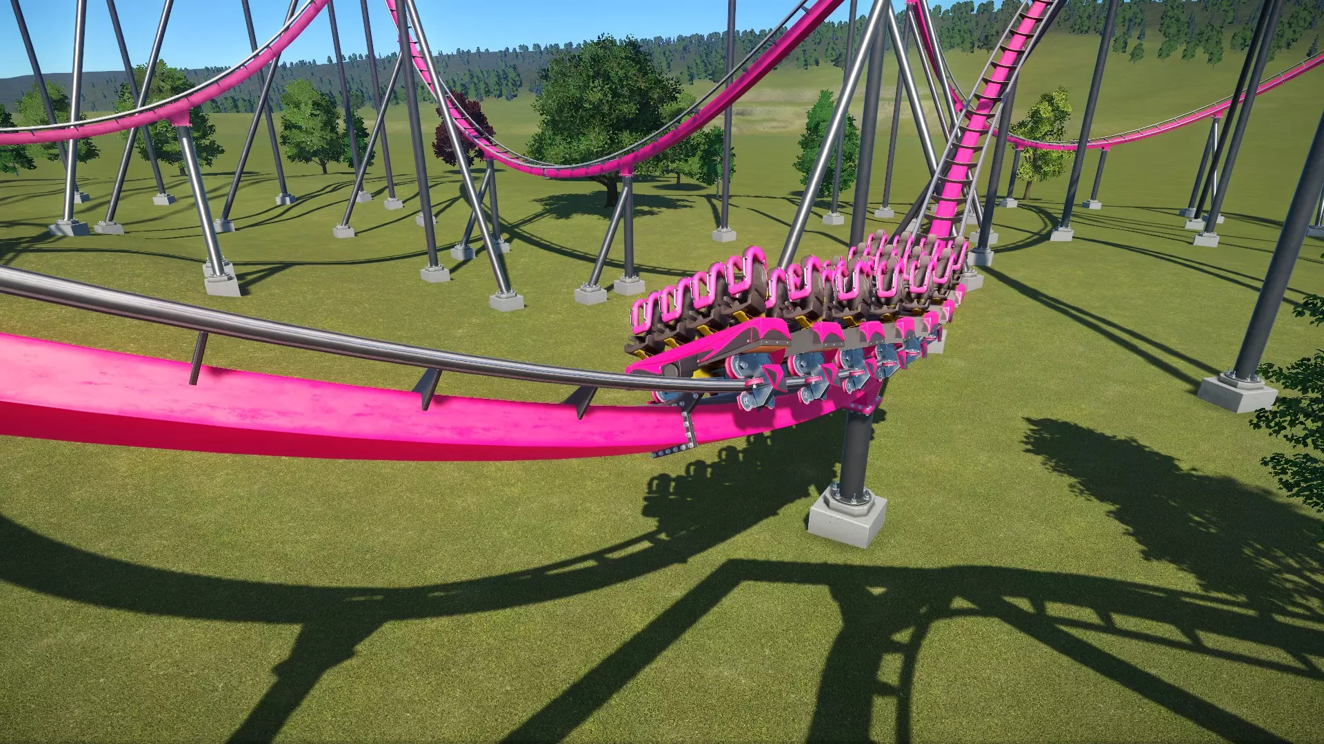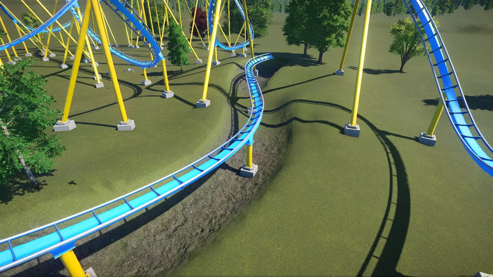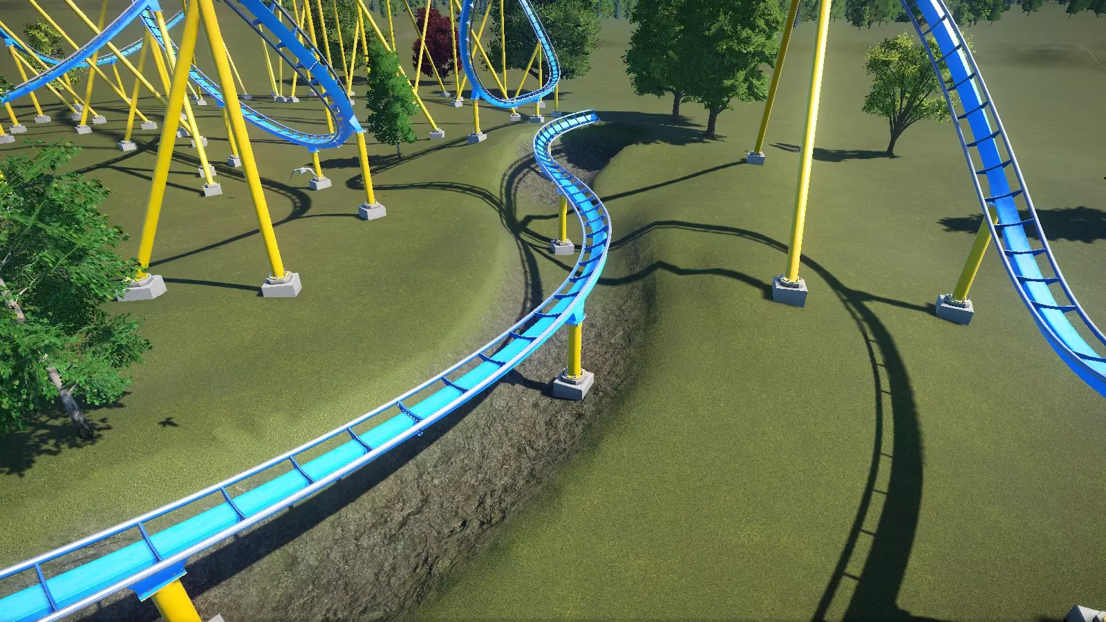 数据统计: - EFN 评级:E=3.79,F=2.64,N=0.34 - 最大重力加速度:正向=+2.1Gs,负向=-1.5Gs,侧向=1.4Gs - 最大速度:34英里/小时(55公里/小时) - 高度:69英尺(21米) - 空中时间计数:0 请注意,虽然轨道会翻转,但摆动的座舱并不 meant to invert。乘客可不想从 ride 里被甩出去!翻转和弯道必须设计得足够大,以防止座舱翻转。此外,过山车不能太快(建议保持在35英里/小时(55公里/小时)以下)。不过,由于座舱是自由摆动的,你可以以非常规的方式倾斜轨道,所以可以尽情发挥创意。 你可能还会注意到,对于这种类型的 ride 来说,负向 G 值有点高。负向 G 值在直线扭转处达到最大值。我认为重力加速度数据是基于过山车本身(看起来像鸟的部分)而非吊舱。所以在这款过山车上,我觉得这里的重力加速度是可以接受的。 旋转型/疯狂老鼠型 我将旋转型和疯狂老鼠型放在一起讨论,因为它们有很多共同点。这类过山车不太注重速度,更多的是让你体验被甩来甩去的感觉。从设计者的角度来看,这类过山车的轨道布局成本低、空间利用率高且结构简单。然而,其较小的尺寸以及缓慢或独特的乘坐体验,导致人们争论它们是否应该被算作真正的“过山车”,还是仅仅是某种美化后的儿童 rides,尤其是疯狂老鼠型过山车。[*工作进行中,待续...*] 特殊布局2:巨型过山车 这些过山车是游戏中体型最大、高度最高、速度最快的过山车!准备好迎接这个挑战吧! 超级过山车/巨型过山车 超级过山车的最高点超过200英尺(60米),设计时速可达75-85英里(120-135公里)。由于其高度和速度,超级过山车拥有大型且平滑的轨道布局,主要由宽阔、大倾角的弯道和大型的失重山丘组成。 巨型过山车是超级过山车的“大哥”,它们有着相似的轨道布局,但最高点超过300英尺(92米),时速超过90英里(145公里)!现实世界中这类过山车数量稀少。 以下是一个巨型过山车的示例,展示了这类“巨兽”轨道的大致样貌: