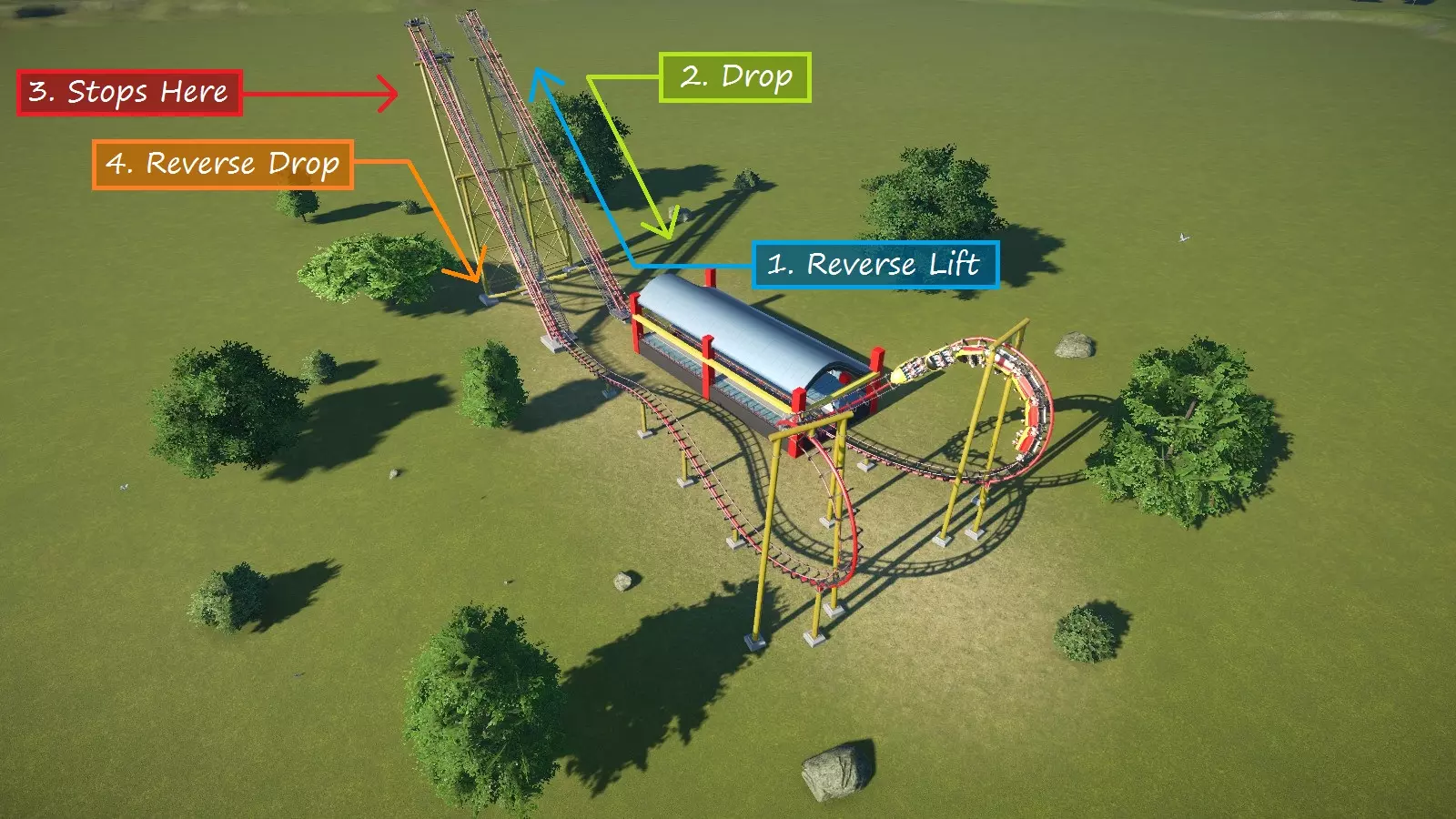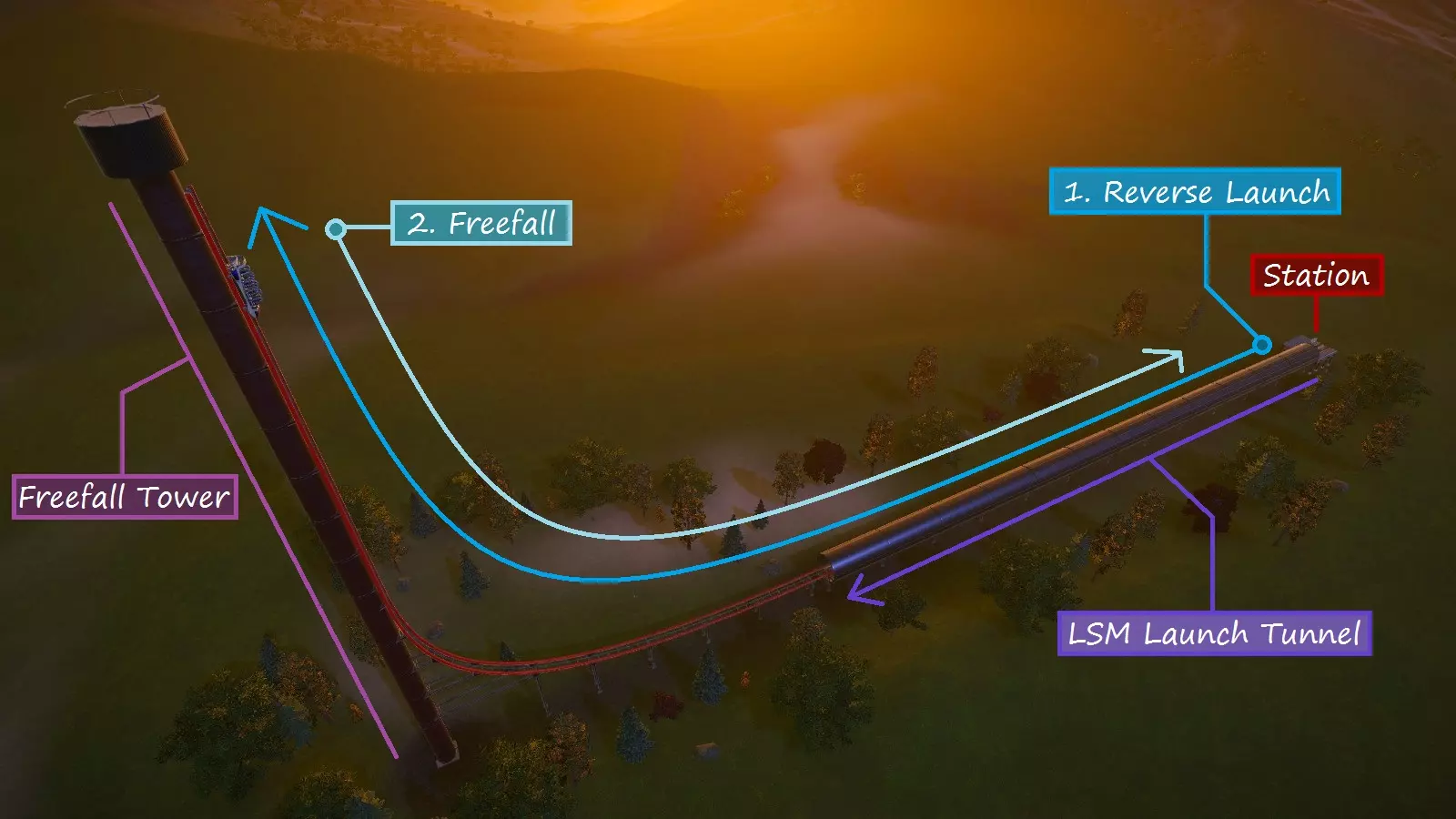 反向发射(下降阶段):反向发射过山车通过LSM发射段(可选择封闭在隧道内)将乘客向后加速,并冲上垂直塔架。随后过山车从塔架自由下落,返回车站。游戏内蓝图名为【冲击之塔】