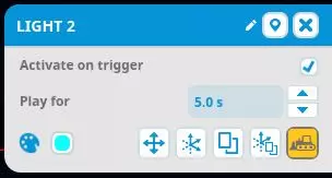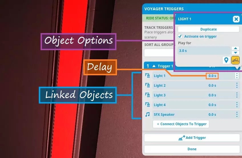 与触发器类似,你可以点击物体名称对其重命名。你也可以点击物体右侧的三个点,来更改物体的激活持续时间、复制物体(使用相同触发器再次激活)或从触发器中移除物体。 添加延迟 现在我们的灯光和扬声器已通过触发器激活。但仍有一个问题:所有灯光会同时亮起。正如我之前提到的,灯光应该是一个接一个地激活。物体名称右侧是延迟值。你可以设置该物体从触发器激活开始的延迟时间(以秒为单位)。在这个示例中,每盏灯的延迟时间应比前一盏灯长0.3秒,因此延迟值分别为0.3秒、0.6秒、0.9秒和1.2秒。由于该文本未涉及游戏相关内容,且无需要汉化的非简体中文信息,按照规则直接处理为: 扬声器不应有延迟,因为我希望它能立即播放声音。 现在你已完成操作!