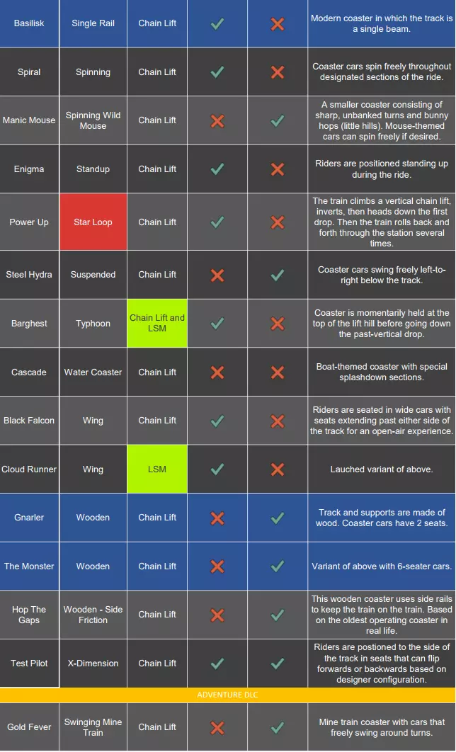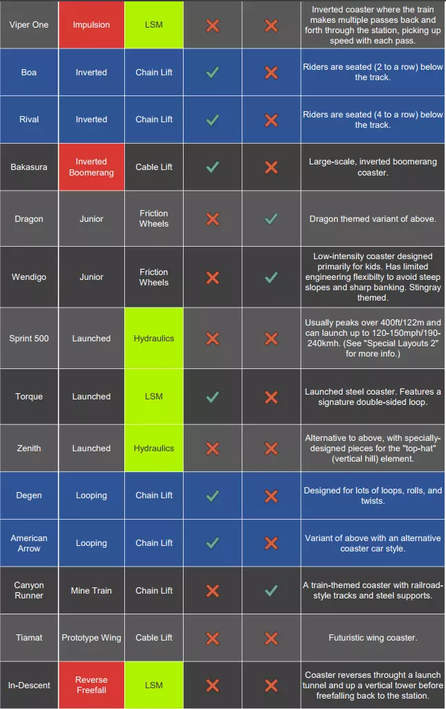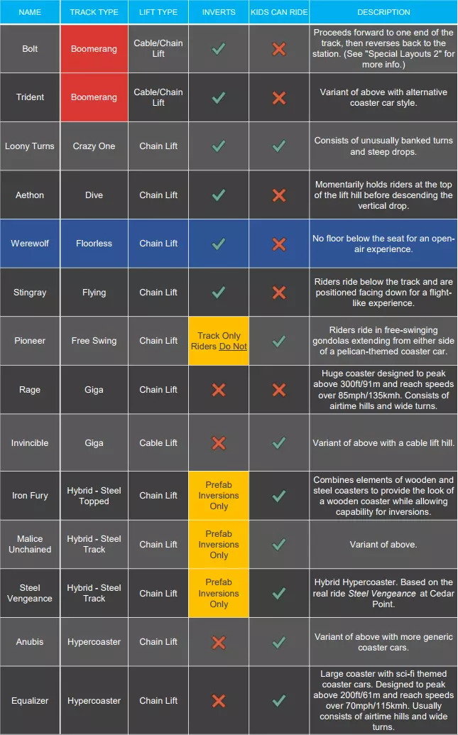 你决定要为自己的公园添加一个新过山车。快速查看地形后,你找到了一个不错的位置。打开【过山车】选项卡,看着眼前的各种选择……接下来该怎么做呢?不同的轨道类型适用于不同的布局方案。你需要问自己几个问题: 我能负担得起哪种类型的过山车?(在沙盒模式中此问题无关) 这个过山车的目标客群是哪些人? 我希望这个过山车有多大?我想让它占用多少空间? 我希望这个过山车与地形/ scenery 产生互动吗? 我想要哪种座位位置(轨道上方、悬挂式、翼乘式、飞行式等)? 在游戏中,你可以将鼠标悬停在轨道类型上,查看其基本信息。不过如果你想快速了解一下,这里是游戏中目前42种过山车类型的完整列表,以及每种类型你需要知道的基本信息: